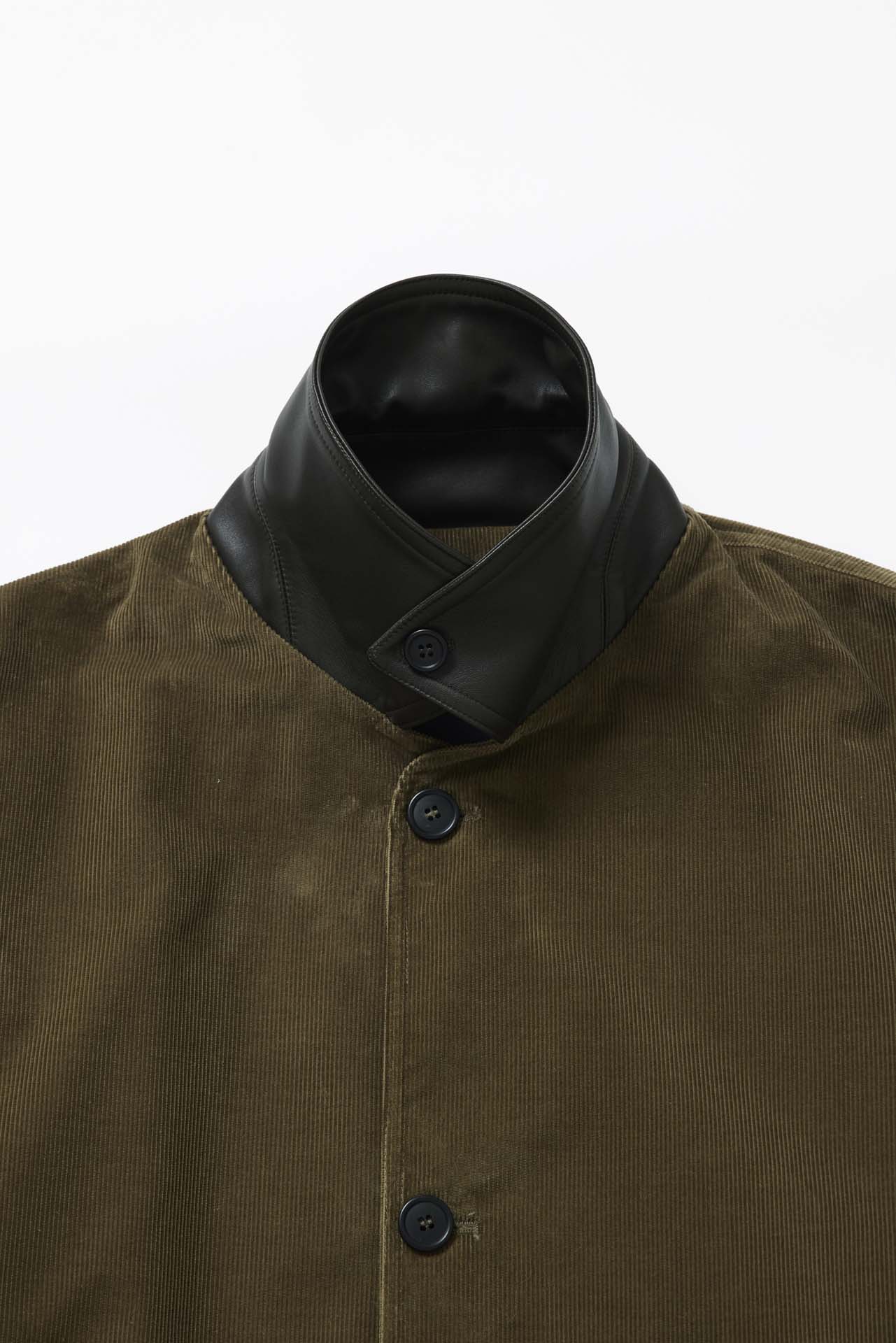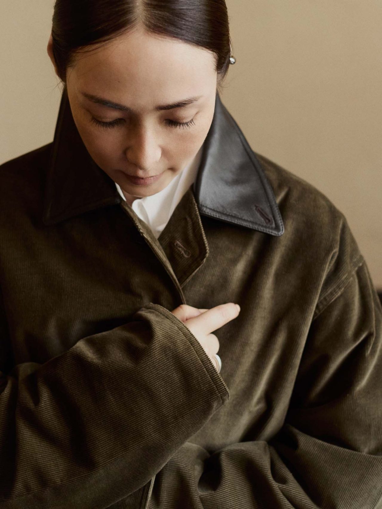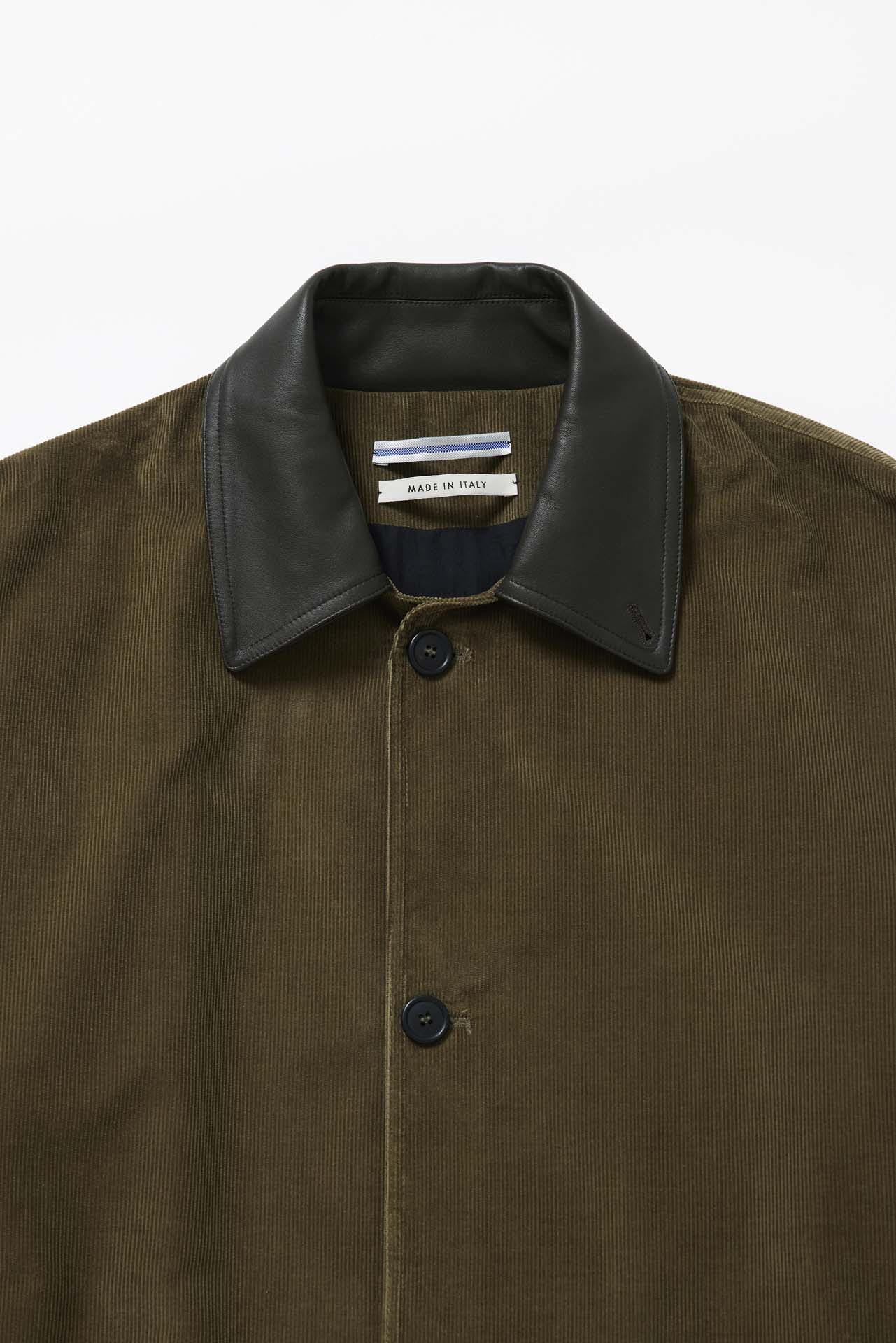 BIOTOP のために制作された今回のブルゾンは、Cristina らしいクラシカルなシルエットをベースに、襟元に配されたレザーが程よいアクセントに。深みのあるカーキのコーデュロイと、ダークブラウンのホースレザーを組み合わせ、季節の空気を纏うような仕上がりとなった。