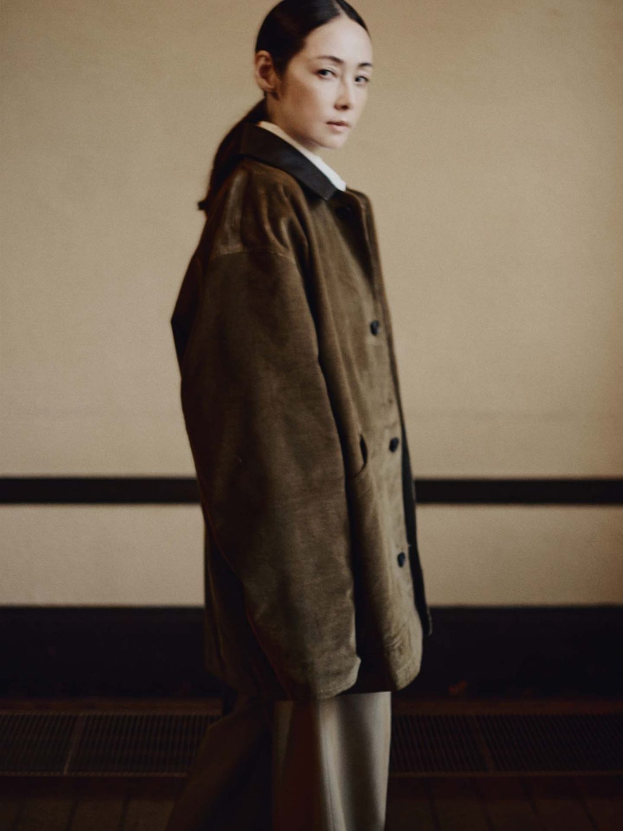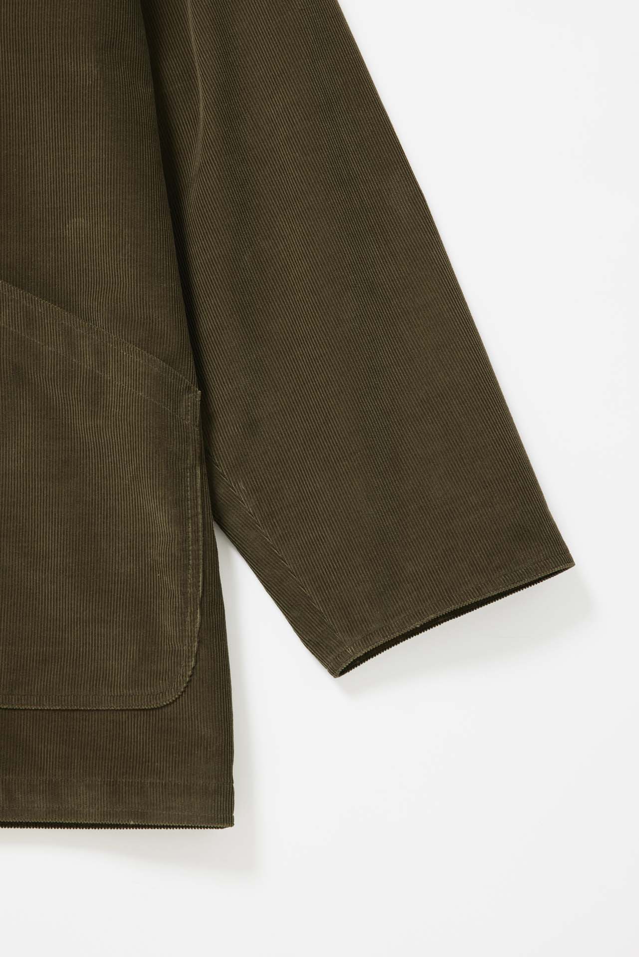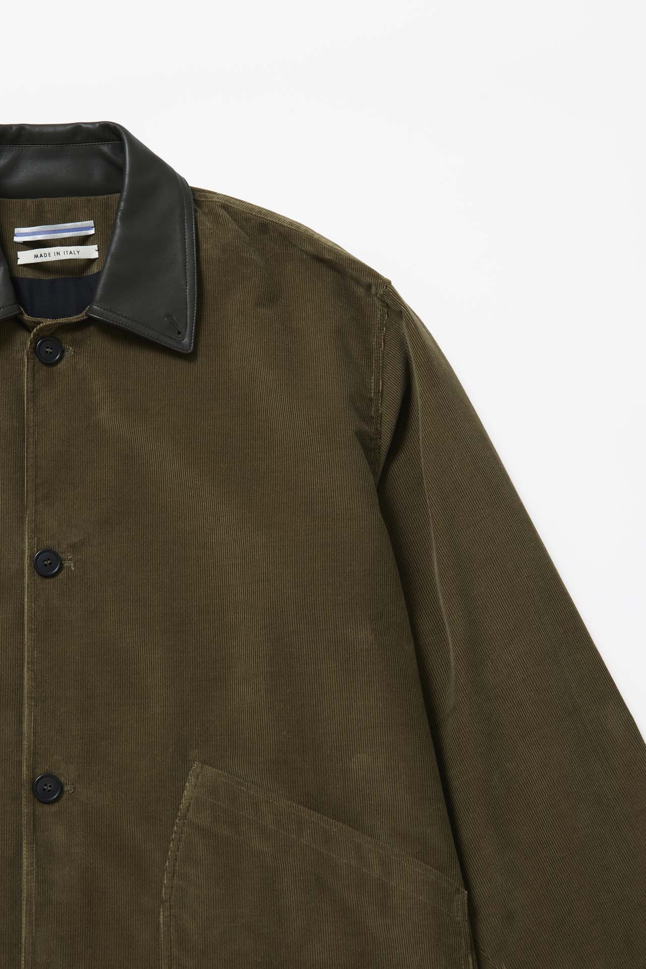 BIOTOP のために制作された今回のブルゾンは、Cristina らしいクラシカルなシルエットをベースに、襟元に配されたレザーが程よいアクセントに。深みのあるカーキのコーデュロイと、ダークブラウンのホースレザーを組み合わせ、季節の空気を纏うような仕上がりとなった。