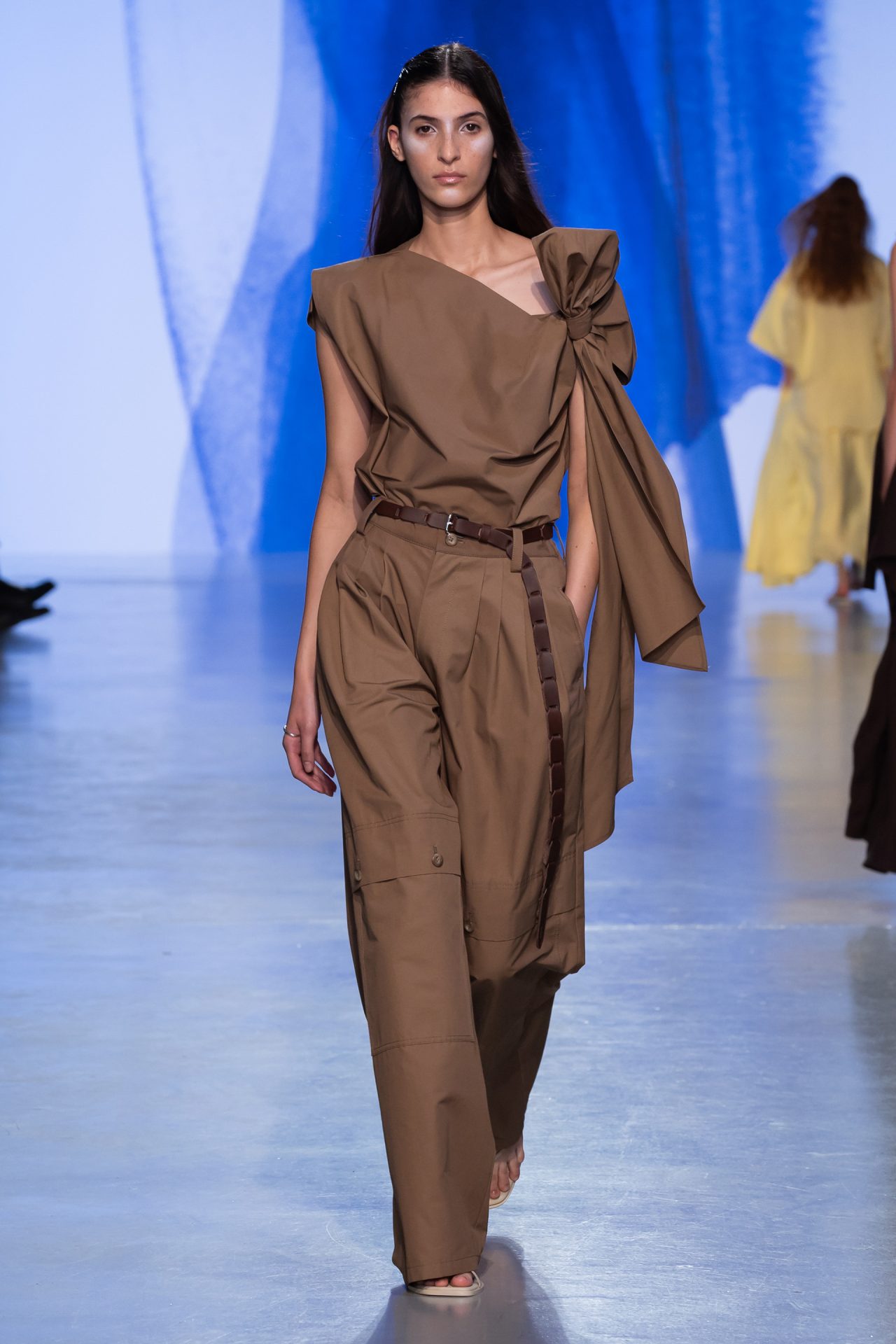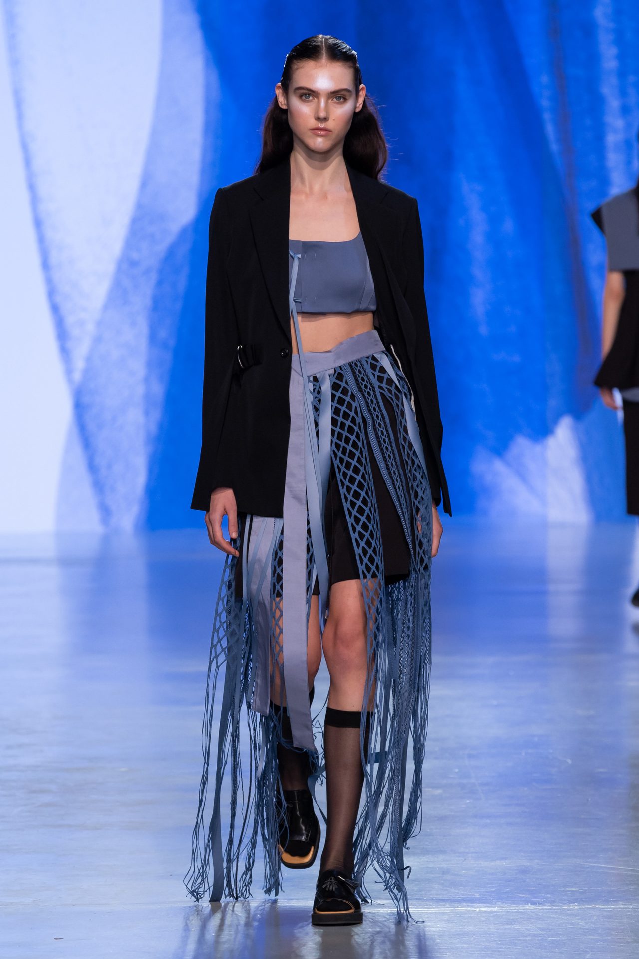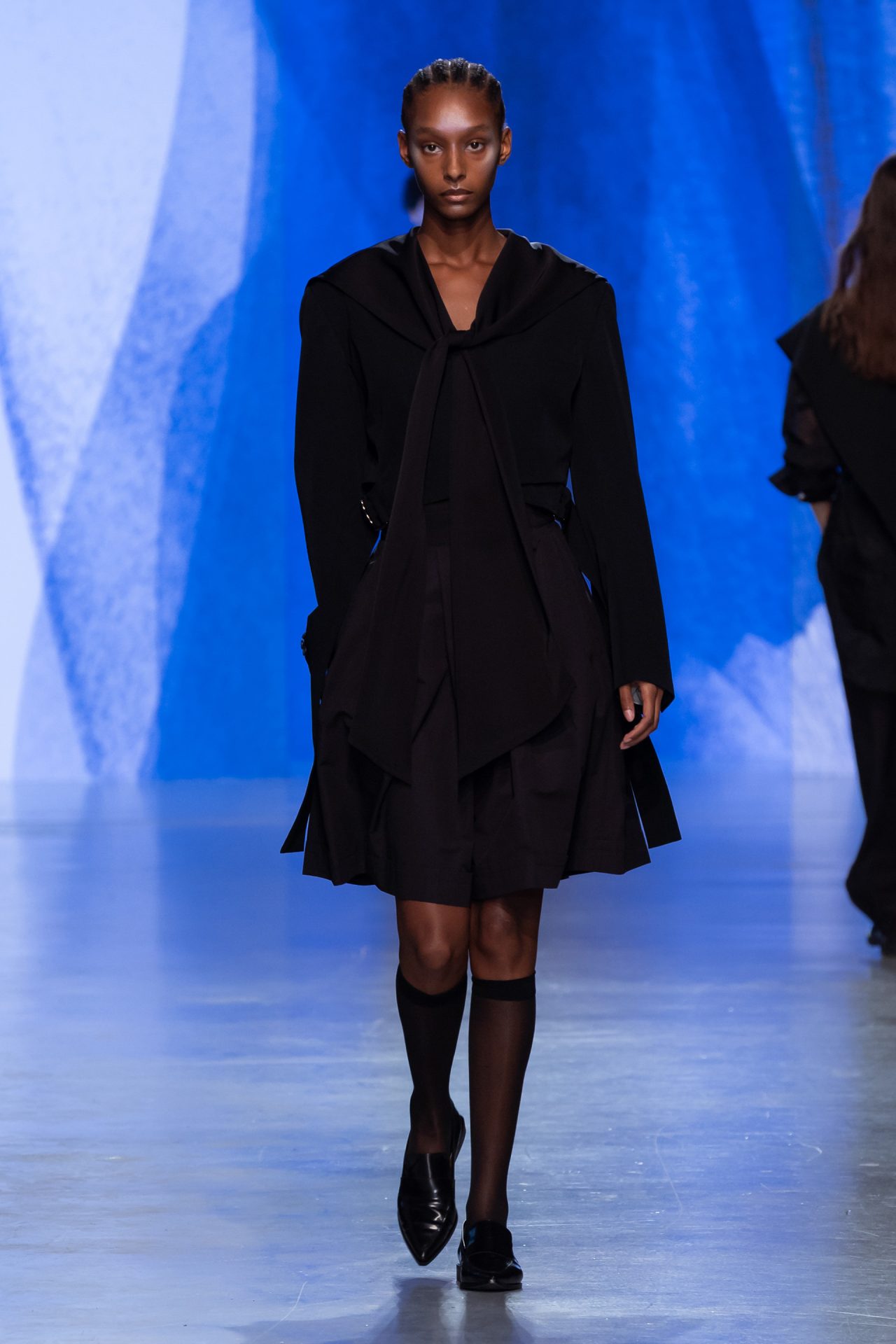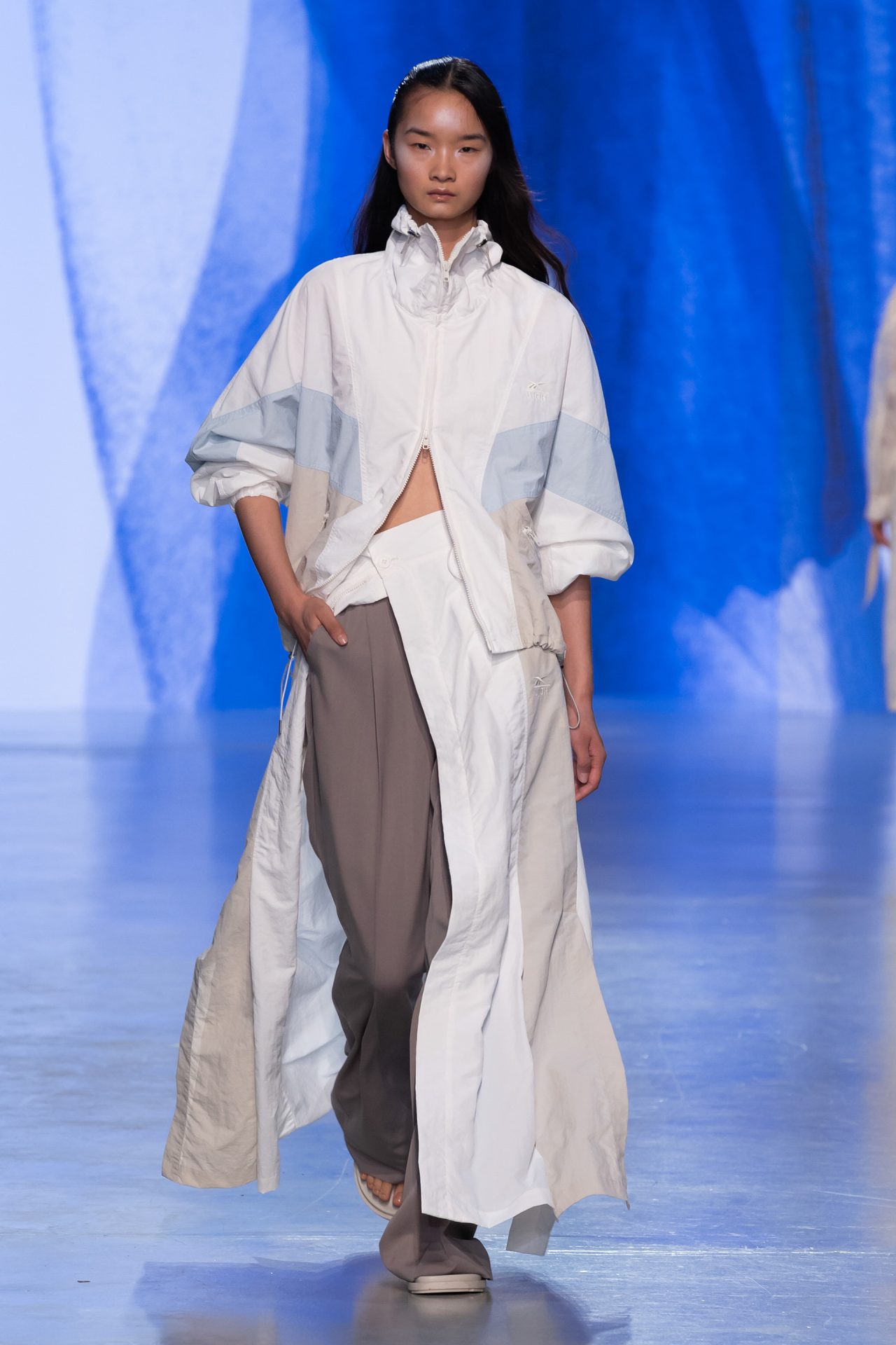 パタンナーとして活躍していたデザイナーの西崎暢が2009年に立ち上げた UJOH による最新コレクションは、Reebok (リーボック) との2回目となるコラボレーションを披露。ジャケットやパンツ、ドレスにはスポーツの要素がさりげなく取り入れられ、 UJOH ならではのカッティングと構築的なシルエットによって、洗練されたラインが生み出された。シックで都会的なニュートラルカラーがコレクション全体を引き締め、動きとエレガンスが共存するデザインが際立つ。