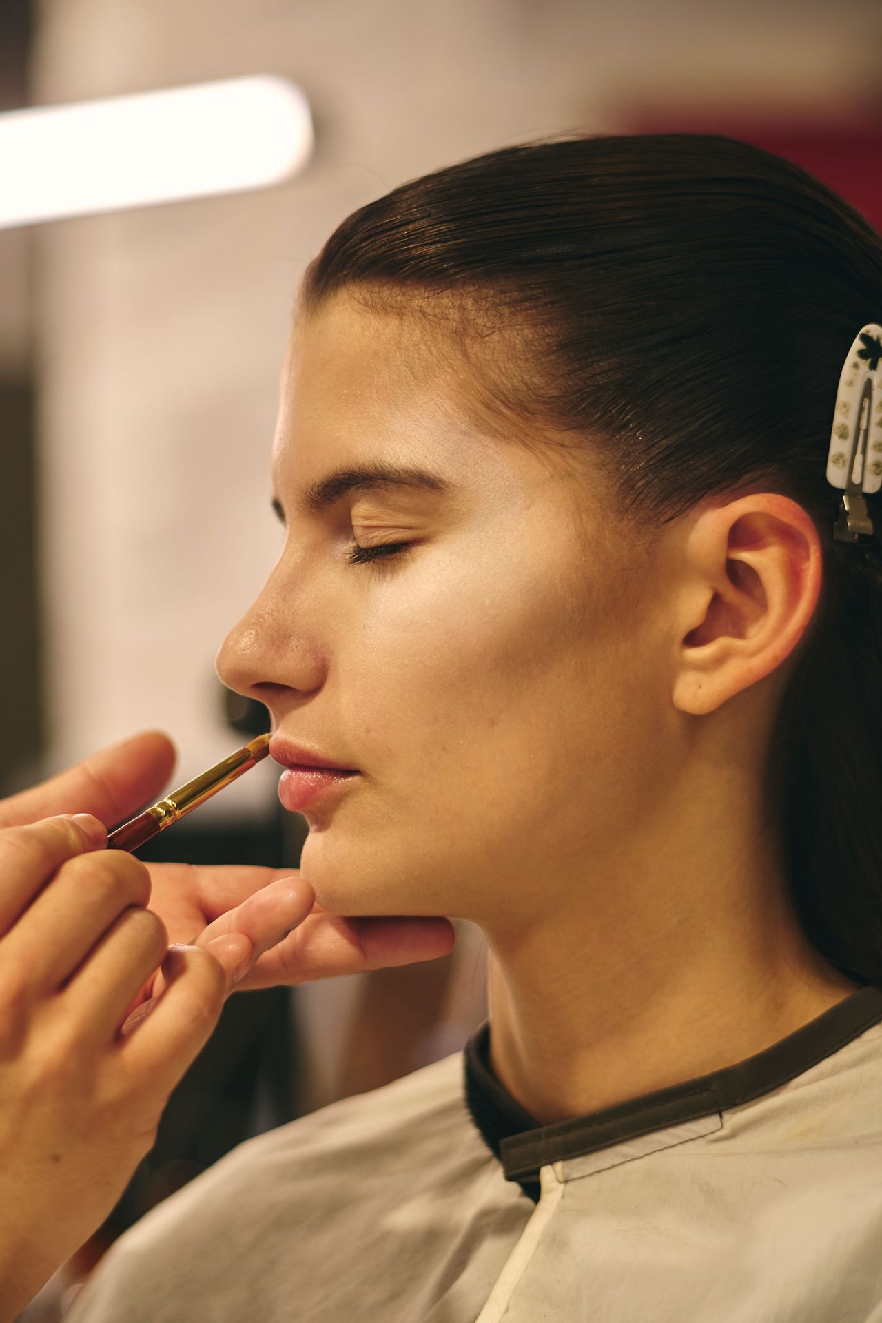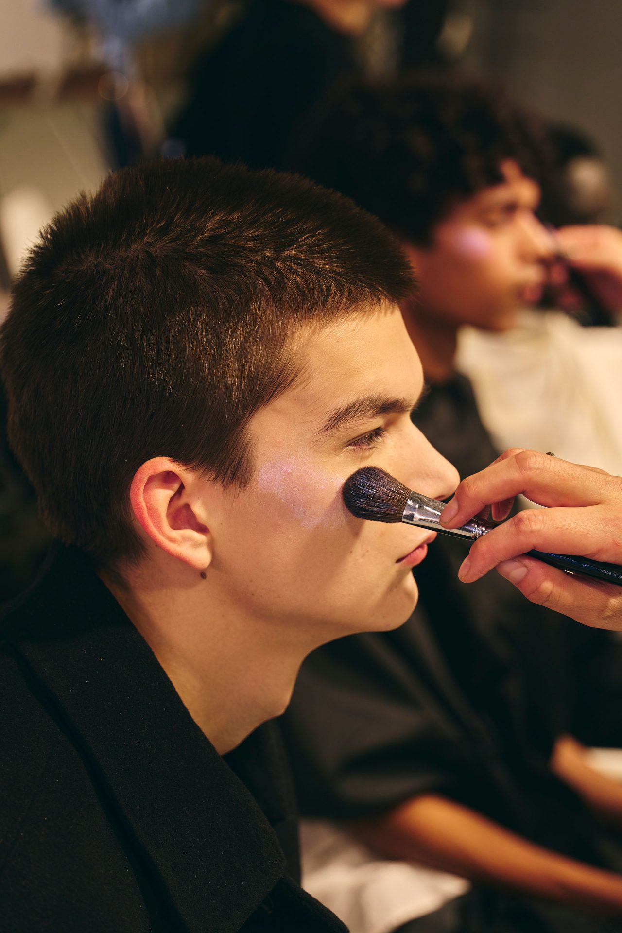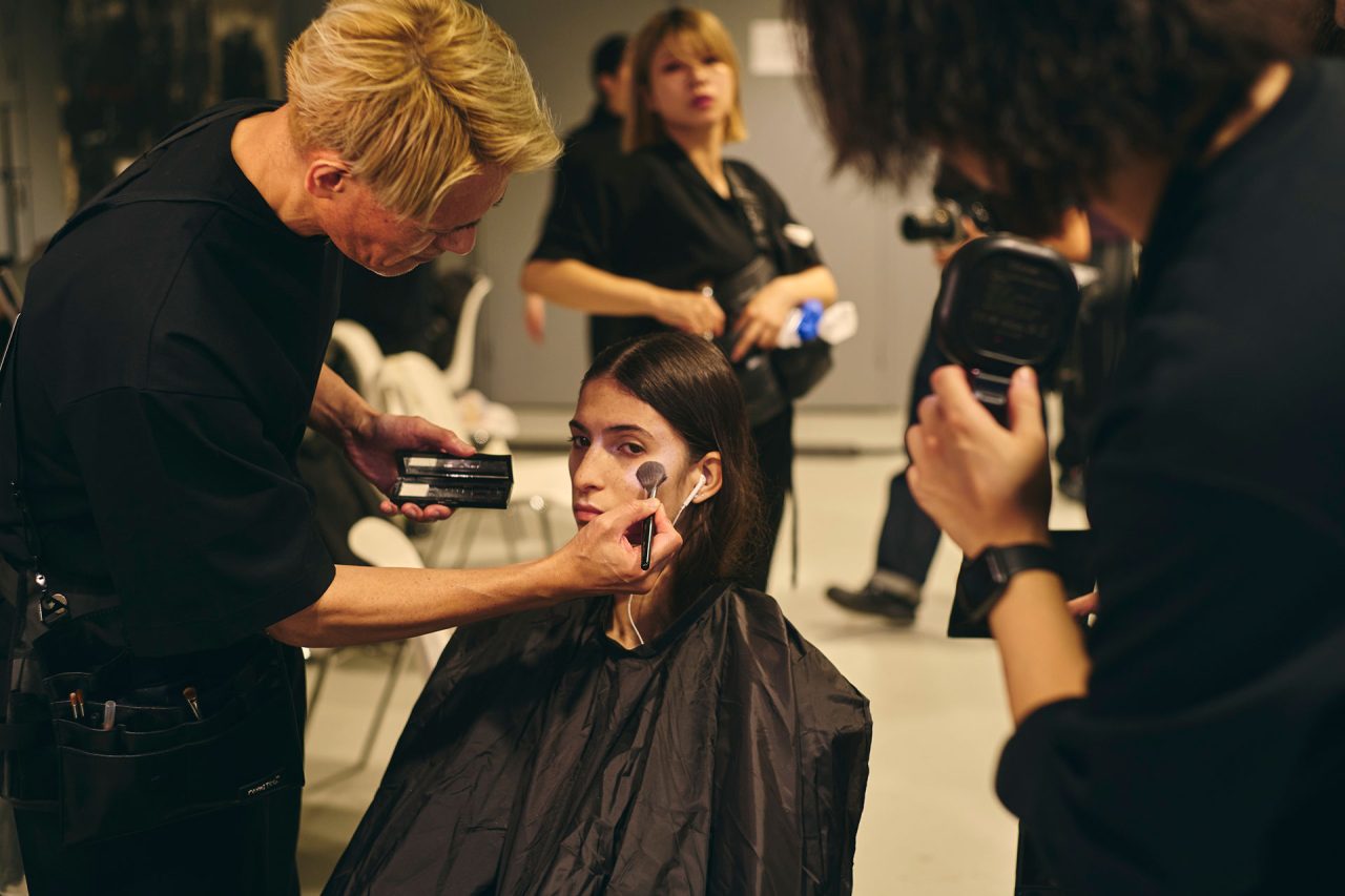 その世界観をメイクで支えたのが、shu uemura。インターナショナル アーティスティック ディレクターの uchiide (ウチイデ) 率いるアトリエ アーティスト チームが、ショーのテーマに合わせたメイクアップを手がけた。軽やかなソフトマット肌をベースに、頬や鼻筋、唇の上、顎先などにブルーのハイライターをポイント的に効かせる「クールフロストスキン メイク」を採用。薄づきで自然なツヤ感を演出し、フレッシュで都会的な印象を与えつつ、モデルたちの表情に躍動感を添え、ルック全体の完成度を高めた。