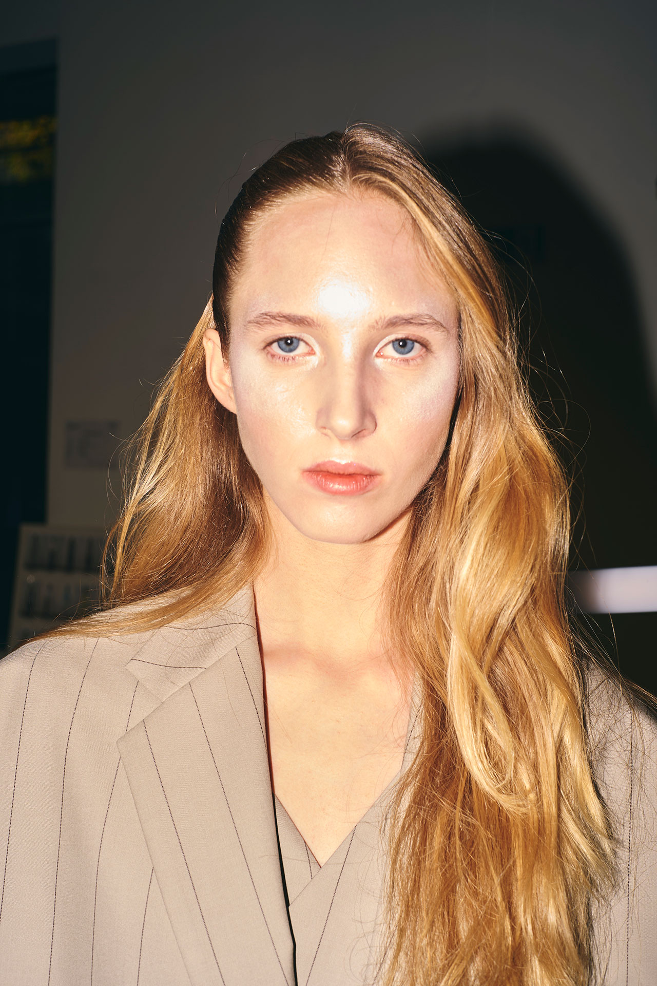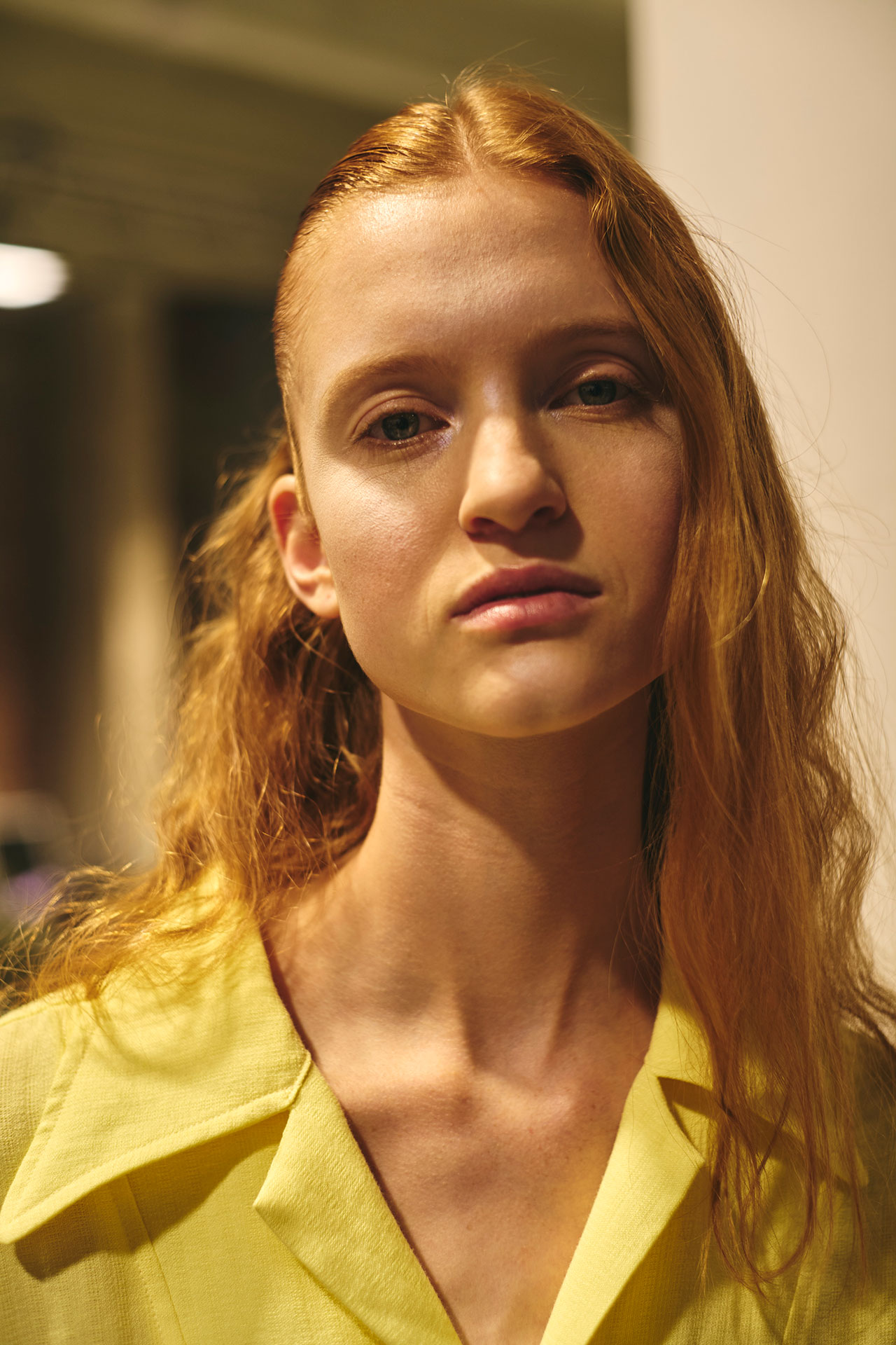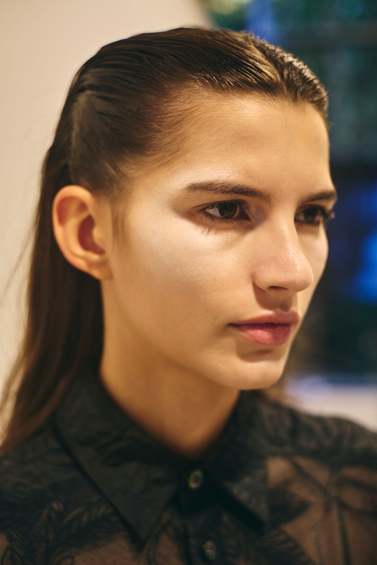その世界観をメイクで支えたのが、shu uemura。インターナショナル アーティスティック ディレクターの uchiide (ウチイデ) 率いるアトリエ アーティスト チームが、ショーのテーマに合わせたメイクアップを手がけた。軽やかなソフトマット肌をベースに、頬や鼻筋、唇の上、顎先などにブルーのハイライターをポイント的に効かせる「クールフロストスキン メイク」を採用。薄づきで自然なツヤ感を演出し、フレッシュで都会的な印象を与えつつ、モデルたちの表情に躍動感を添え、ルック全体の完成度を高めた。