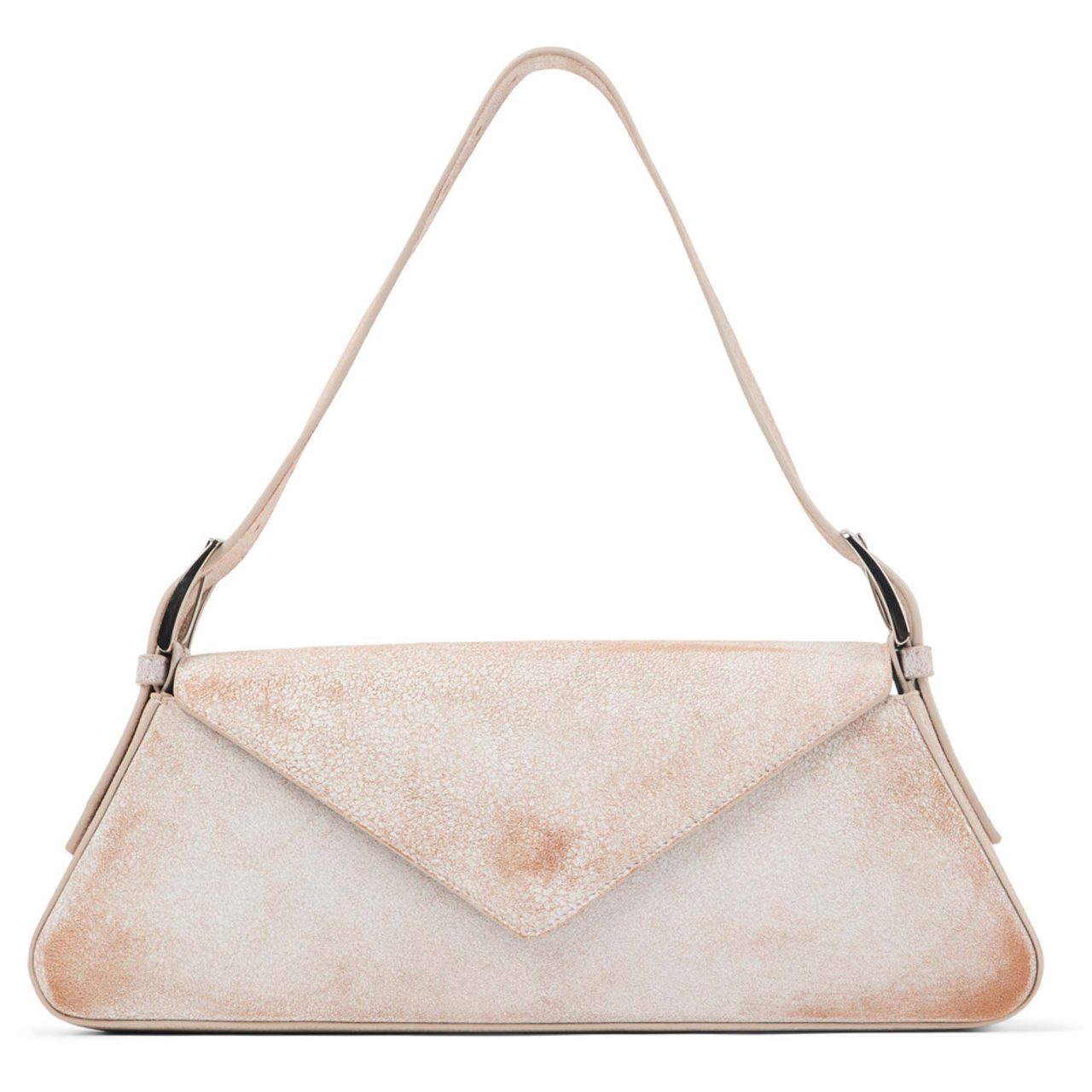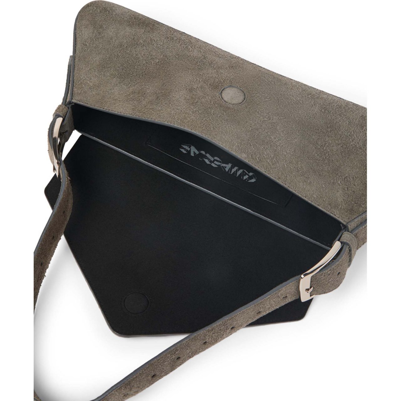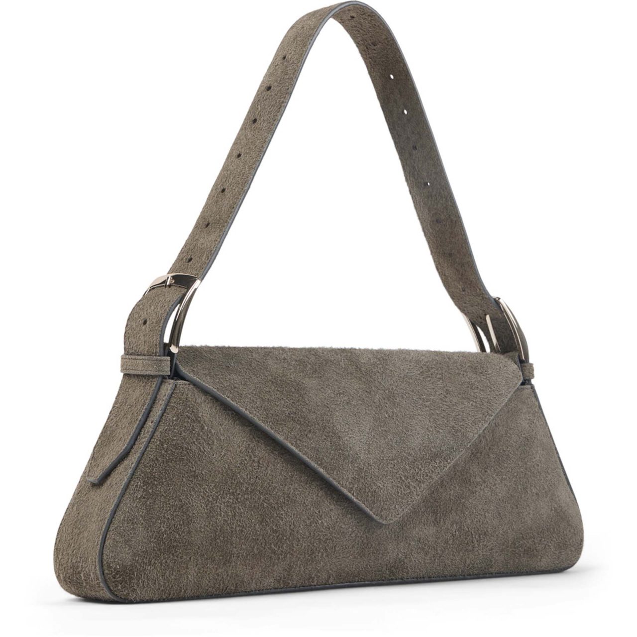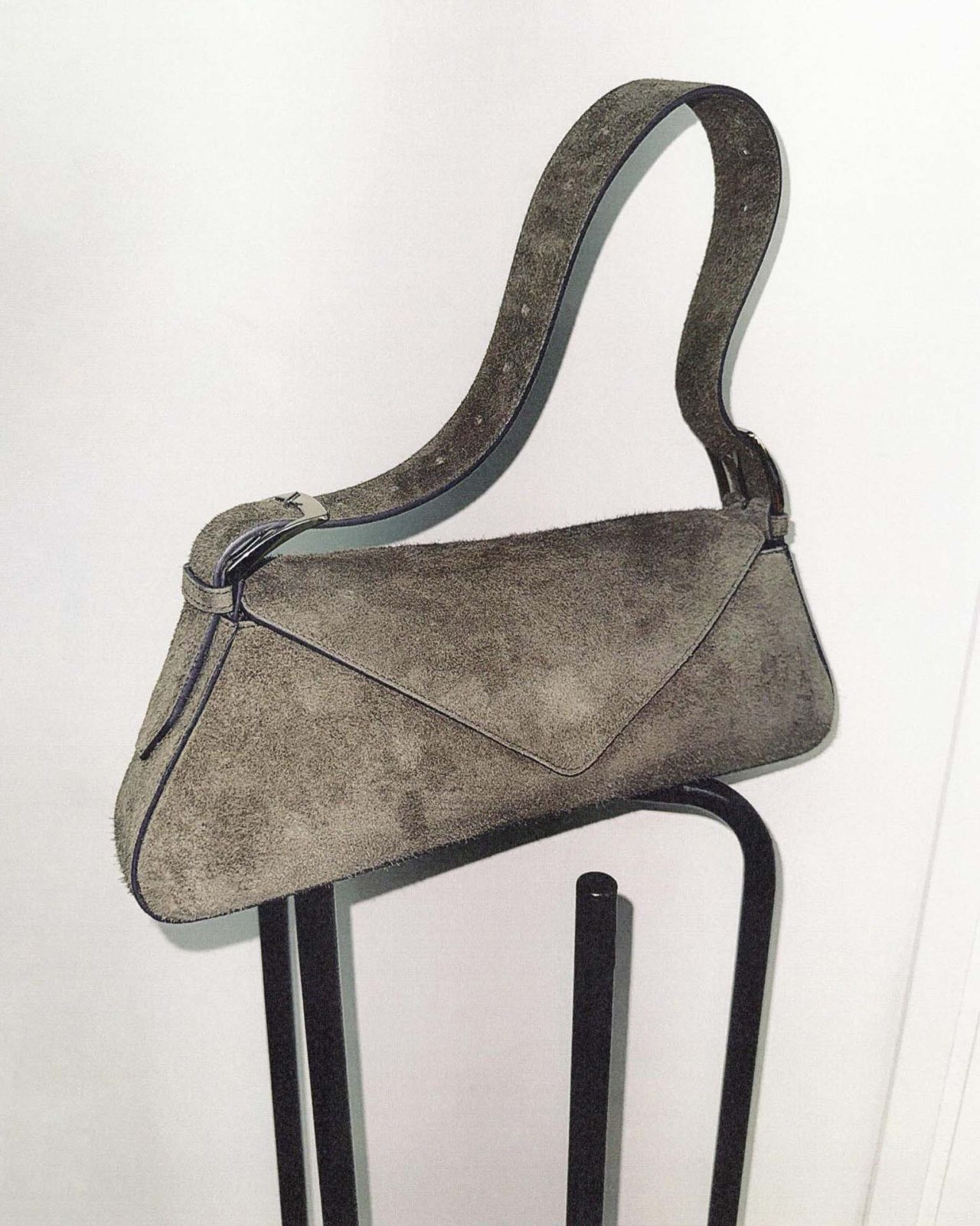 「手紙」の意味を持つ「Kirje」は、封筒を思わせる大胆なデザインが特徴。両サイドのバックルでストラップの長さを調節でき、ショルダーでもハンドルバッグとしても使える2WAY仕様がポイント。ダメージ加工を施したスエード素材は、いつものコーディネートにさりげない華を添えてくれる。