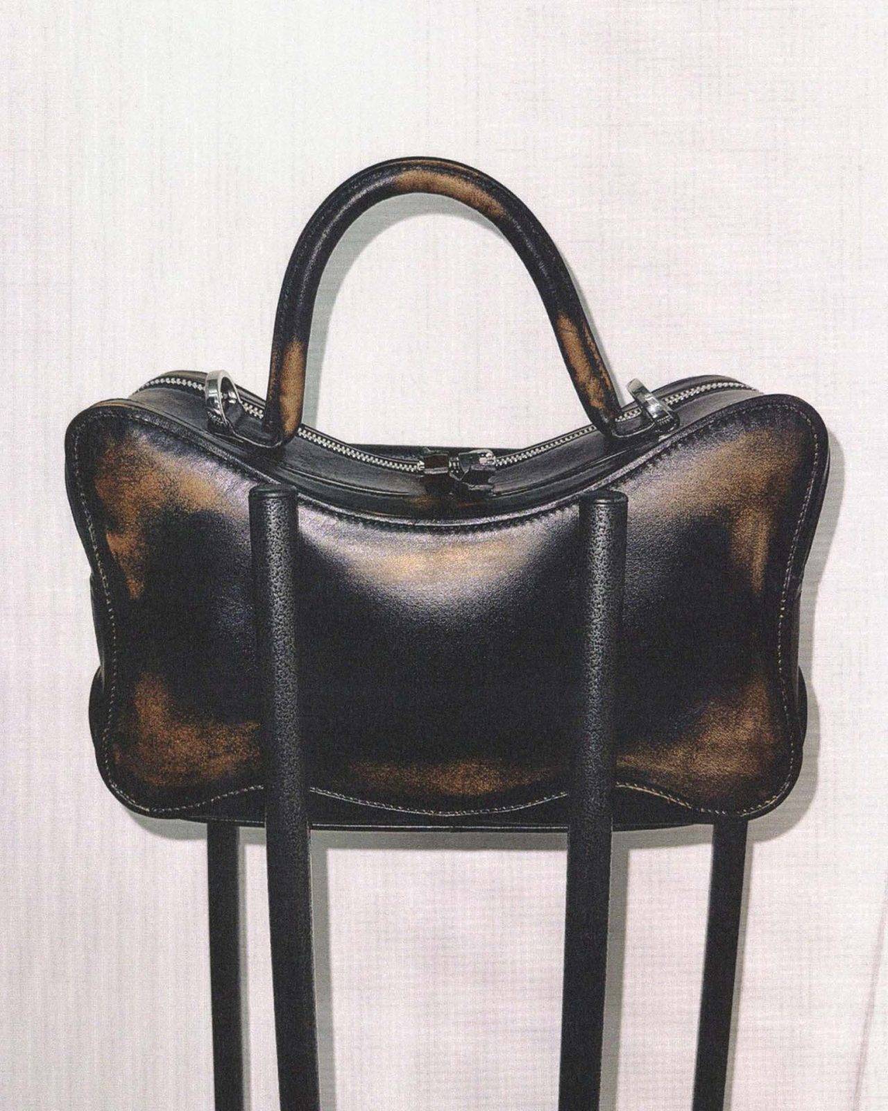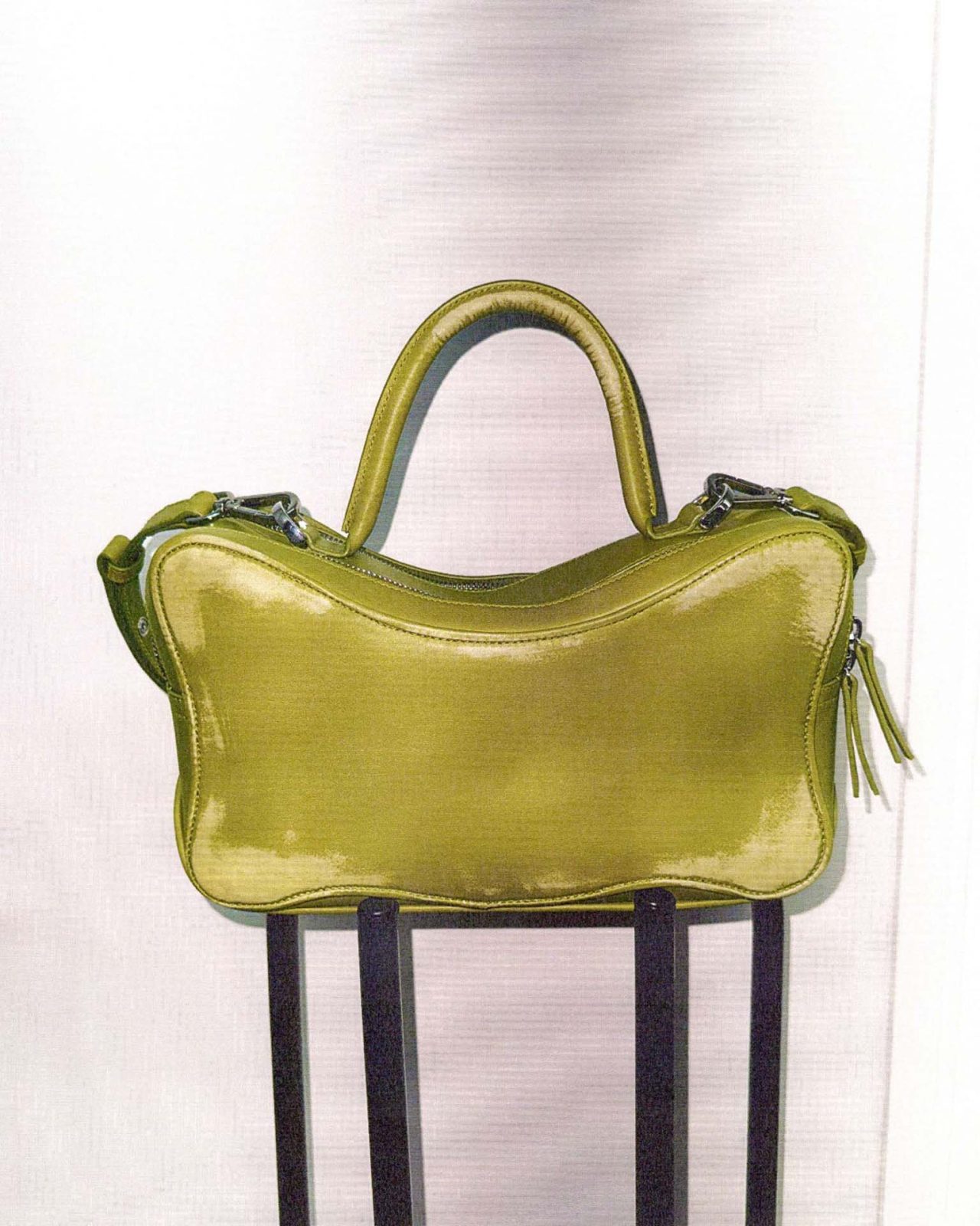 「Lunssi」は、フィンランド語で「ランチ」を意味する名の通り、まるでランチボックスのような形のトップハンドルバッグだ。柔らかく歪んだ立方体のフォルムに、パイピングの縁取り、さらに表面のレザーにはハンドブラッシュ加工が施され、一つとして同じものがない、唯一無二の仕上がりとなっている。カラーは、ブラックとピスタチオグリーンの2色展開。モノトーンのウェアやダメージ加工のアイテムとのスタイリングがおすすめだ。