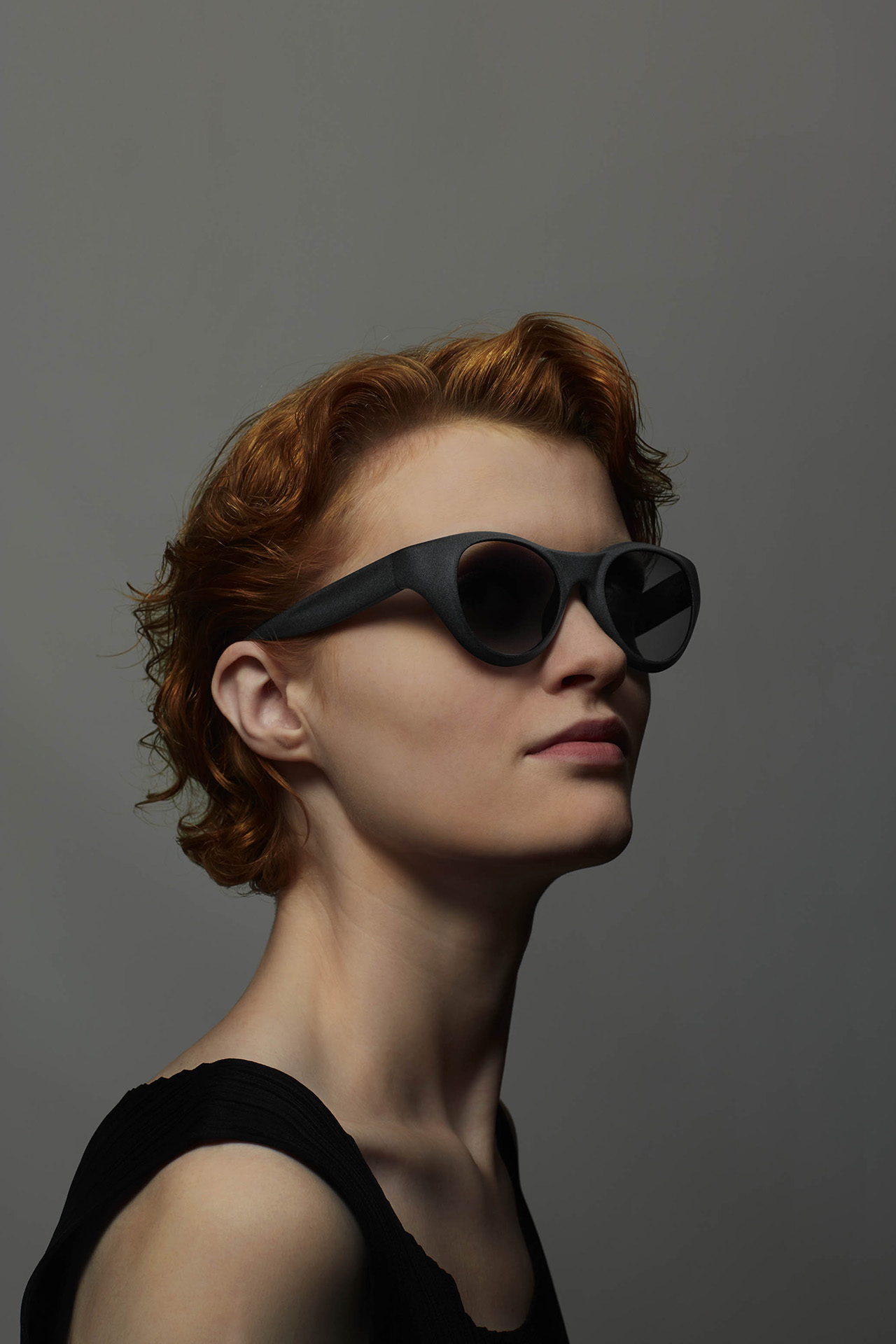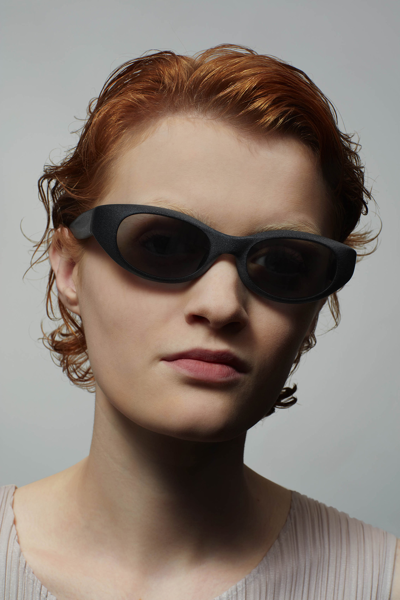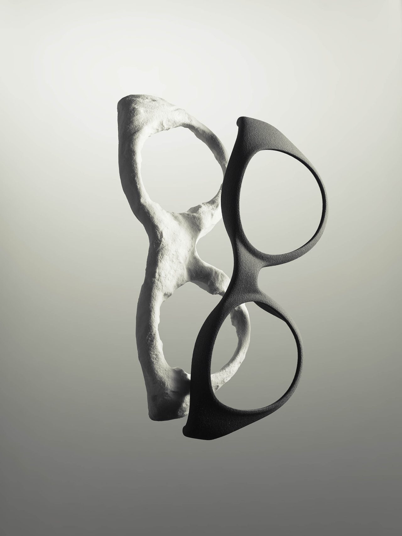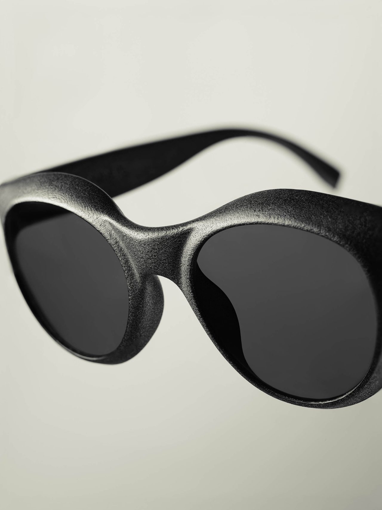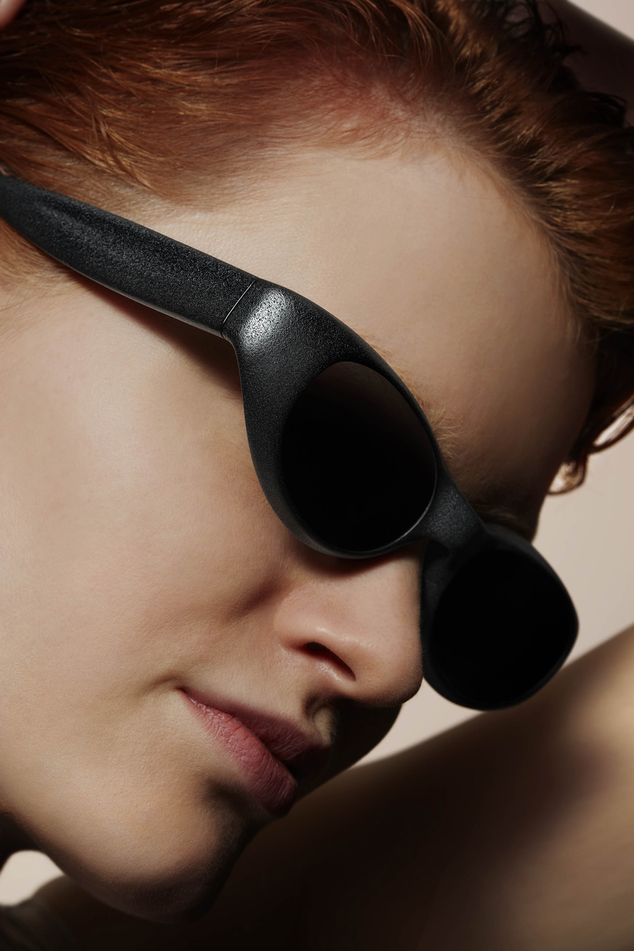 小さな粒子の集合から生まれた ISSEY MIYAKE EYES の新モデル「GRIT」。流れるような曲線と有機的なフォルムは、凹凸を持ちながらも艶やかな質感を放ち、顔に吸い付くように寄り添い、まるで身体の一部のように感じられる。その造形表現は、3Dプリントという先端技術により実現した。