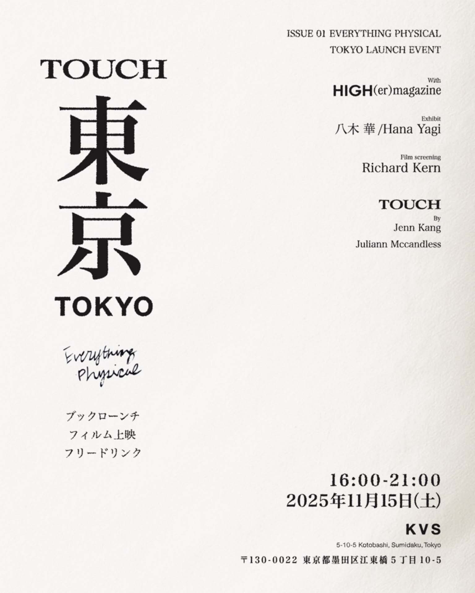 国際的に活躍するアーティスト Jenn Kang (ジェン・カン) により設立された TOUCH Publishing が、創刊号「Everythung Physical」を発売。さらに、対話の場をつくることをコンセプトに創刊されたインディペントマガジン『HIGH(er) magazine』とのコラボレーションイベントを11月15日(土)に開催する。ダンスフィルムの特別上映や衣装展示、オリジナルアイテムの販売など、見どころ満載のイベントとなる。