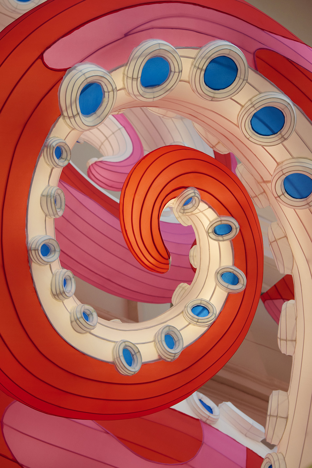 今回のインスタレーションの中心となるのは、高さ8メートルに及ぶタコの巨大彫刻。中国のランタンから着想を得た8本の触手が展示空間を包み込み、来場者を村上隆の世界へと誘う。アーチ状のエントランスには、彼が手がけたスケッチ群が展示され、制作プロセスが垣間見える構成となった。会場には「スマイリング・フラワー」や「DOB 君」、「スーパーフラット・パンダ」など、村上隆を象徴するキャラクターが随所に登場し、バッグの展示と対話するように配置された。