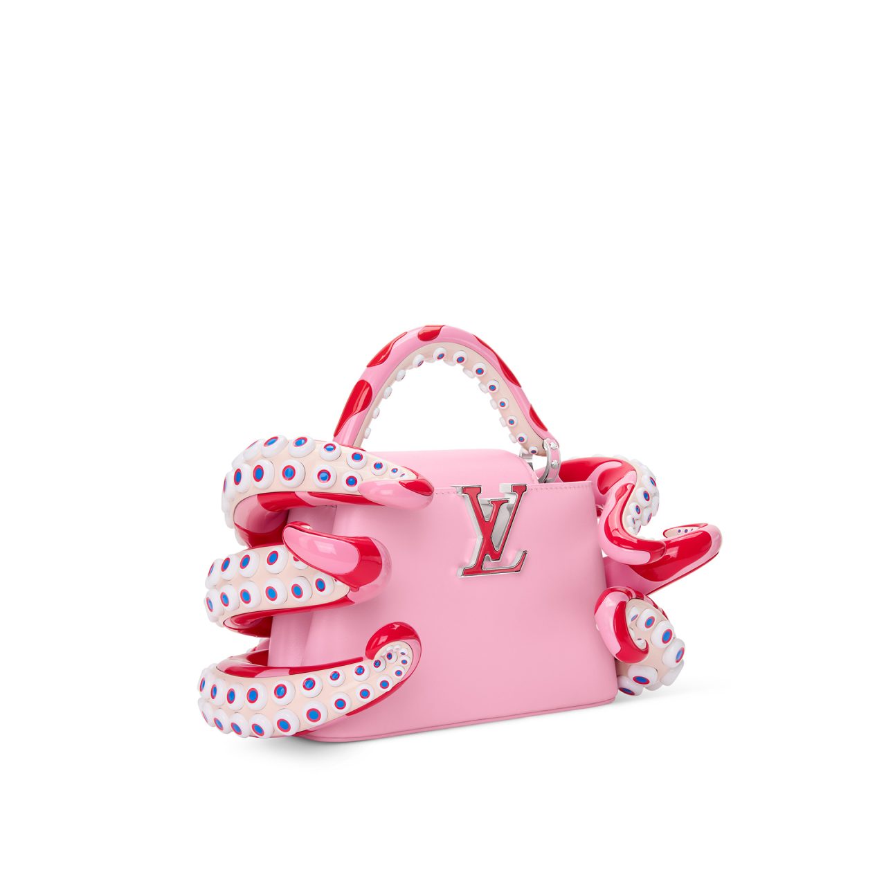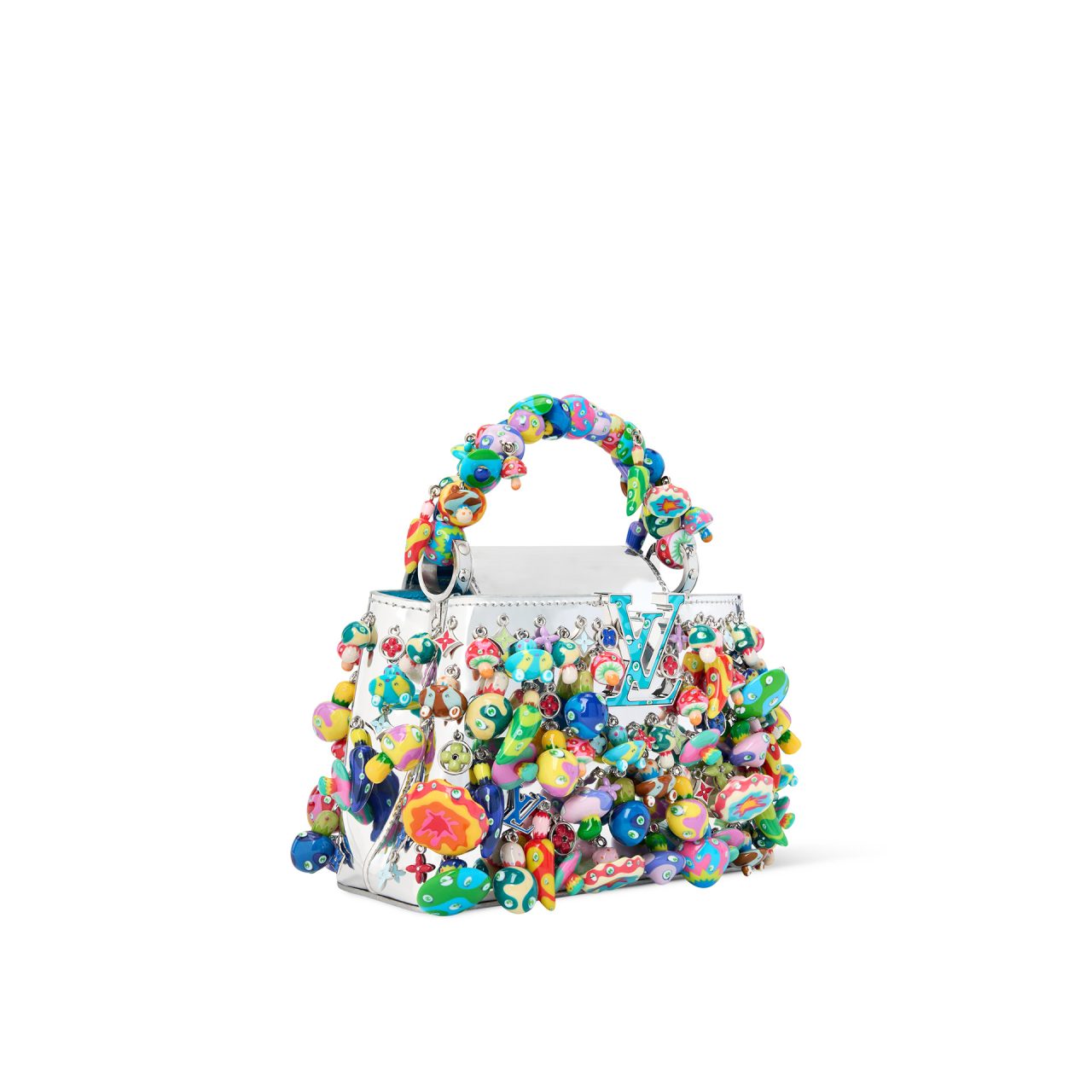 第7弾となる本コレクションは、サイズや形状を大胆に変化させ、彫刻作品のように再構築した11点で構成される。万華鏡のようにカラフルな「カプシーヌ EW レインボー」、100体のマッシュルームキャラクターを手磨きし一点ずつ刺繍した「カプシーヌ ミニ マッシュルーム」、村上隆の分身として知られる「DOB 君」をタコ化した彫刻作品から着想を得た「カプシーヌ ミニ テンタクル」など、いずれもサイケデリックで唯一無二の存在感を放つ。