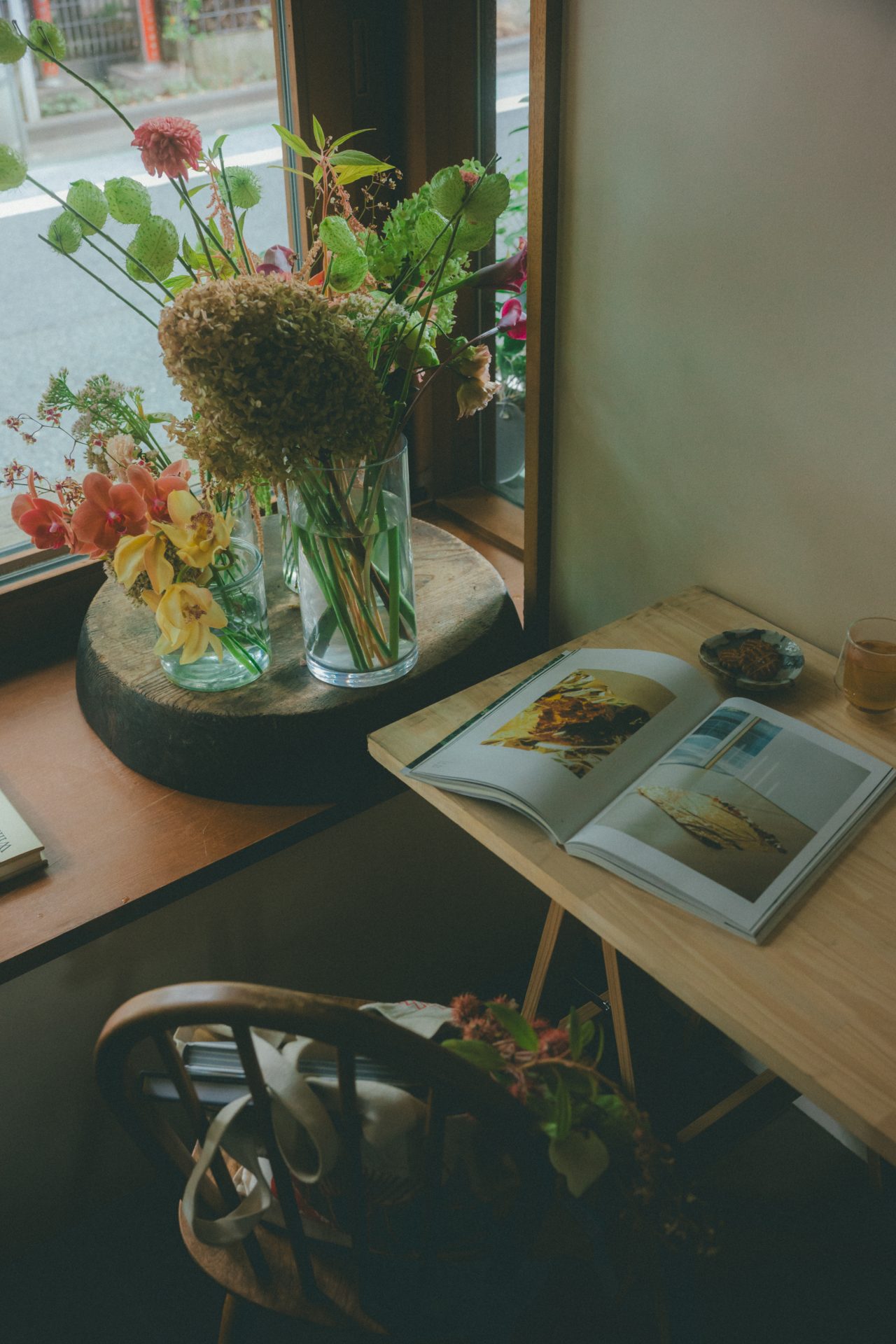 場所は、世田谷、羽根木に佇むフラワーショップ、「malta (マルタ)」内。同店は、星のや軽井沢や星のや京都などを手掛けた、建築家の東利恵による設計で、窓の外には樹齢100年を超える大木の緑が連なる。森の静けさに包まれた空間に、穏やかな空気が流れている。