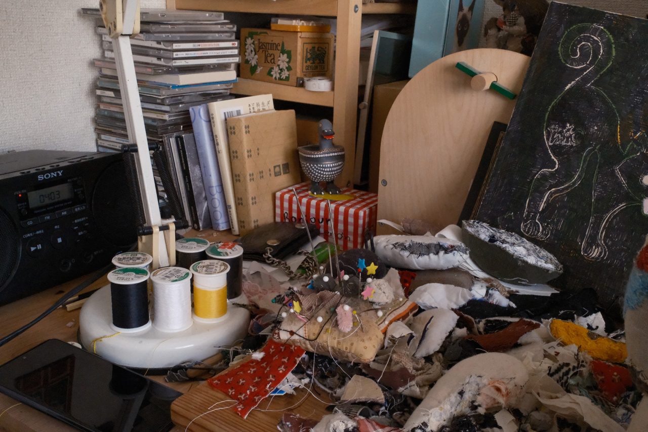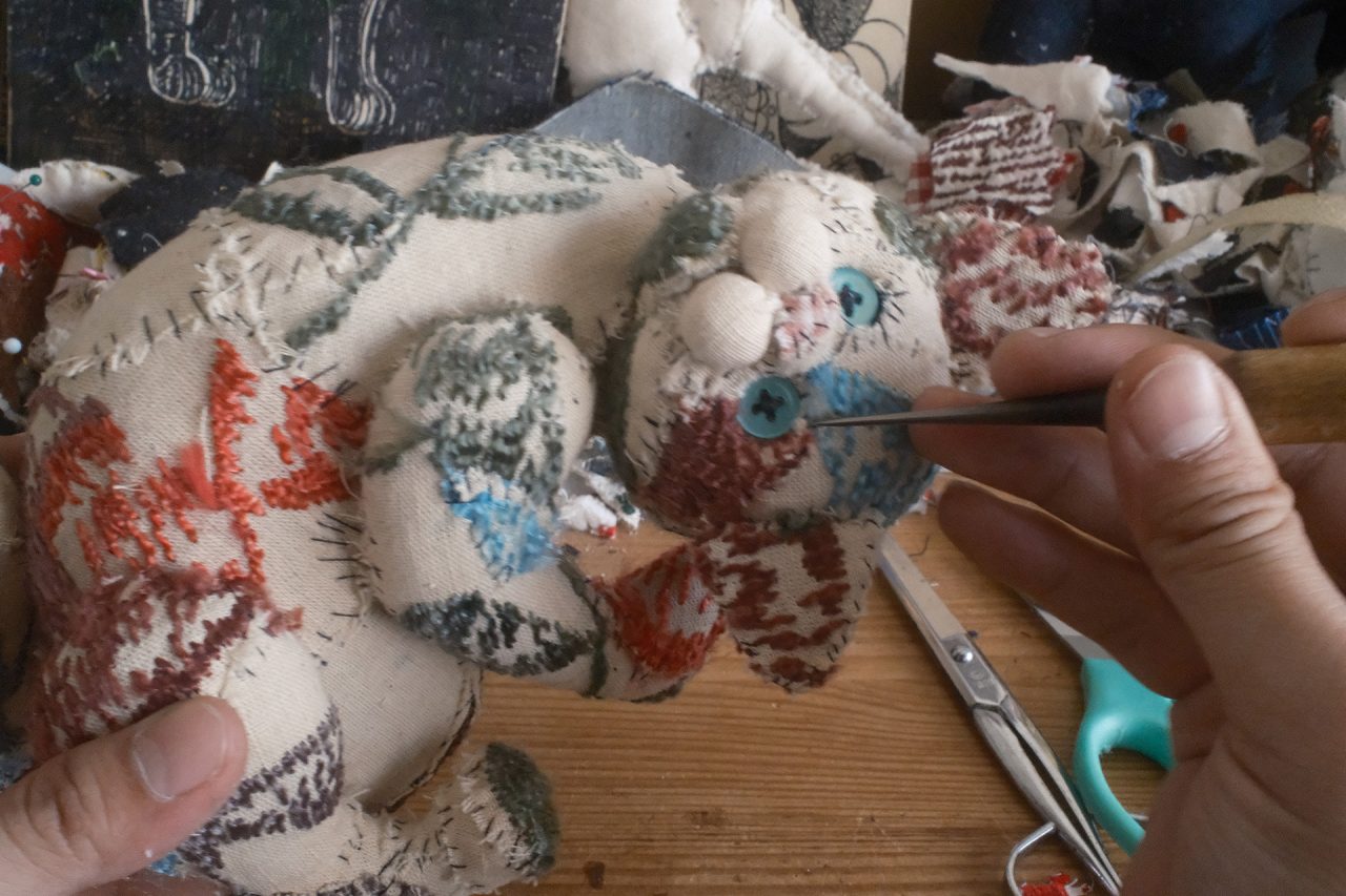 MASAYUKI KINUTA (以下、K): 今の作風で制作をする前は、音楽と絵をやっていました。ただ、どちらの活動も思うようにいかず、違う手法で圧倒的なオリジナリティを得るにはどういうアプローチをすればいいのかを考えていたんです。まずは独学で、身近にあるもので始めようと思い、着れなくなったデニムと家にあった裁縫道具で作り始めたことがきっかけです。当時は音楽とファッションが連動していた時代。音楽が好きだったから、自然とファッションにも興味があり、布を使った作品に行き着いたのかなと思っています。最初は『星の王子さま』に出てくる象をイメージしてデフォルメした動物をモチーフにしていました。最初に作ったのは20年前、出だしは時間はかかりましたが、なんとか続けて来れました。