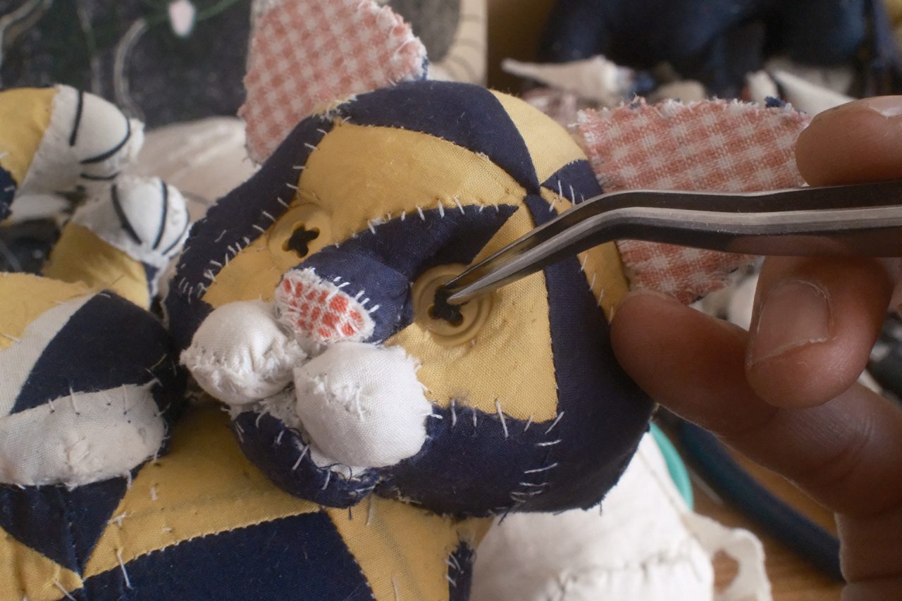 K: 布の彫刻のプロセスでいうと、 KHOKI が集めたキルトやオリジナルの生地のはぎれがまとまって送られてきて、それからどう作品を作るかは僕に任されています。柄や色の当てこみは、1体ごとに似たものが出ないようにと工夫しながら、できるだけバリエーションを出すようにしています。どうしても後半になるとデザインが偏ってしまうので、そうならないように初めから意識しながら、今回は計33体の作品を作りました。ヴィンテージキルトは数が少なかったのですが、より良い組み合わせができて僕も嬉しかったです。