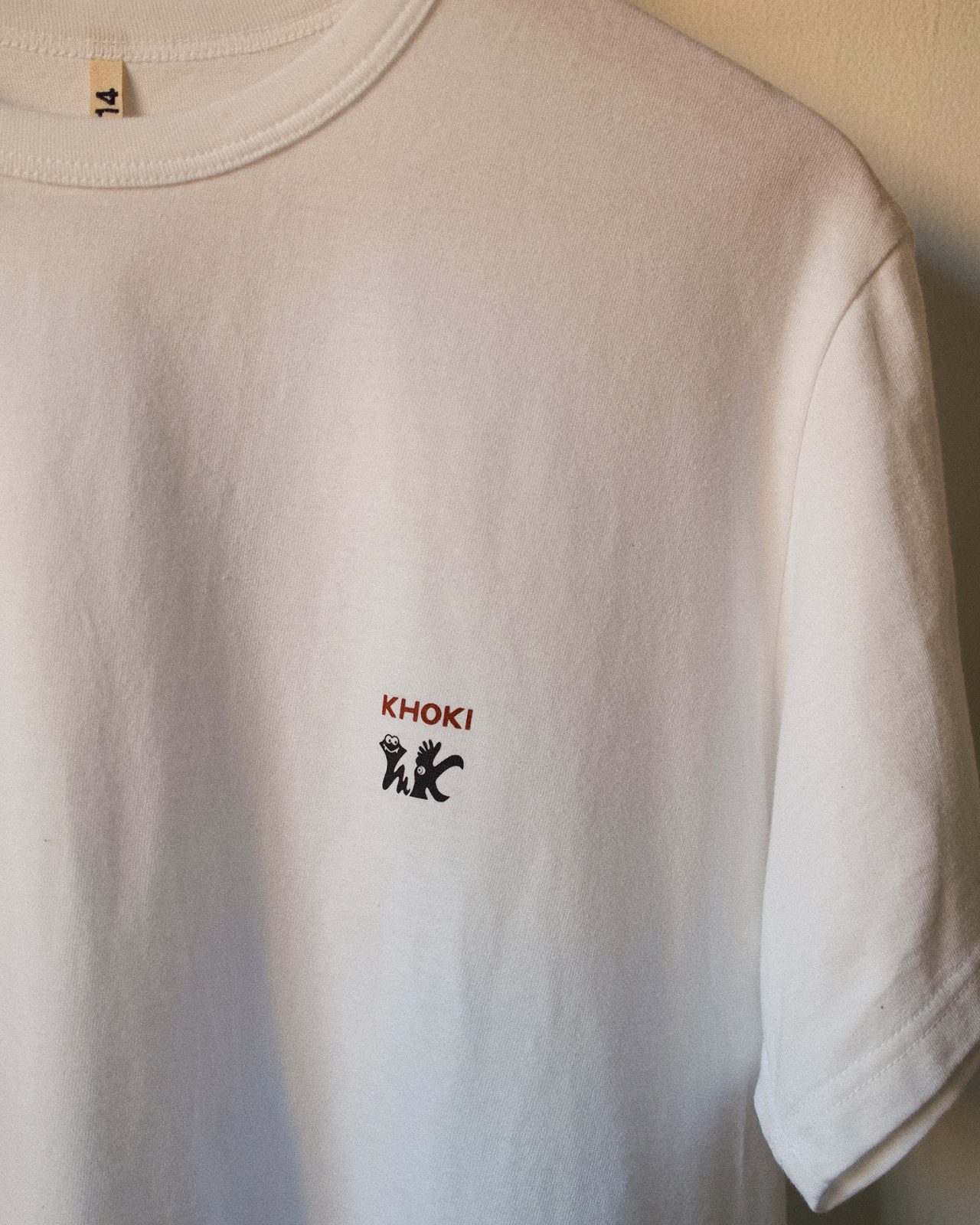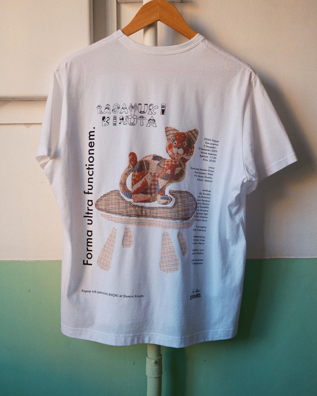 A: KINUTA さんの作品を見ていると、耳や鼻のようなわずかな面積の部分にまで、驚くほど丁寧に生地が当て込まれているのがわかります。しかもその布の組み合わせは偶然ではなく、意図が感じられる組み合わせというのが、本当にすごいですよね。細部まで目を凝らしてみると、ヴィンテージの古い生地同士の組み合わせが絶妙で、立体になる前から好きだった布が、さらに別の布と隣り合わせになることで魔法をかけられたように感じられる。そのおもしろさに惹きつけられます。僕たちは KINUTA さんの作品をファッションのフィールドに持ち込むため自分たちが身につける時にしっくりくるトートバッグや、プリントTシャツを作りました。トートバッグはヴィンテージのものを仕入れ、バッグの色と半立体の作品が合うようにチームでそれぞれ色合わせをし、全て手で縫い合わせています。Tシャツは KHOKI の定番ボディをベースにしつつ、通常より丈を短くしたボックスシルエットにアレンジしています。架空のイベントTシャツをテーマにしたプリントの一部にトロンプルイユ風にパッチワークを施しています。