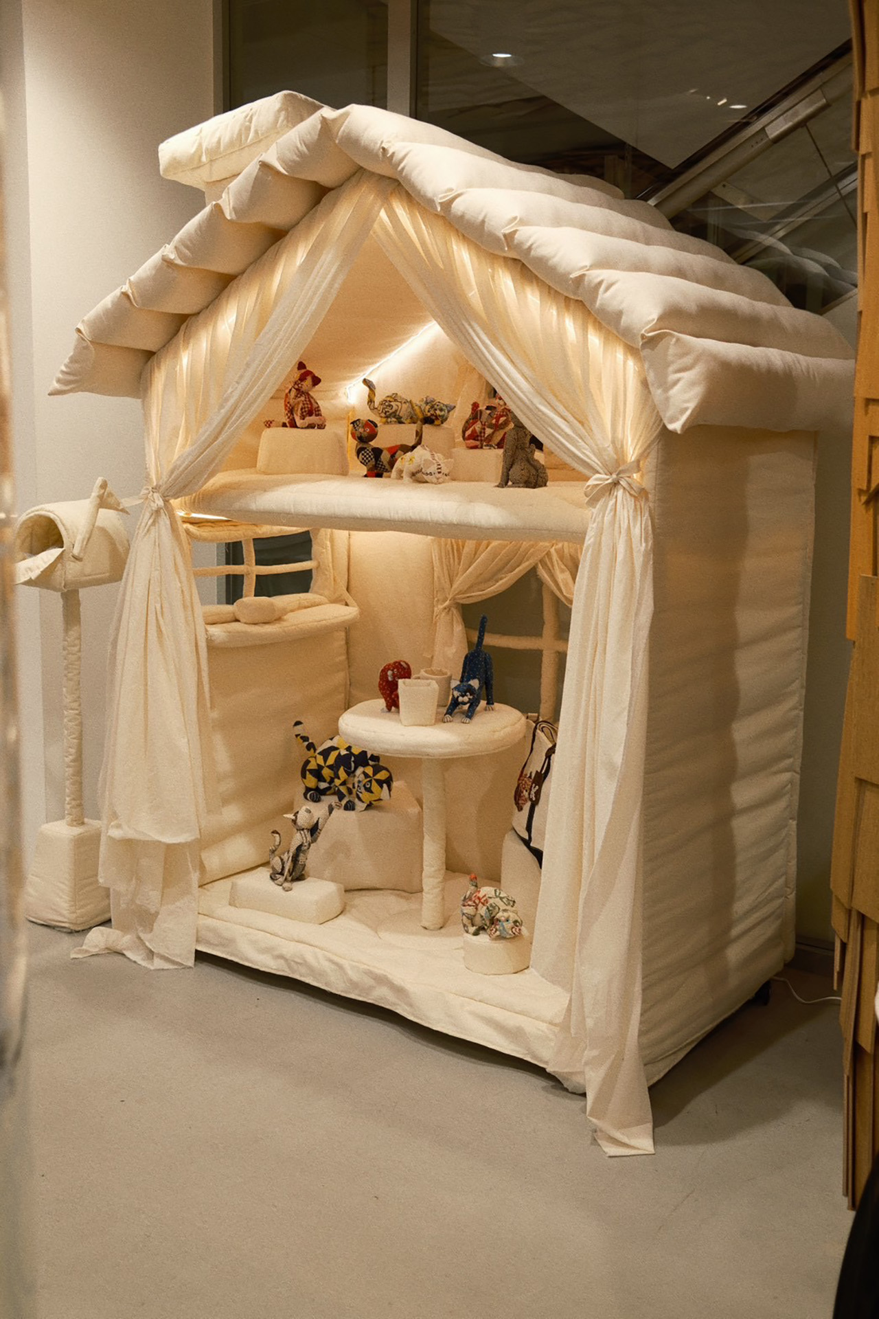 A: KINUTA さんの猫の“布の彫刻”は躍動感があり、まるで生きているようなリアルさがあるので、その猫が生活している姿が自然と浮かび上がるようなデザインにしたいと思ったんです。そこで、猫のサイズに合わせたドールハウスを制作しました。ただ作品を並べるだけではなく、猫が窓から顔を覗かせている姿など、猫らしい仕草が感じられる見え方にしたら面白いなと思いながら作りました。