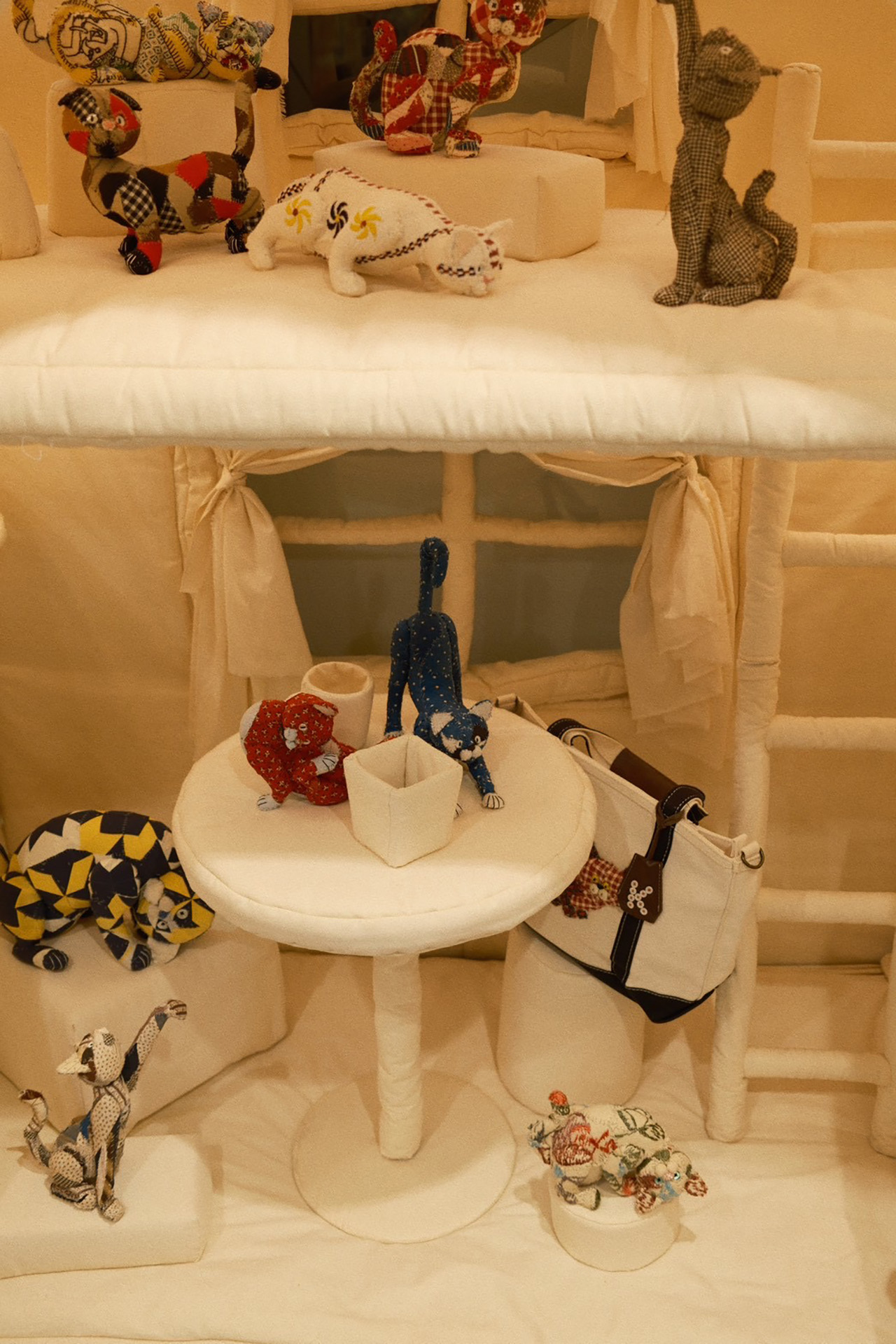12月25日(木)までの開催となる、本インスタレーションの中心となるのは、ドールハウスをそのまま拡張したような小さな家。その内部には、KHOKI がコレクションで使用してきた貴重なヴィンテージのアメリカンキルトやオリジナルで制作したキルト、カンタのはぎれを素材とし、MASAYUKI KINUTA が全て手作業で仕上げた一点ものの猫の“布の彫刻”が配される。ノスタルジックで穏やかな空間が広がるインスタレーション内では、猫の“布の彫刻”に加え、KHOKI が買い付けたヴィンテージトートバッグに半立体作品 “Wall Cat” がドッキングされたものやオリジナルプリントTシャツなど特別なラインアップが限定販売。今回のコラボレーションを記念し、デザインチーム KHOKI のディレクターである Koki Abe と、アーティスト MASAYUKI KINUTA の2人に、両者がものづくりの根底に据えてきた“手仕事”を軸にした制作と、本コラボレーションについて話を聞いた。