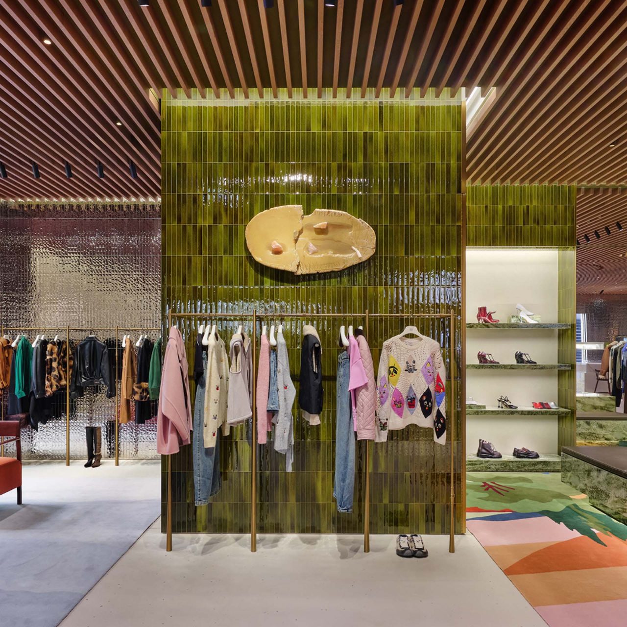さらに店内には、アンシェント グリーン、クリスタロ アイスバーグ、ピンタ ヴェルデ、サハラ ブラウンなど、多彩な大理石が軽やかに配置されている。真ちゅうの窓枠は、かつて銀貨や金貨の造幣が行われていた銀座の歴史を映し出し、空間に奥行きを添える存在だ。そして、グリーンのセラミックタイルに包まれた中央階段は、手仕事で仕上げられた木製の手すりとともに柔らかな曲線を描き、ゆるやかに全フロアを結ぶ。自然光が降りそそぐ中、石材・木材・セラミック・コンクリートが織りなす素材の対話が、店舗全体に豊かなリズムをもたらしている。