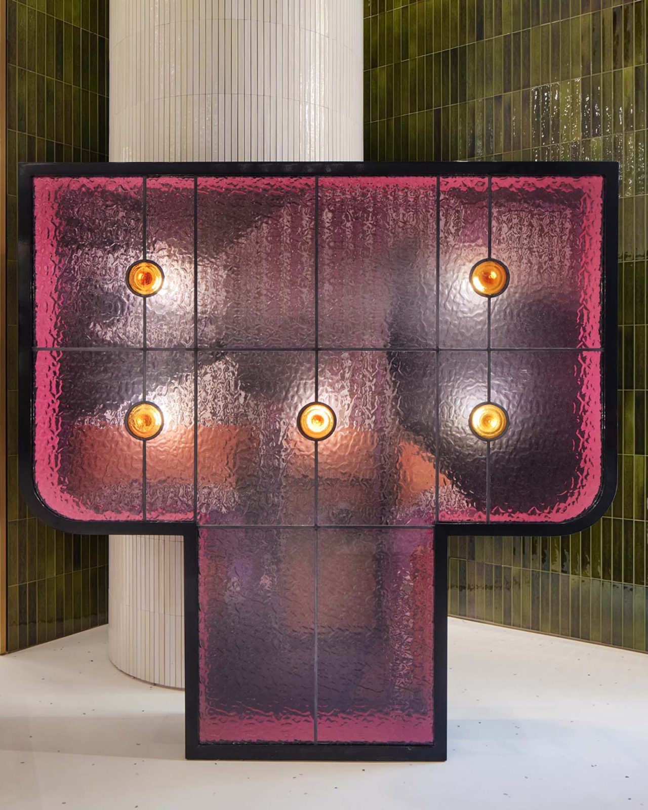 また、アートコレクターの邸宅のような親密な雰囲気と、洗練された店舗空間を融合させるカサロエベらしいコンセプトを基軸に、スペインの感性と日本のデザインが重なり合う空間が創出されている。外装のマディグリーンのセラミックタイルは手仕事によるもの。不規則な釉薬の表情やわずかな窪みが光を反射し、かつて銀座が低湿地帯だったという土地の記憶を呼び覚ます。タイルは内装にも連続し、コンクリート素材の空間に奥行きと輝きを添えている。