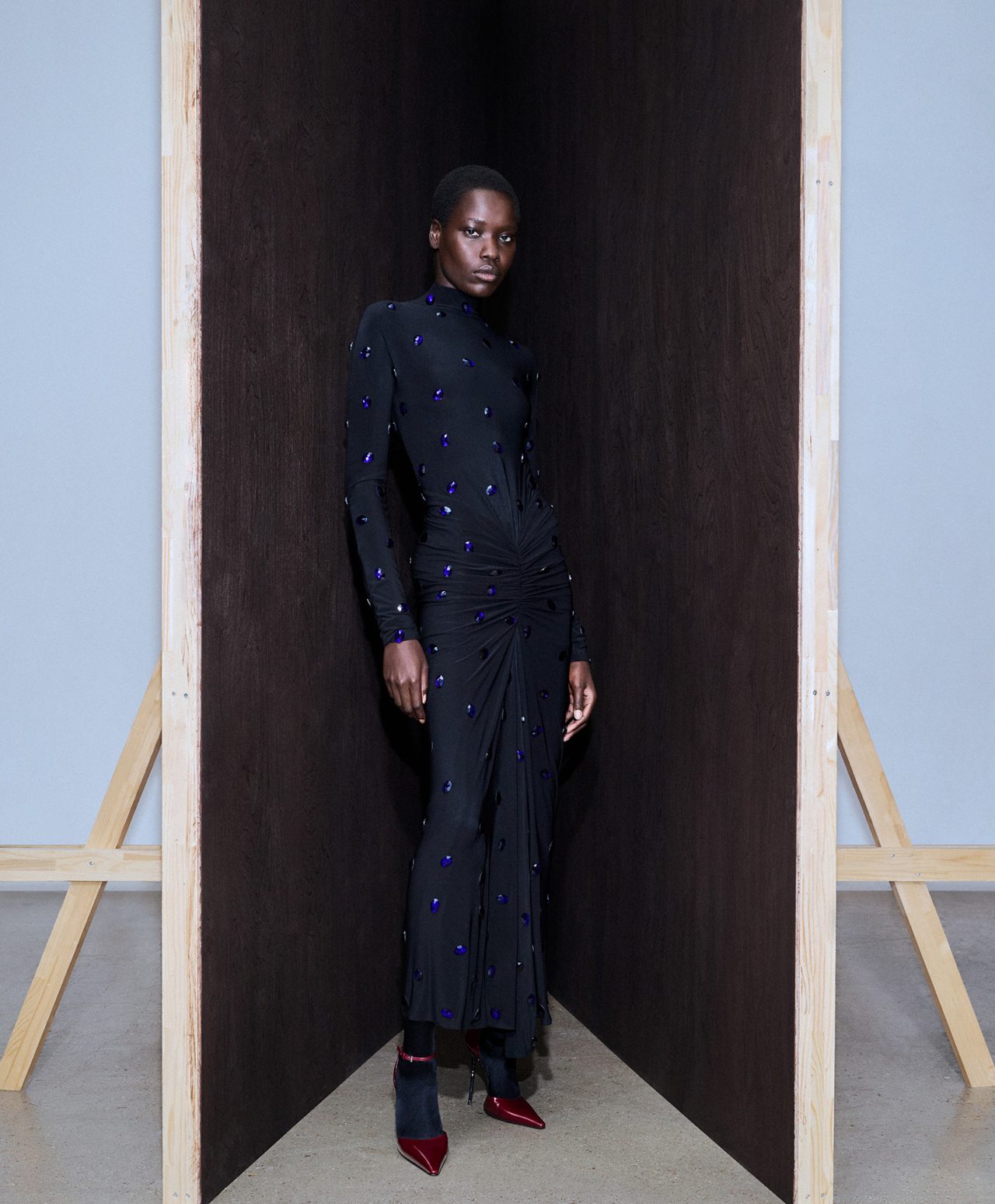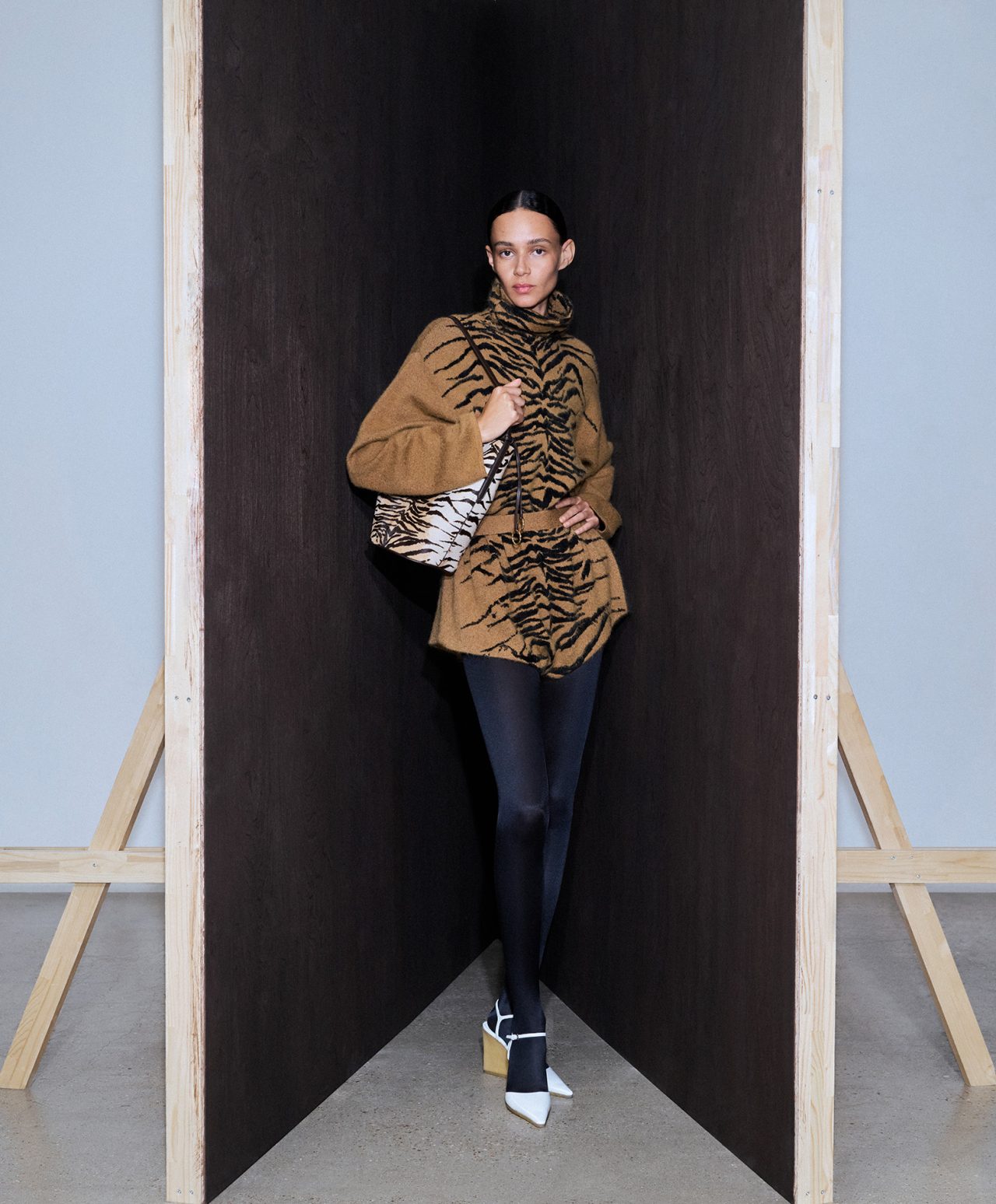 登場するのは、身体のラインを包み込むドレス、ファーのカフスが添えられた彫刻的レザーコート、セカンドスキンのように寄り添うビニール、艶めくスパンコール、シグネチャーのアニマルプリント、そして大胆なアクセサリーたち。いずれもメゾンの新たなエッセンシャルとして息づき、2026年 ウィンタースプリングコレクションのショー映像と共鳴しながら、親密さを核にしたビジュアルを築いている。衣服のディテールのみならず、モデルの顔、肌、身体そのものが放つエレガンスと静かな強さが世界観を形づくり、メゾンが描く憧れを強く喚起している。