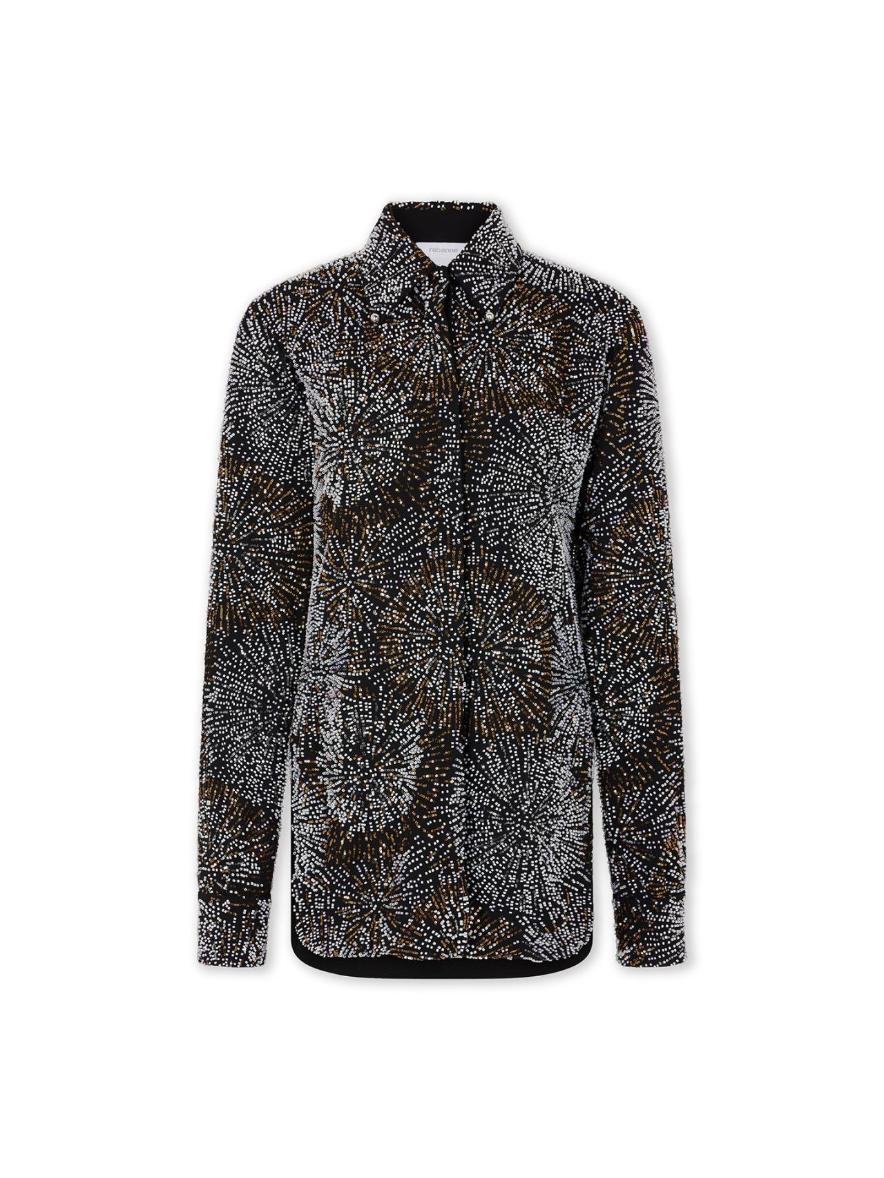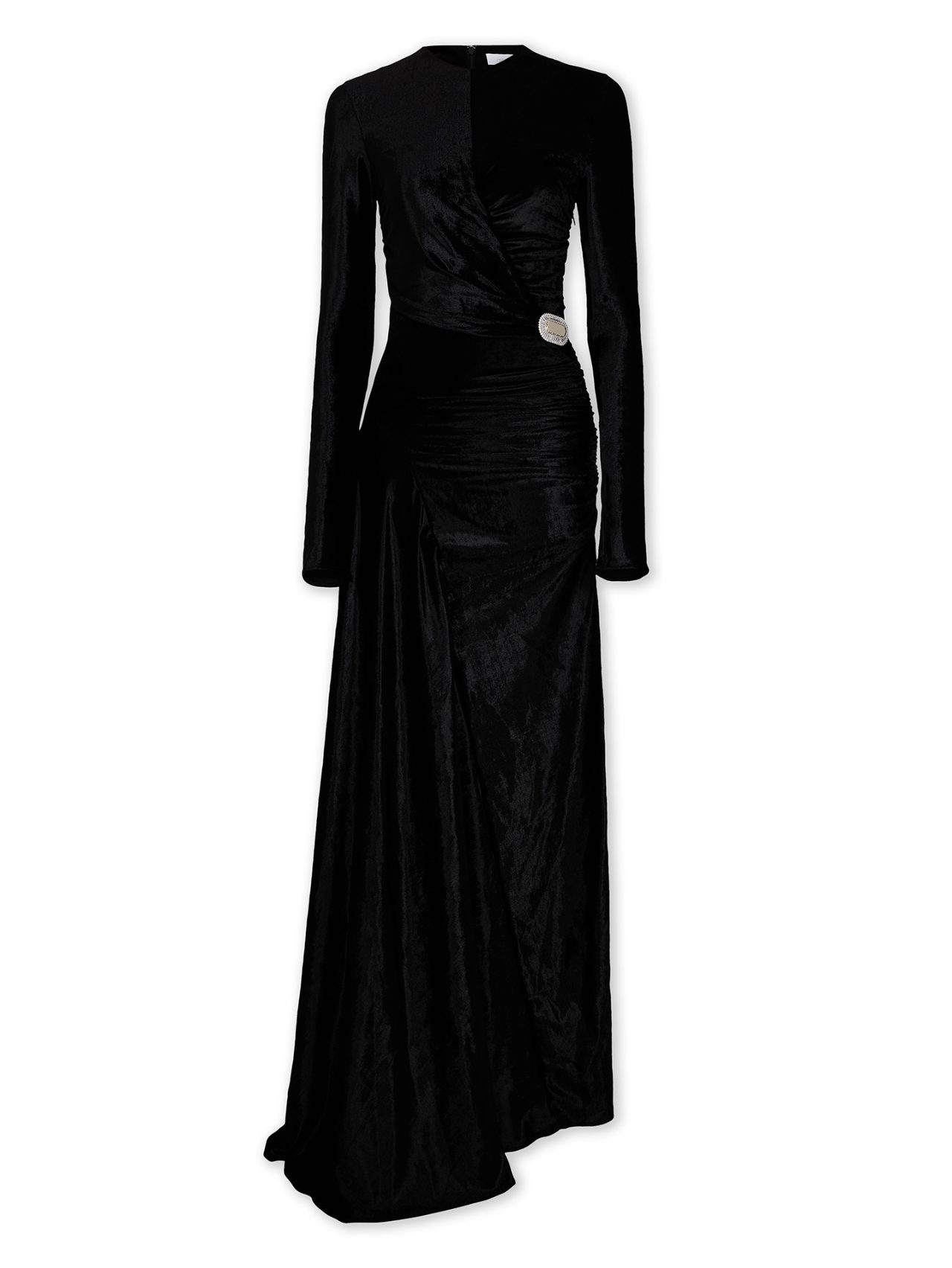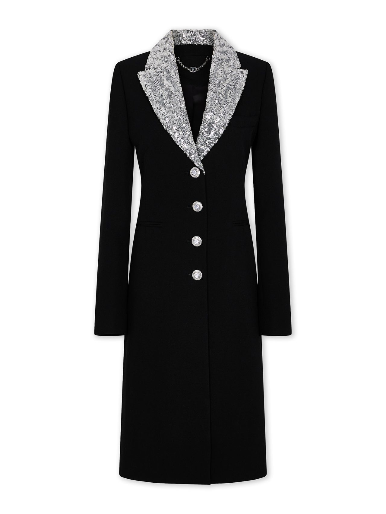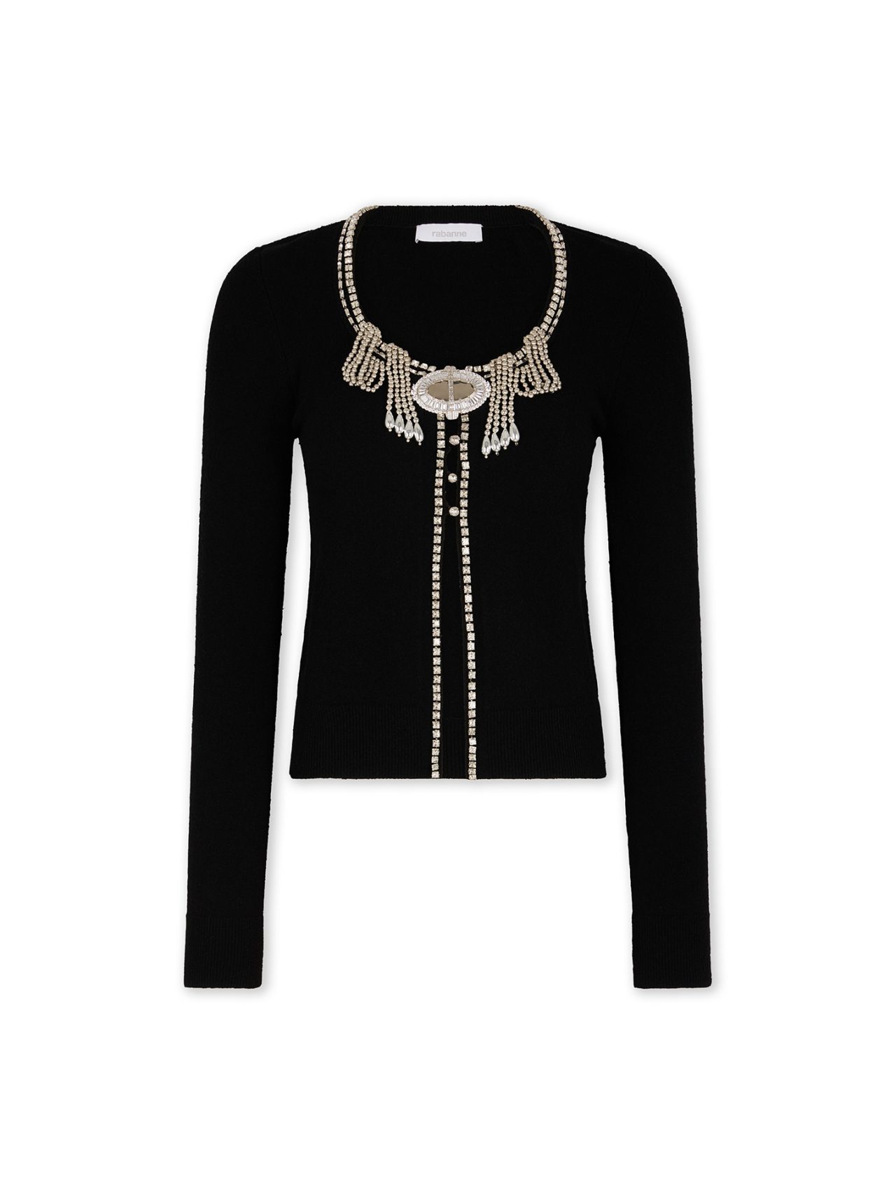 クラシックなカーディガンにはアールデコ調のストラスがきらめきを添え、細身でロングラインのニットコートには、贅沢なフェイクファーカラーをあしらうことで、構築感と解放感がひとつのシルエットに共存。黒のベルベットジャージードレスは、ひとつのジュエルを添えたミニマルな佇まいで、セカンドスキンのような存在感を放っている。