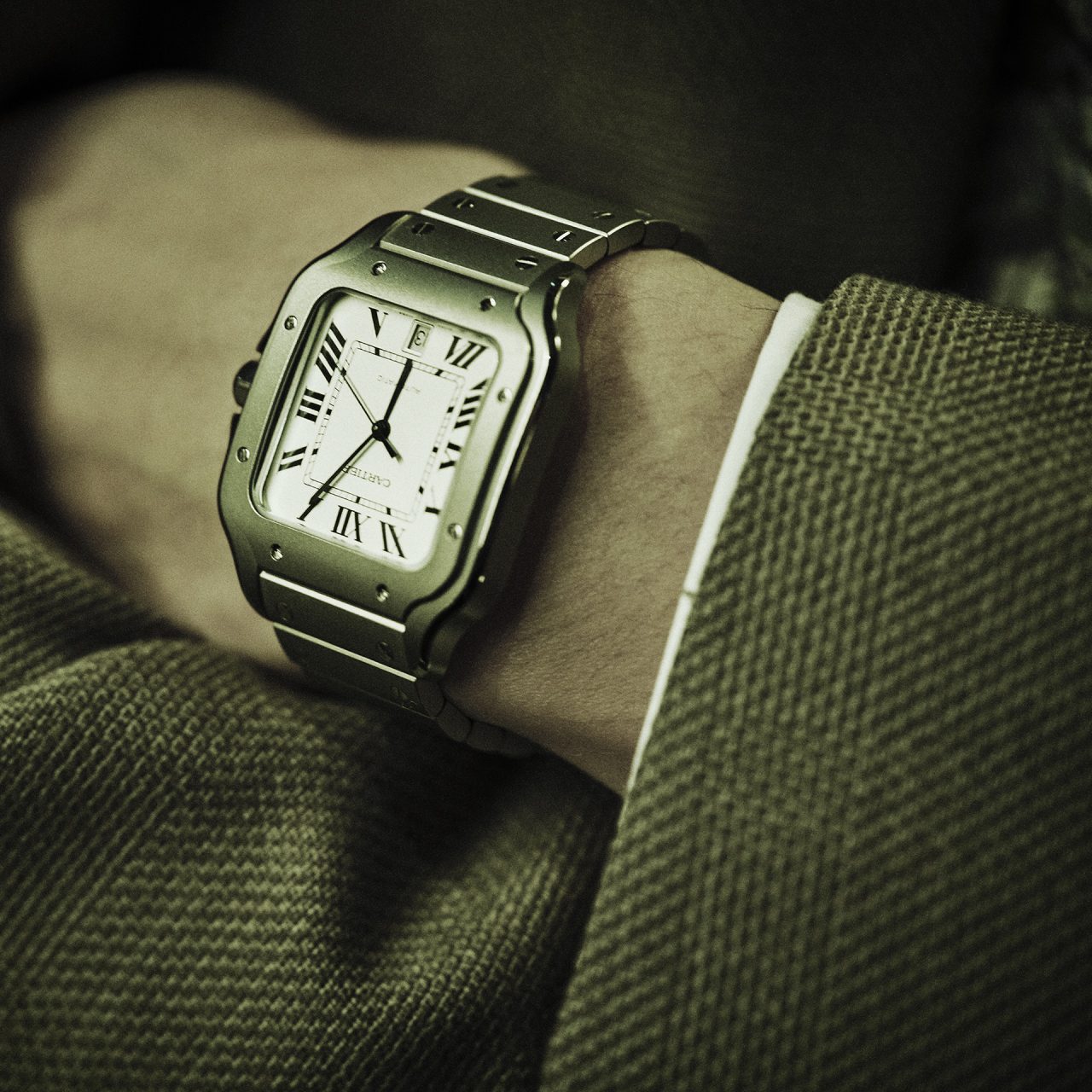 新作のチタニウムモデルは、「サントス」ウォッチのアイコニックなデザインを継承しながら、スティールより約43%軽く、約1.5倍の硬度を誇るチタニウムを採用。巻き上げリューズにはブラックスピネルを配し、全面に施されたマイクロビーズブラスト仕上げが、チタニウム特有の深みある色合いとマットな質感を際立たせている。ケースからブレスレットまでチタニウムを用いた本作は、Cartier 初の試みであり、生まれながらに革新的な「サントス」ウォッチの新たな可能性を提示する一本となっている。