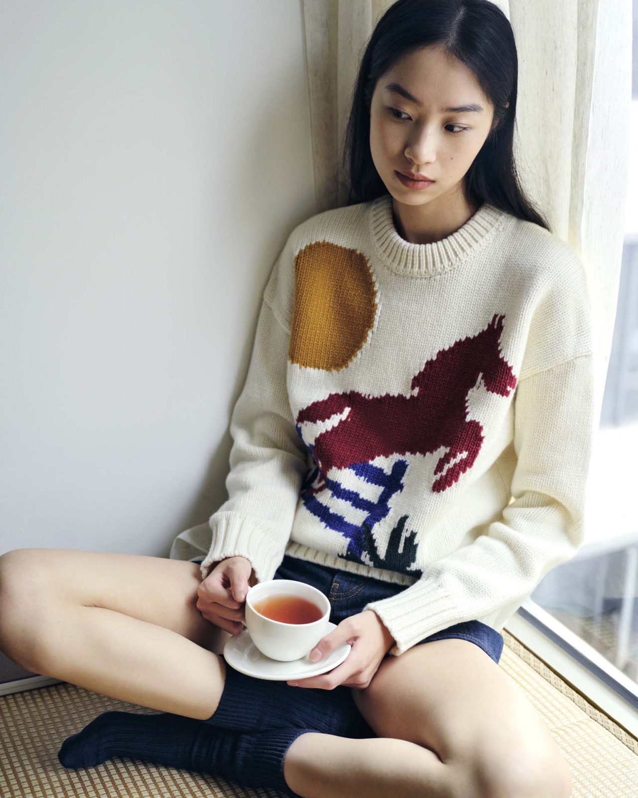 また、刺繍やハンドプリントによるステッチワークに加え、象徴的なモチーフとして「馬」を大胆に表現。シャツのパッチワークや、セーターの印象的なディテールとしてあしらわれ、各ピースに温もりと個性が宿る仕上がりだ。