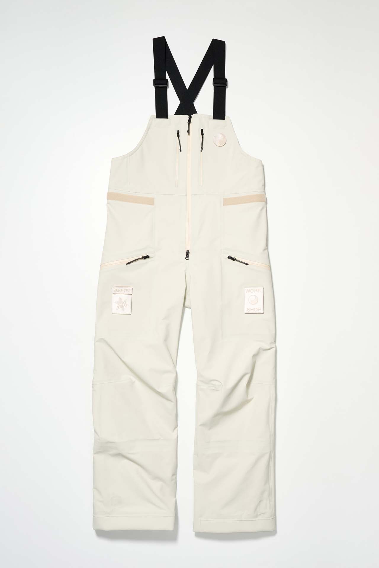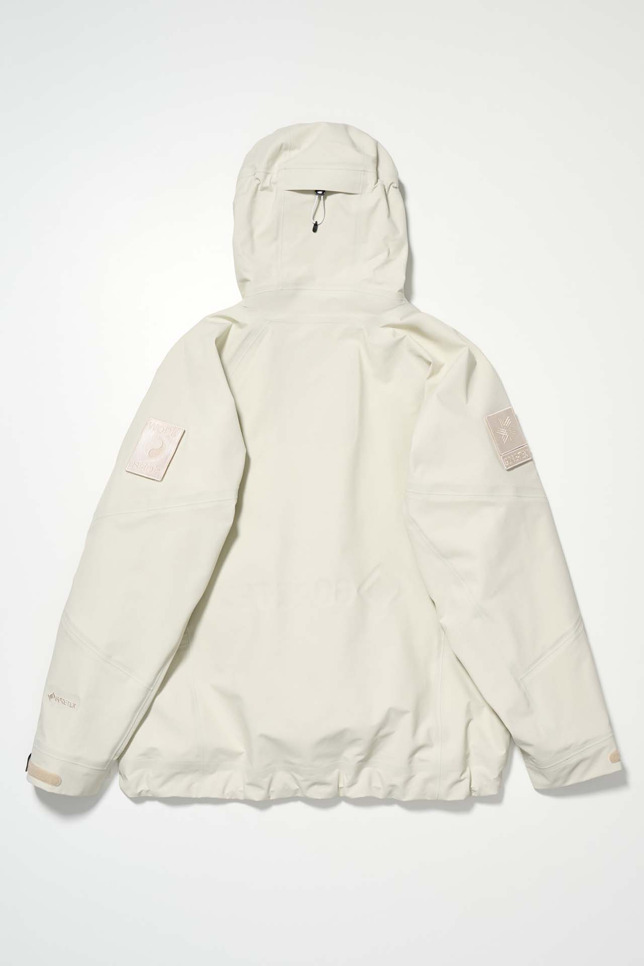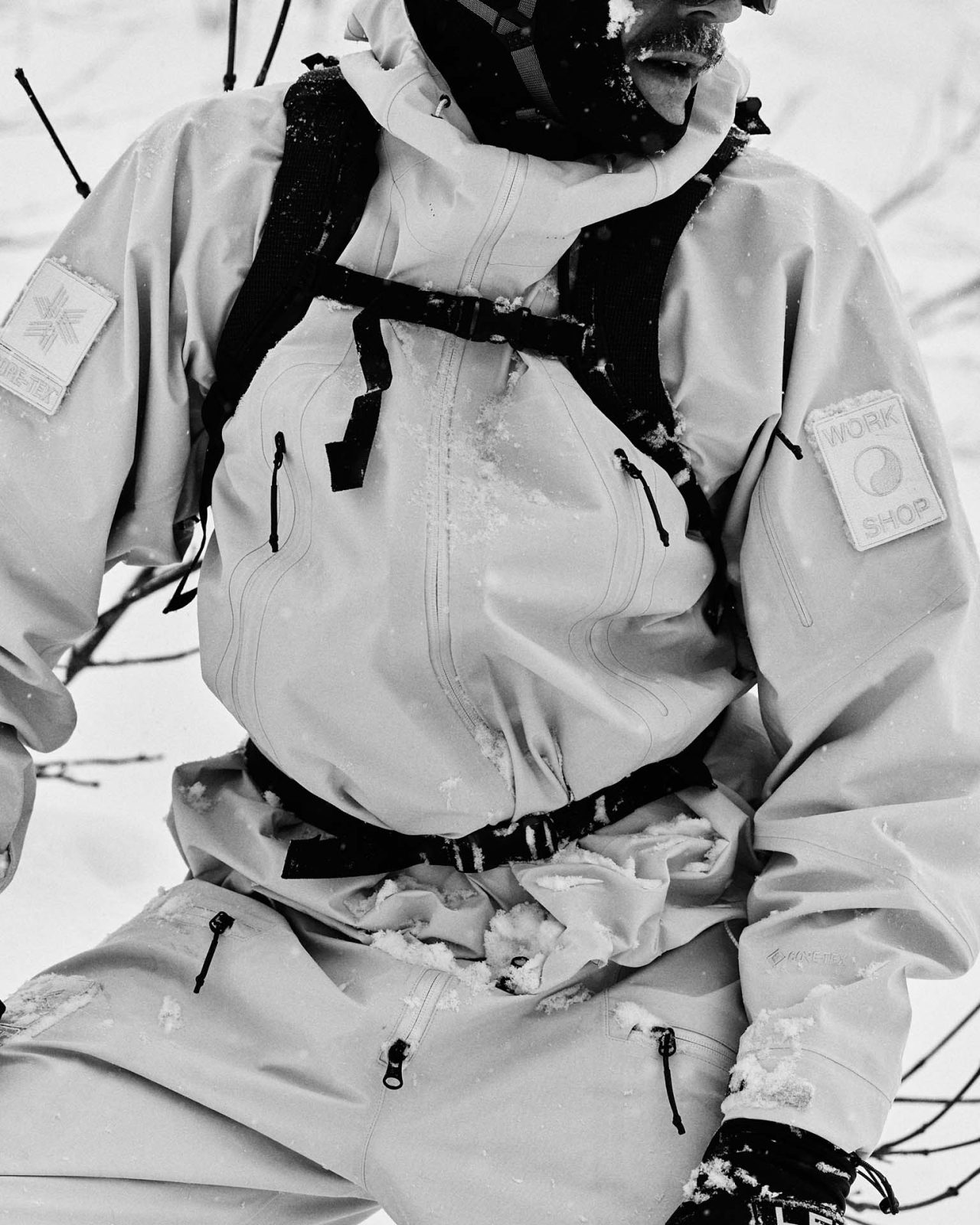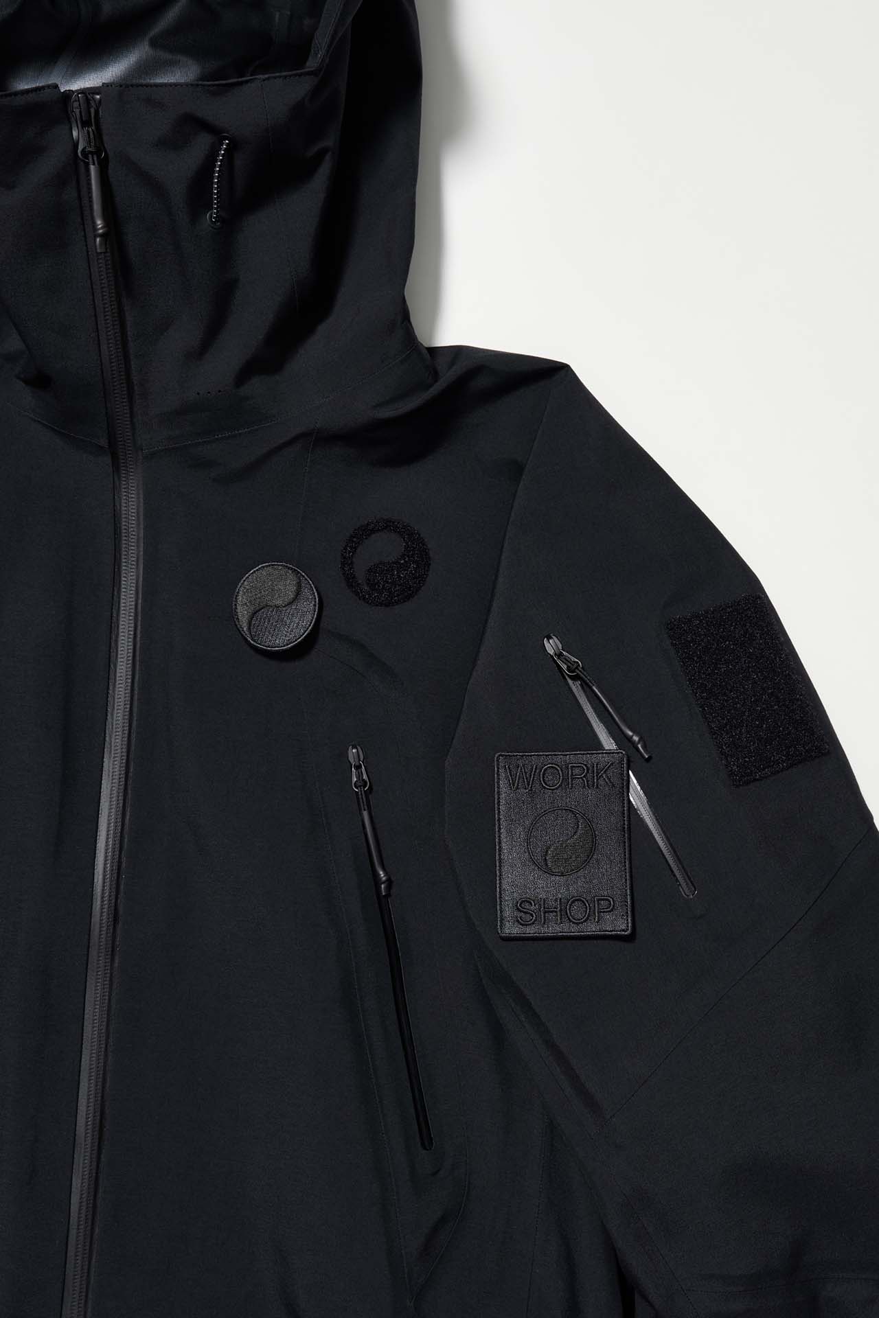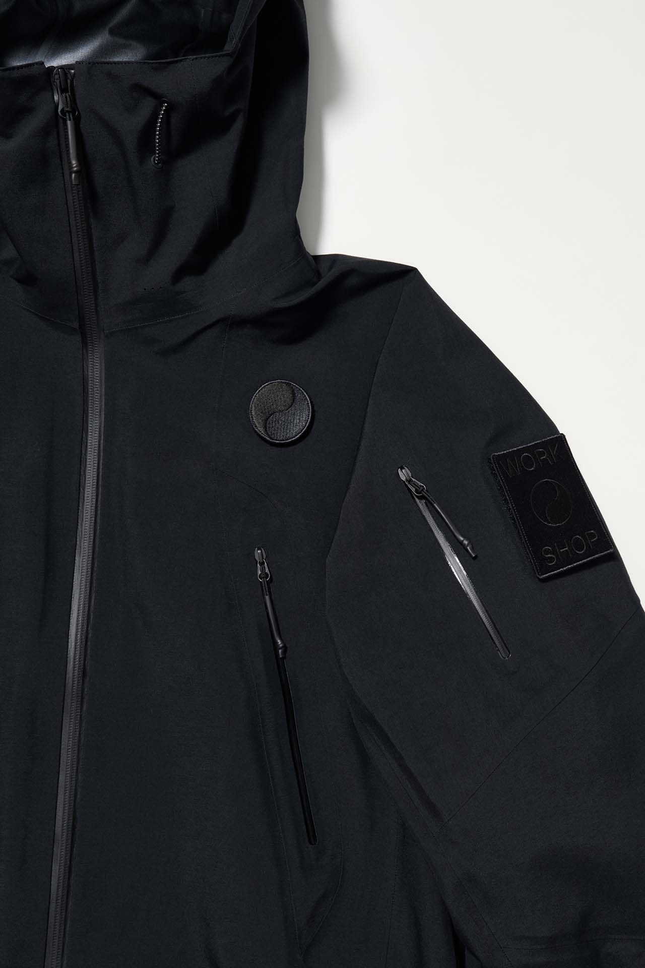 ジェットブラックとボーンホワイトの2色で統一された本コレクションは、山、森、あるいは都市など、いかなる過酷な環境下でも保温性と防水性を保持し、活動に全神経を集中できるよう設計された極めてテクニカルなレイヤリングシステムとなっている。GORE-TEX®︎ (ゴアテックス) 3レイヤー素材のシェルジャケットやビブパンツをはじめ、PERTEX®︎ (パーテックス)、SOLOTEX®︎ (ソロテックス)、POLARTEC®︎ (ポーラテック)、CORDURA®︎ (コーデュラ) といった最高峰の機能素材を組み合わせたプロフェッショナルな仕様に加え、細部に宿るストイックな意匠も WORK SHOP らしい魅力。外側には米軍規格 (ミルスペック) に着想を得た取り外し可能なパッチを配し、内側には各ファブリック・パートナーシップを象徴するリフレクティブ・プリントを施すなど、見えない部分にまで両ブランドの美学が貫かれている。