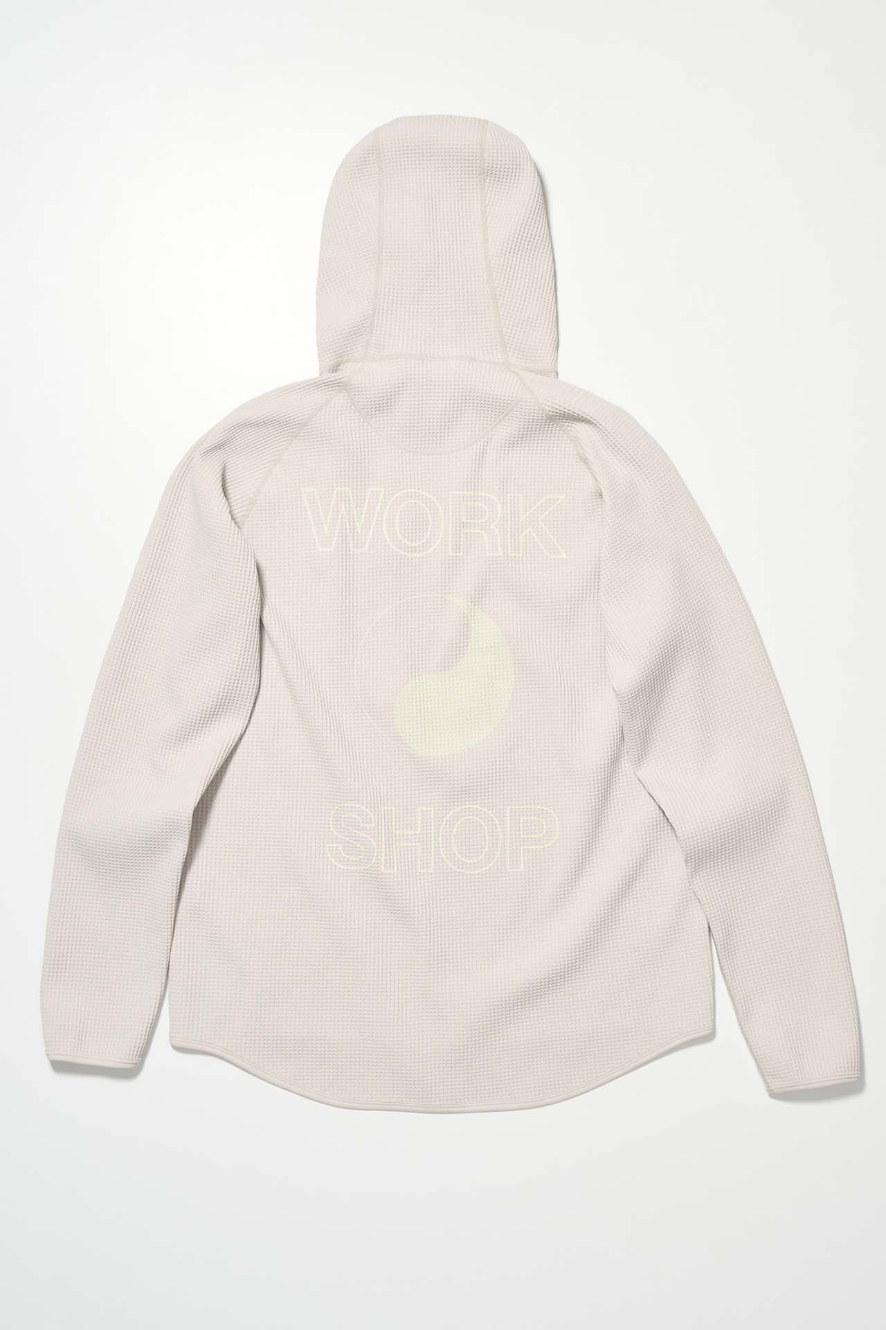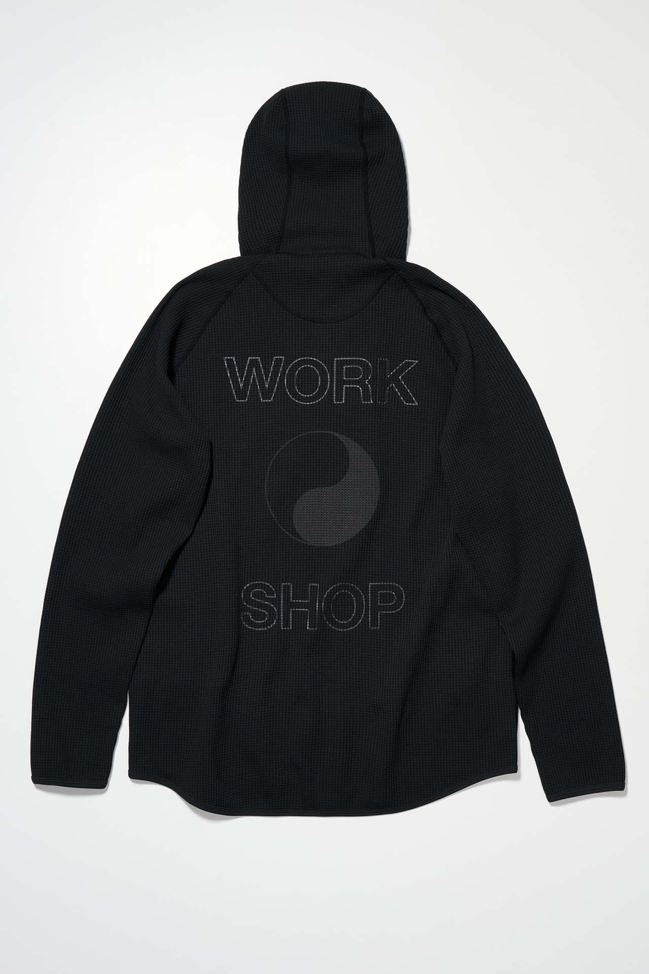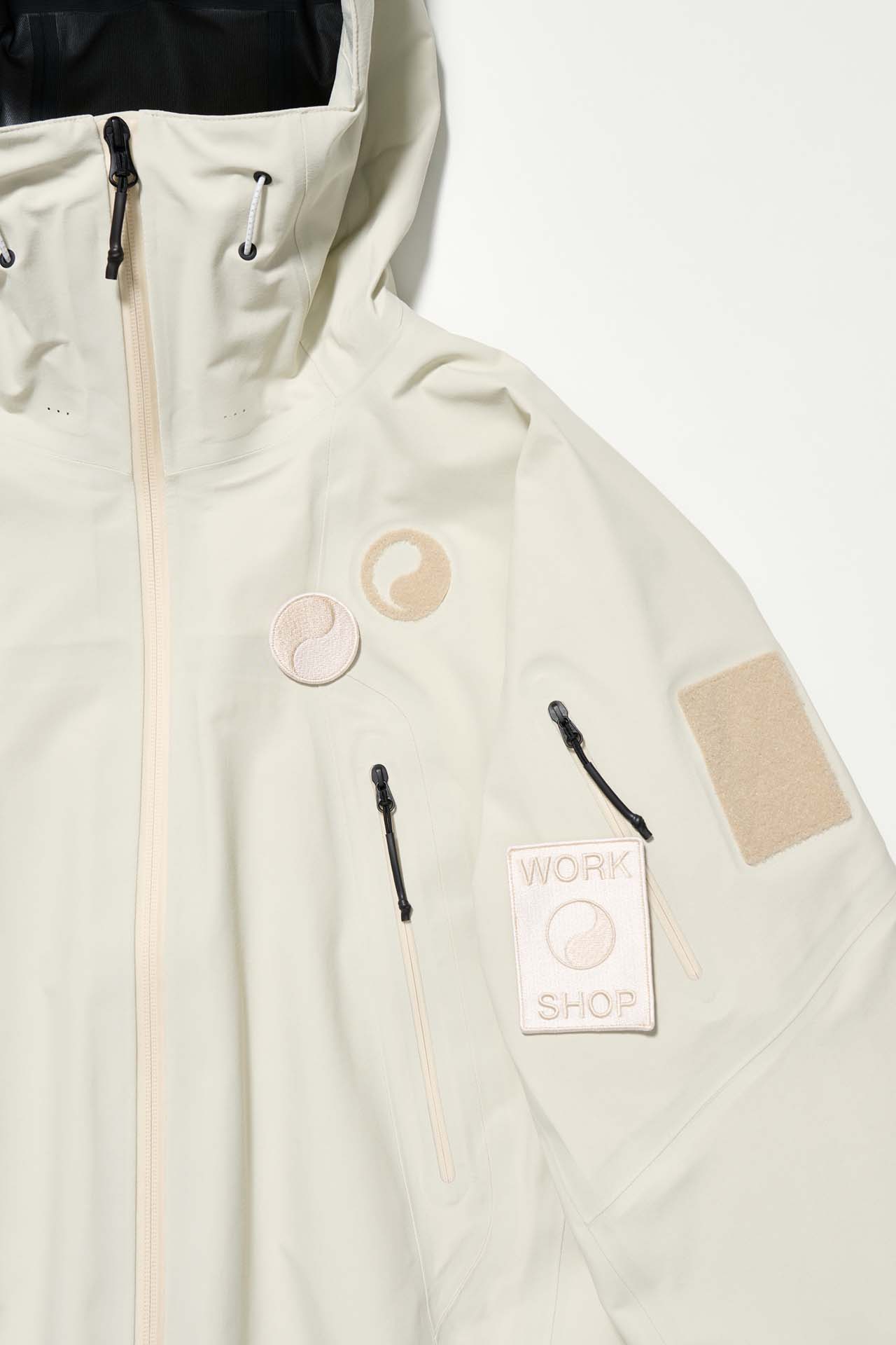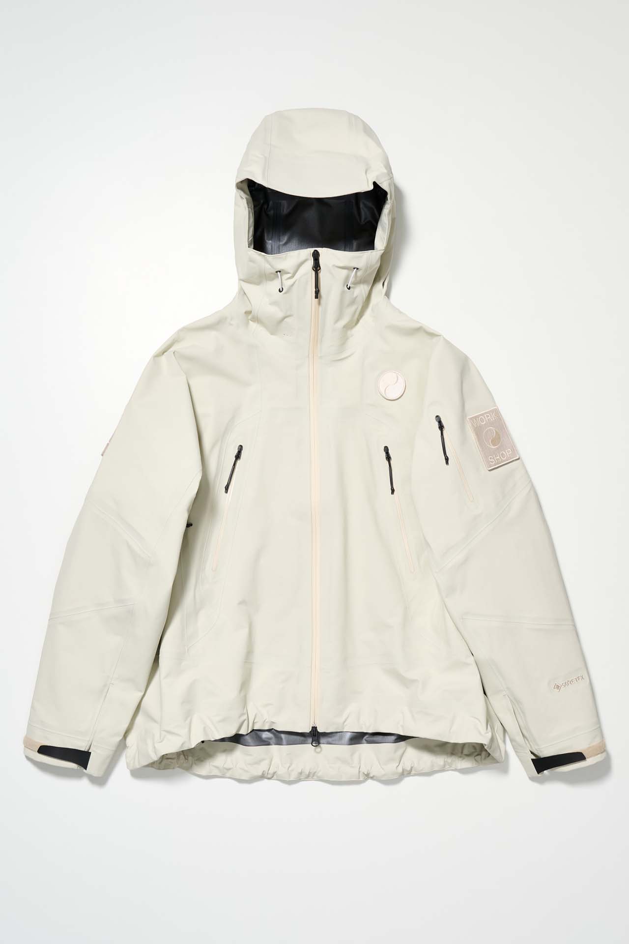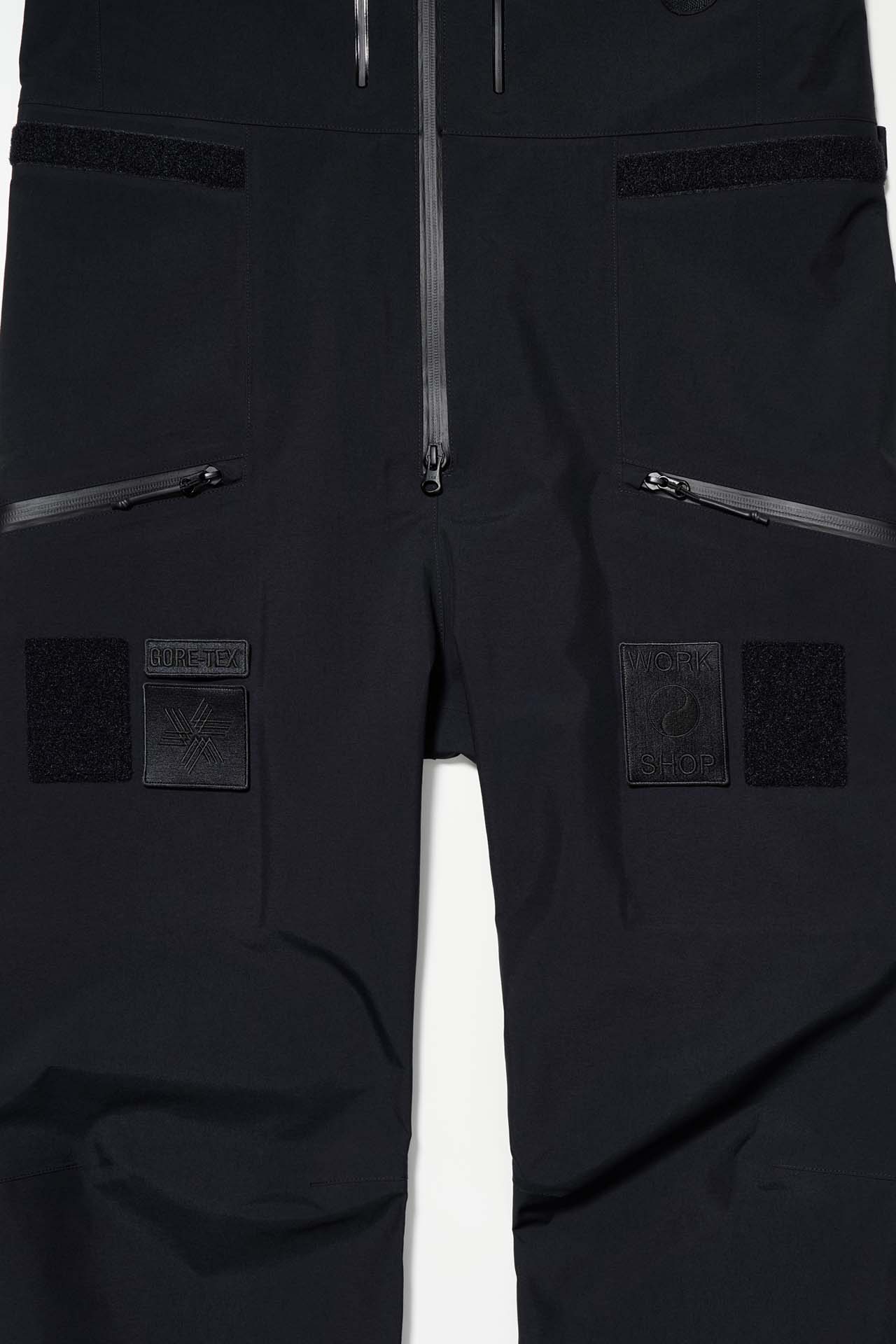 ジェットブラックとボーンホワイトの2色で統一された本コレクションは、山、森、あるいは都市など、いかなる過酷な環境下でも保温性と防水性を保持し、活動に全神経を集中できるよう設計された極めてテクニカルなレイヤリングシステムとなっている。GORE-TEX®︎ (ゴアテックス) 3レイヤー素材のシェルジャケットやビブパンツをはじめ、PERTEX®︎ (パーテックス)、SOLOTEX®︎ (ソロテックス)、POLARTEC®︎ (ポーラテック)、CORDURA®︎ (コーデュラ) といった最高峰の機能素材を組み合わせたプロフェッショナルな仕様に加え、細部に宿るストイックな意匠も WORK SHOP らしい魅力。外側には米軍規格 (ミルスペック) に着想を得た取り外し可能なパッチを配し、内側には各ファブリック・パートナーシップを象徴するリフレクティブ・プリントを施すなど、見えない部分にまで両ブランドの美学が貫かれている。