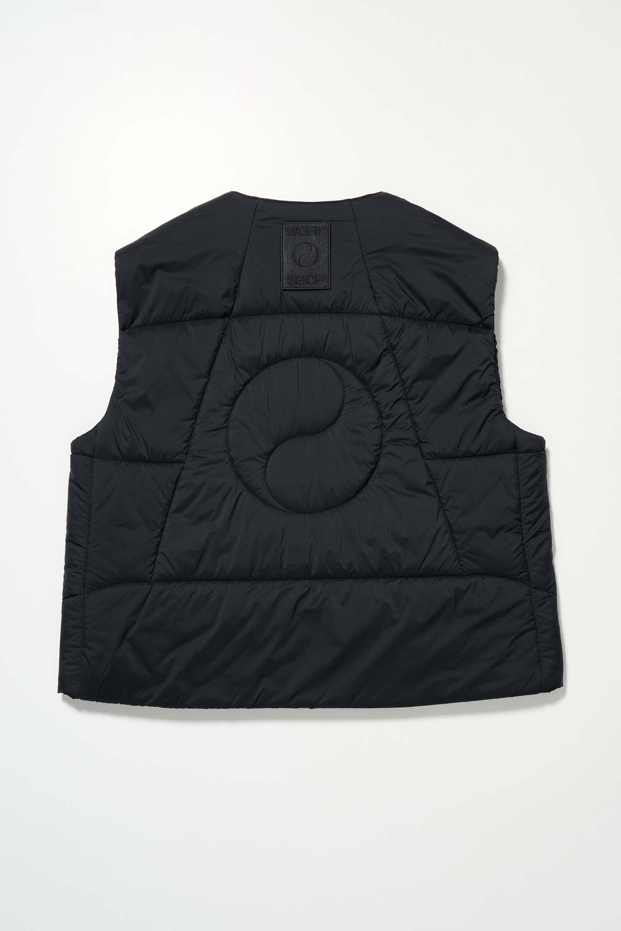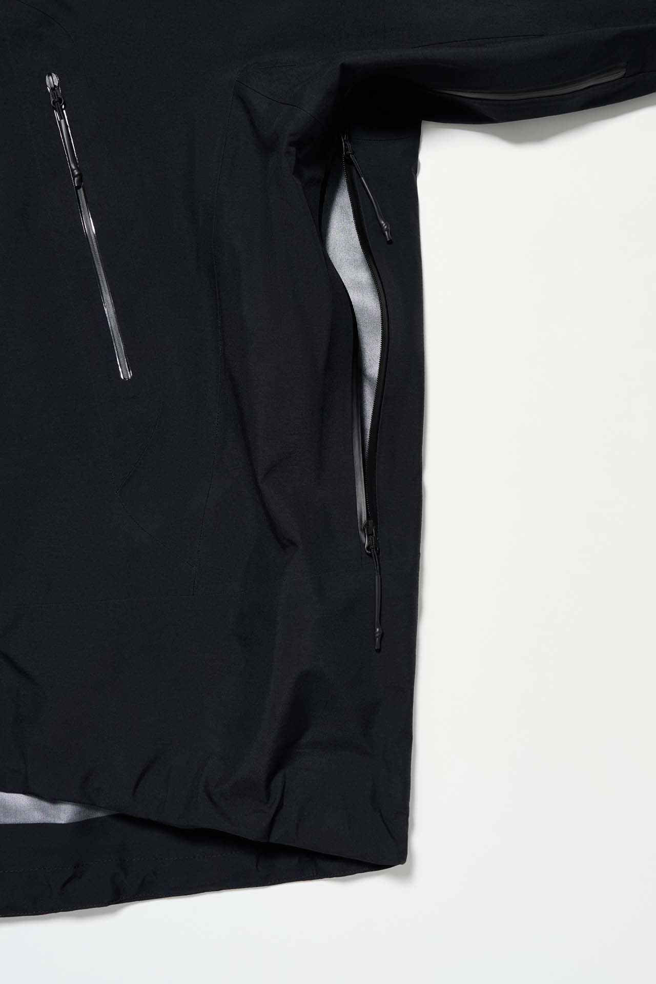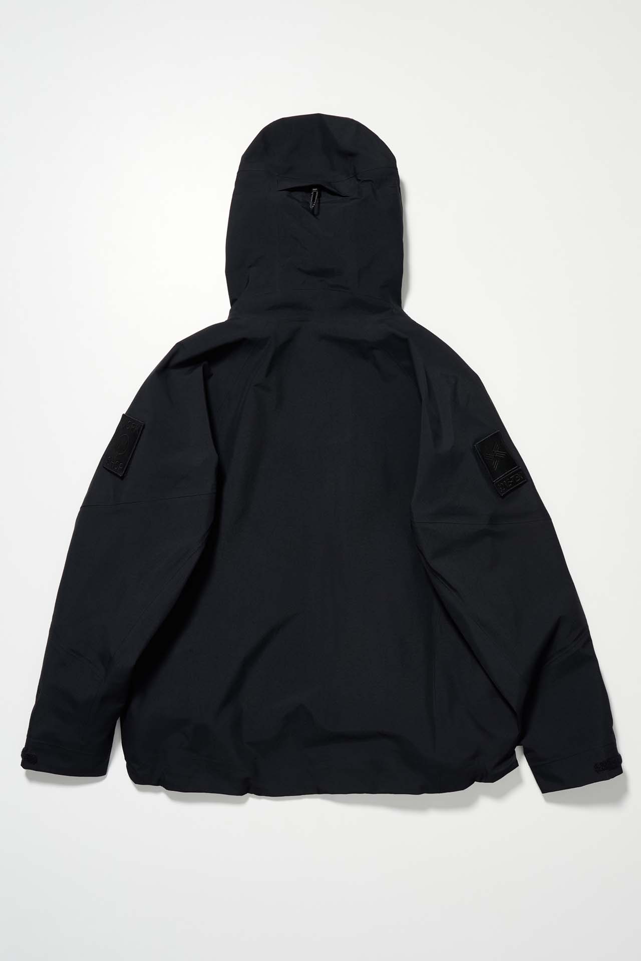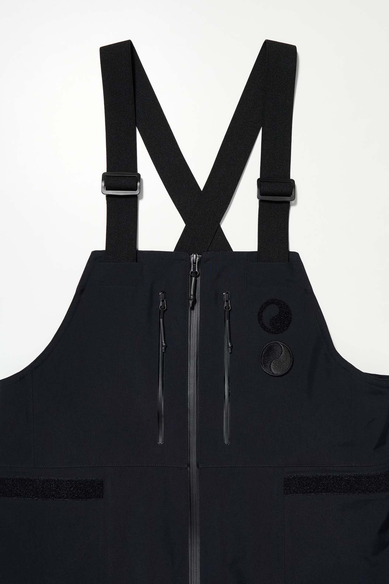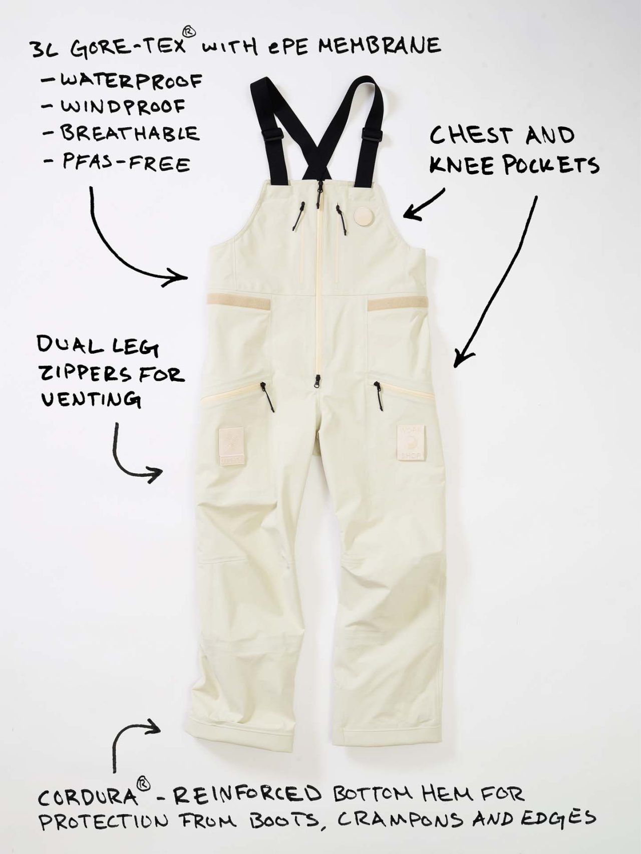 ジェットブラックとボーンホワイトの2色で統一された本コレクションは、山、森、あるいは都市など、いかなる過酷な環境下でも保温性と防水性を保持し、活動に全神経を集中できるよう設計された極めてテクニカルなレイヤリングシステムとなっている。GORE-TEX®︎ (ゴアテックス) 3レイヤー素材のシェルジャケットやビブパンツをはじめ、PERTEX®︎ (パーテックス)、SOLOTEX®︎ (ソロテックス)、POLARTEC®︎ (ポーラテック)、CORDURA®︎ (コーデュラ) といった最高峰の機能素材を組み合わせたプロフェッショナルな仕様に加え、細部に宿るストイックな意匠も WORK SHOP らしい魅力。外側には米軍規格 (ミルスペック) に着想を得た取り外し可能なパッチを配し、内側には各ファブリック・パートナーシップを象徴するリフレクティブ・プリントを施すなど、見えない部分にまで両ブランドの美学が貫かれている。