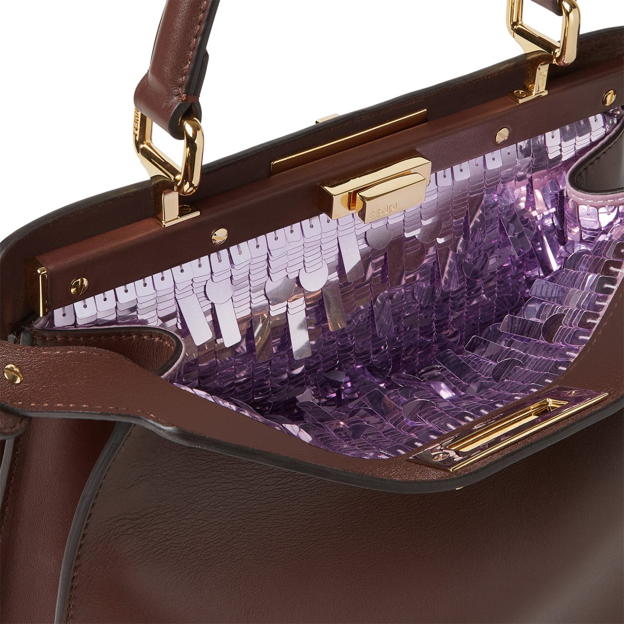 控えめな佇まいのバッグを開くと、内側にはスパンコールやビーズ、スタッズ、クリスタルによる華やかな装飾が広がる。これらの複雑な装飾は、熟練した職人によって細部まで完全に手作業で仕上げられており、なかでもスパンコール装飾には40時間以上を要するなど、FENDI の比類なきクラフツマンシップを物語っている。