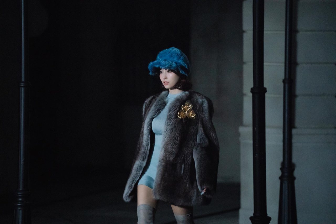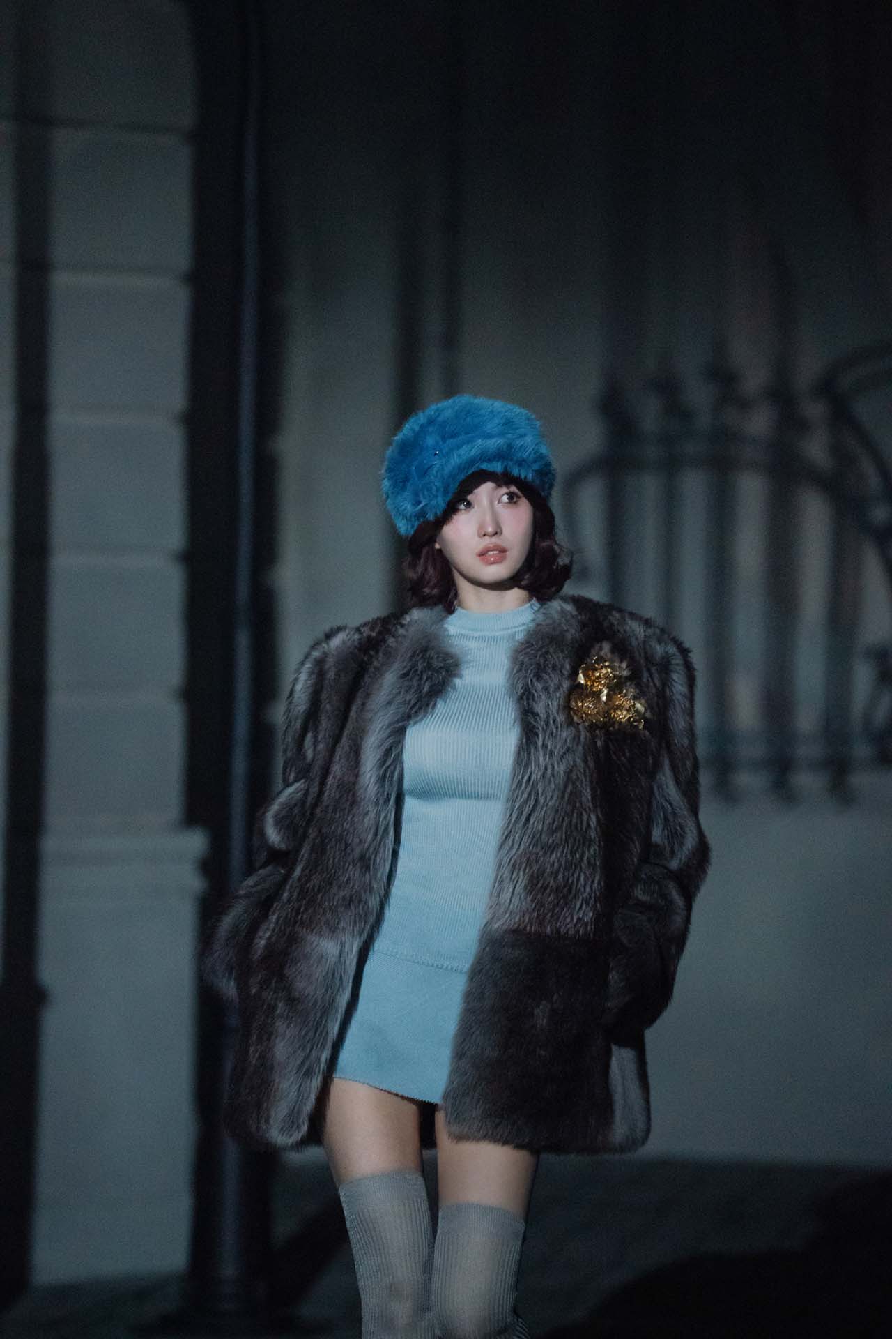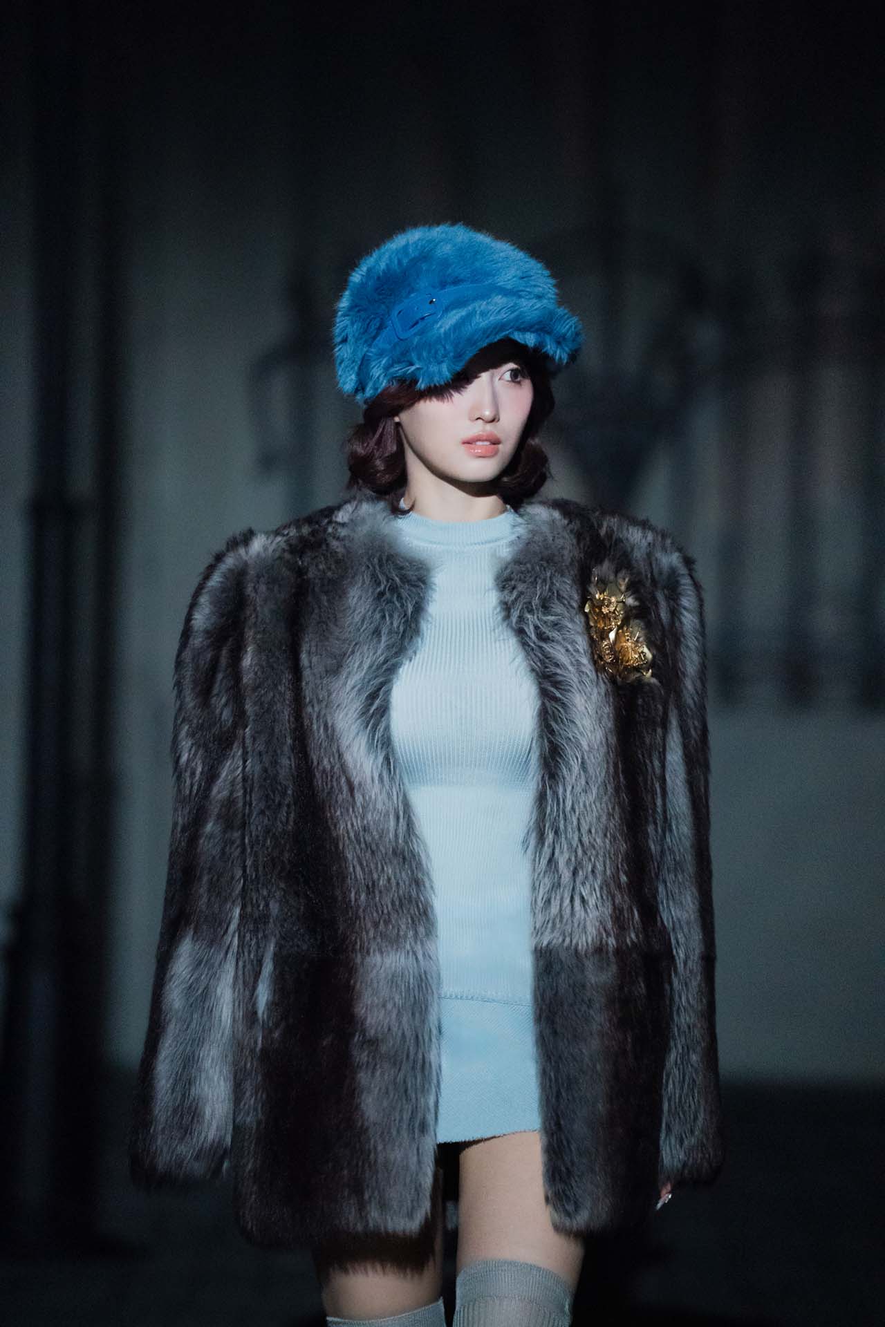 本コラボレーションでひと際存在感を放つのは、ブランドのヘリテージとモダンな感性が融合した、唯一無二のカスタムスタイル。ボリューム感のあるシアリングジャケットや、アーカイブを再解釈した大胆なブルーのエコファーハットを組み合わせ、足元をアイコニックなバレリーナパンプスで引き締めることで、MIU MIU らしい遊び心とエレガンスが共存するルックが完成した。