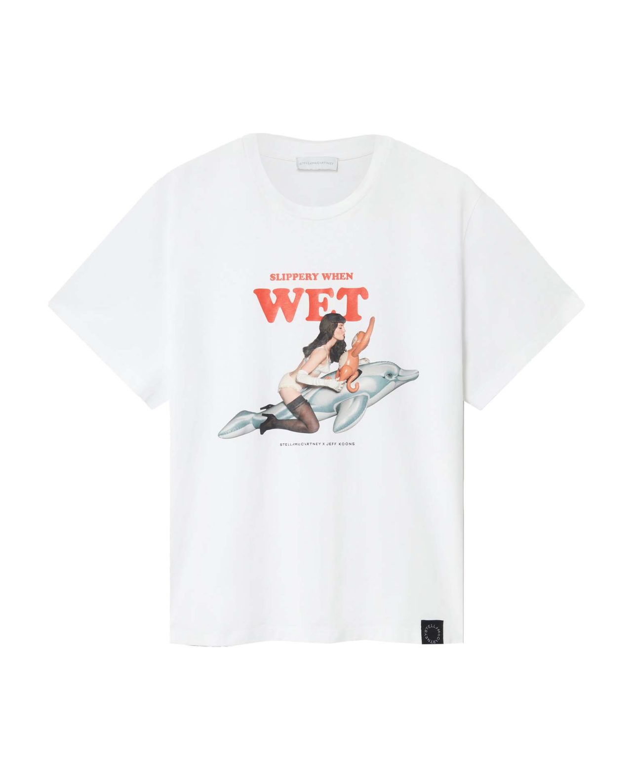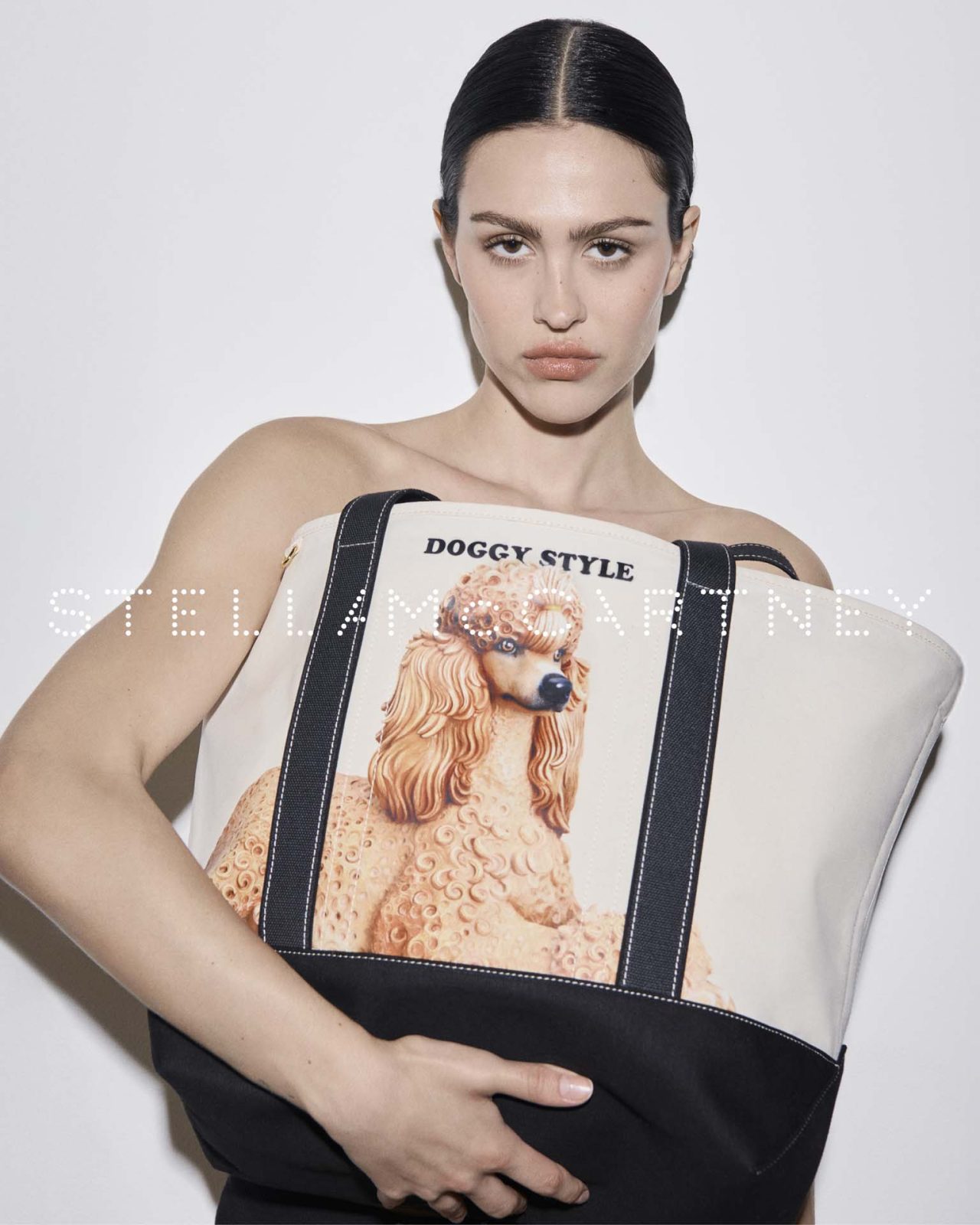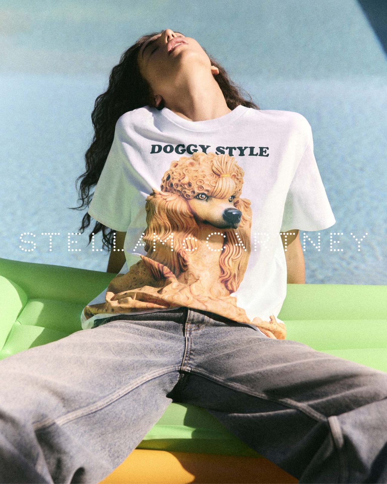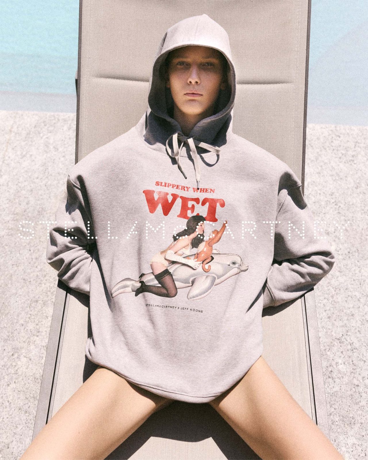 本コレクションの核となるのは、Jeff Koons のアート作品「United (Girl with Dolphin and Monkey)」と、Stella McCartney が2001年の初ランウェイ ショーで掲げたスローガン「Slippery When Wet」を融合させたアイコニックなデザインだ。さらに、Stella McCartney 自身が Jeff Koons の1991年「Made in Heaven」シリーズから選んだヨークシャーテリアのイラストやプードルの彫刻といった作品を投影。「Doggy Style」というユーモアあふれるメッセージと共に、プレイフルかつセクシーな世界観が表現されている。