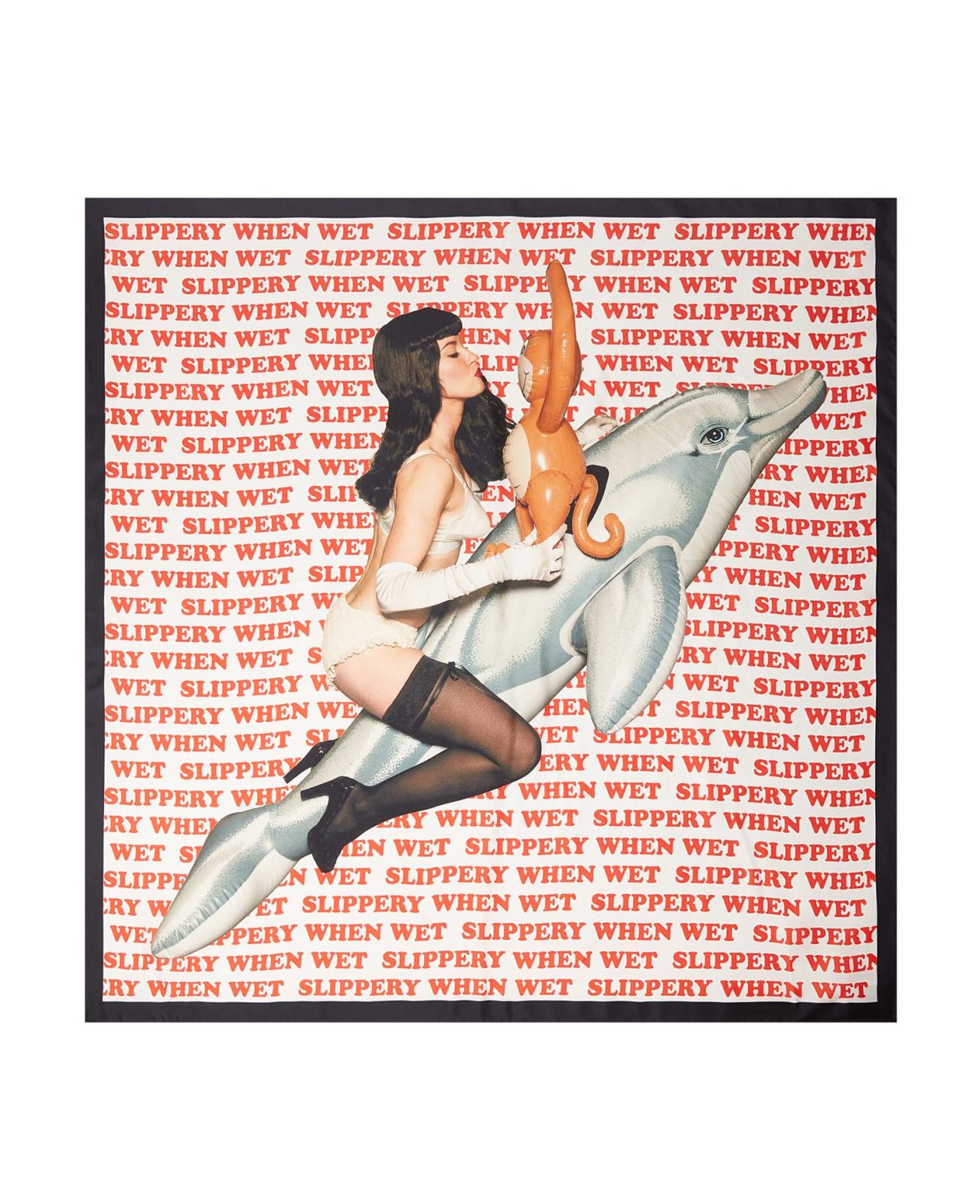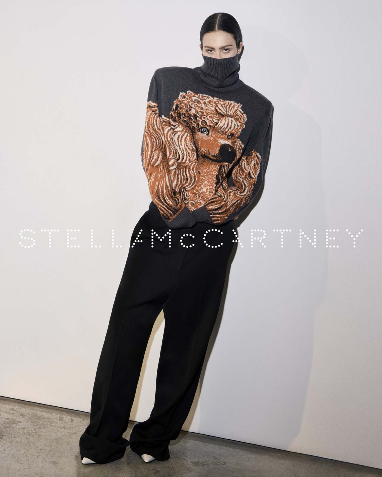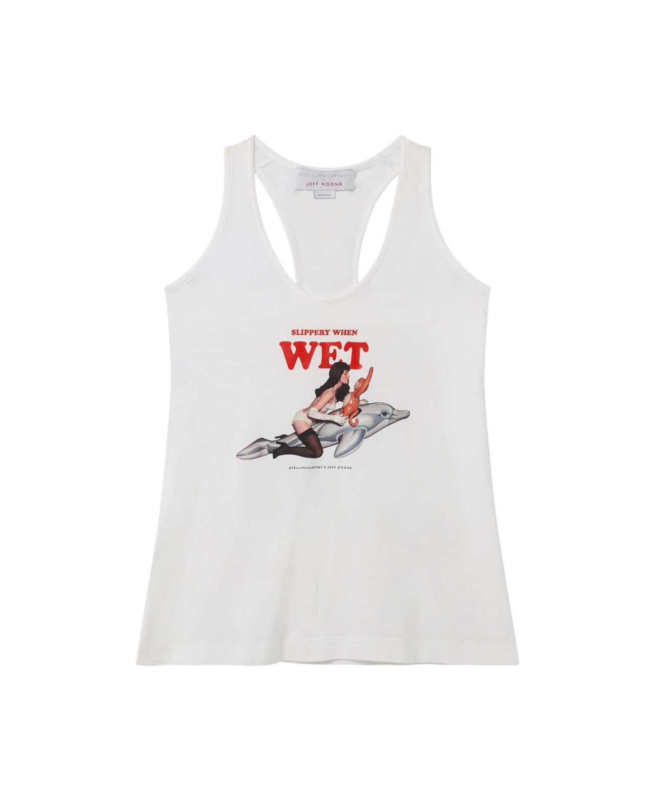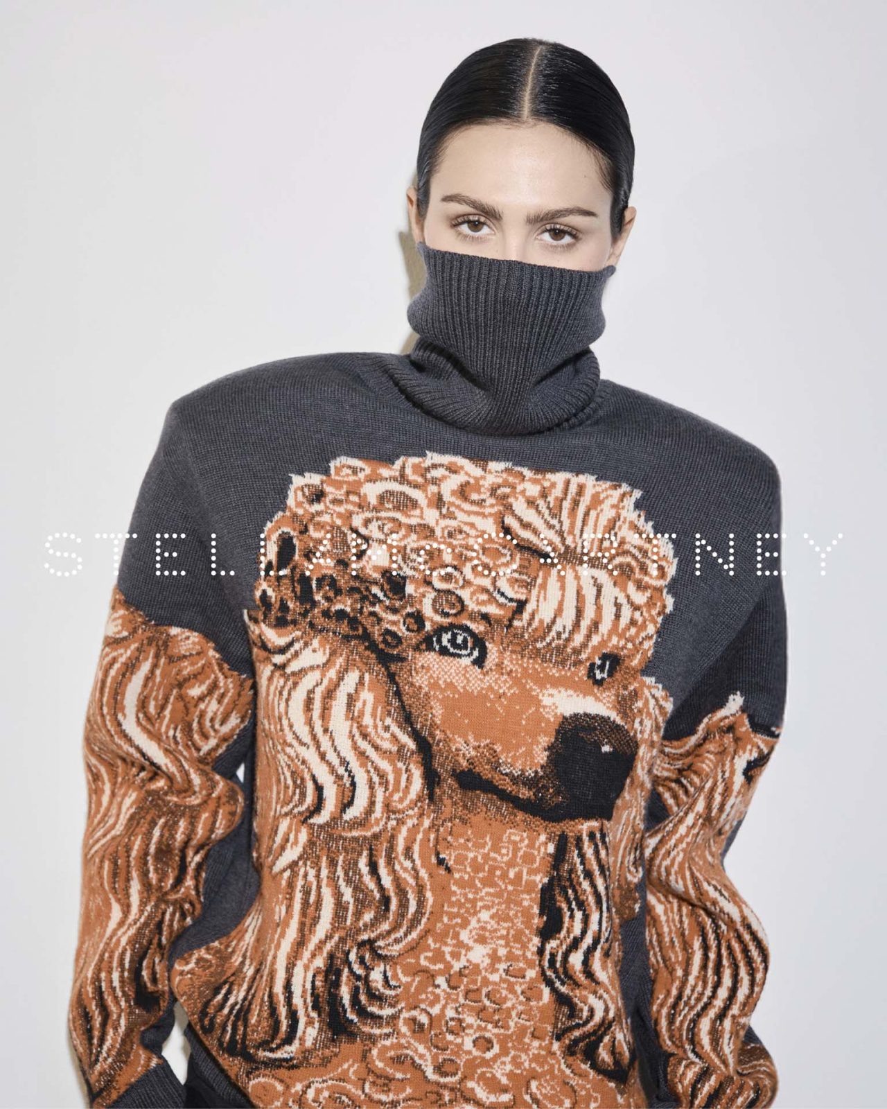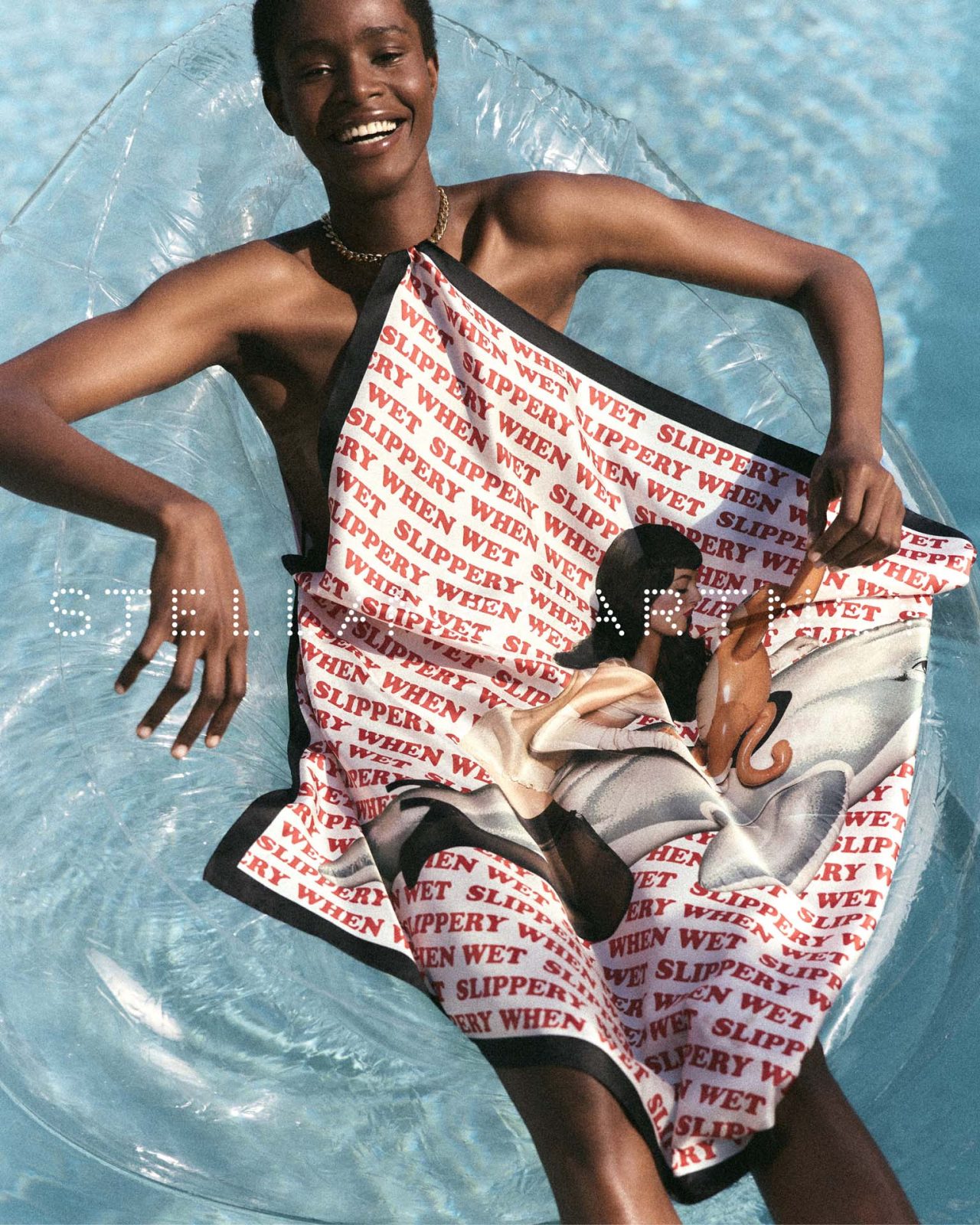 本コレクションの核となるのは、Jeff Koons のアート作品「United (Girl with Dolphin and Monkey)」と、Stella McCartney が2001年の初ランウェイ ショーで掲げたスローガン「Slippery When Wet」を融合させたアイコニックなデザインだ。さらに、Stella McCartney 自身が Jeff Koons の1991年「Made in Heaven」シリーズから選んだヨークシャーテリアのイラストやプードルの彫刻といった作品を投影。「Doggy Style」というユーモアあふれるメッセージと共に、プレイフルかつセクシーな世界観が表現されている。
