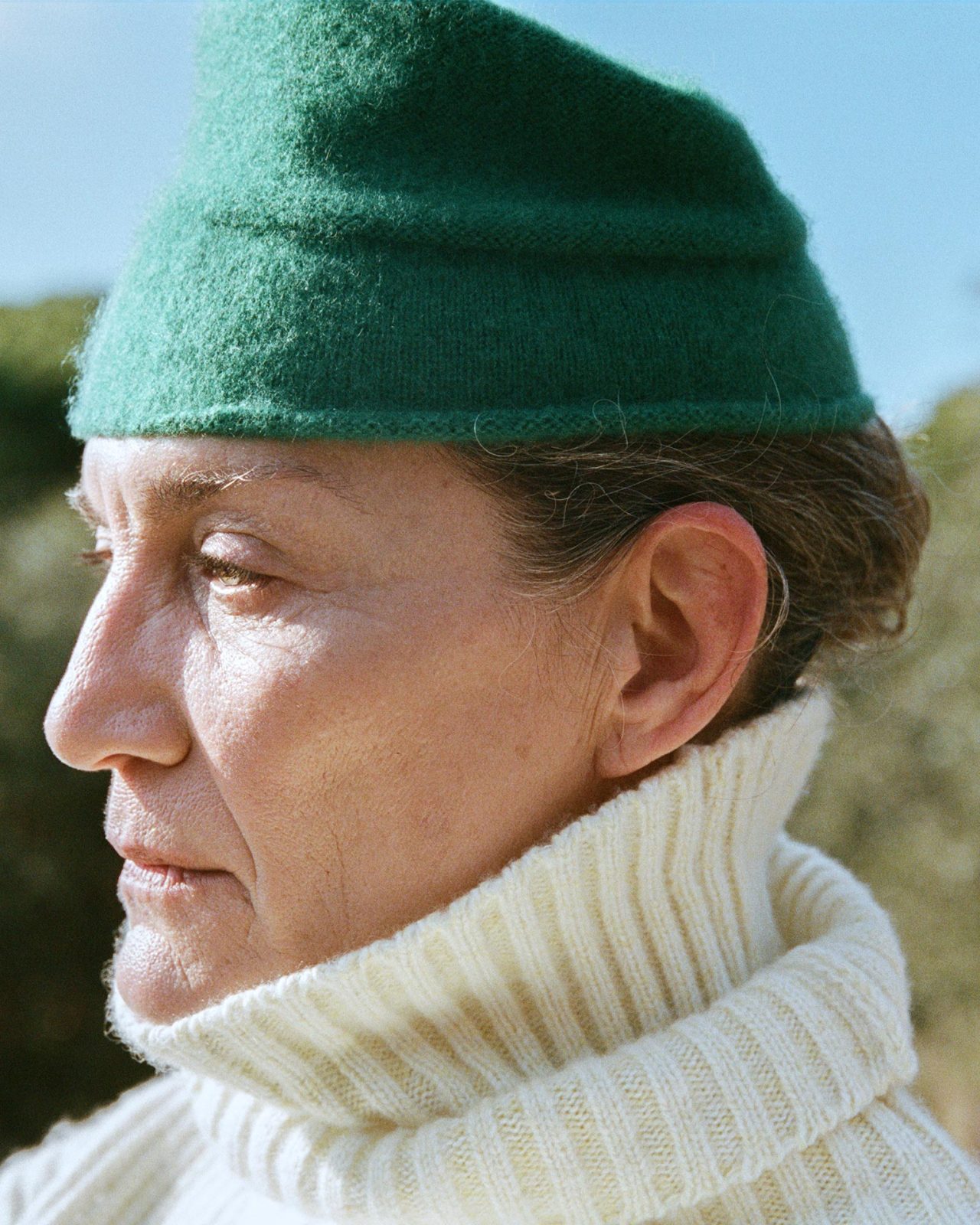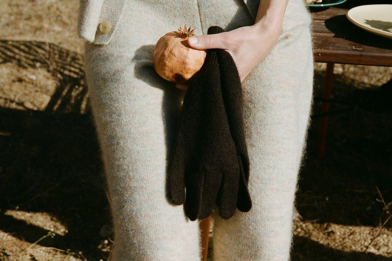 カラーパレットには、大地を想像させる落ち着いた色を軸に、隠れた鮮やかなキノコを見つけた瞬間のような意外性のある色彩も添えられる。メランジ調のアースカラーのカシミアニットに、アップルグリーンやディープパープルが加わり、ジャカードニットにはぼかしたキノコのモチーフが施されている。