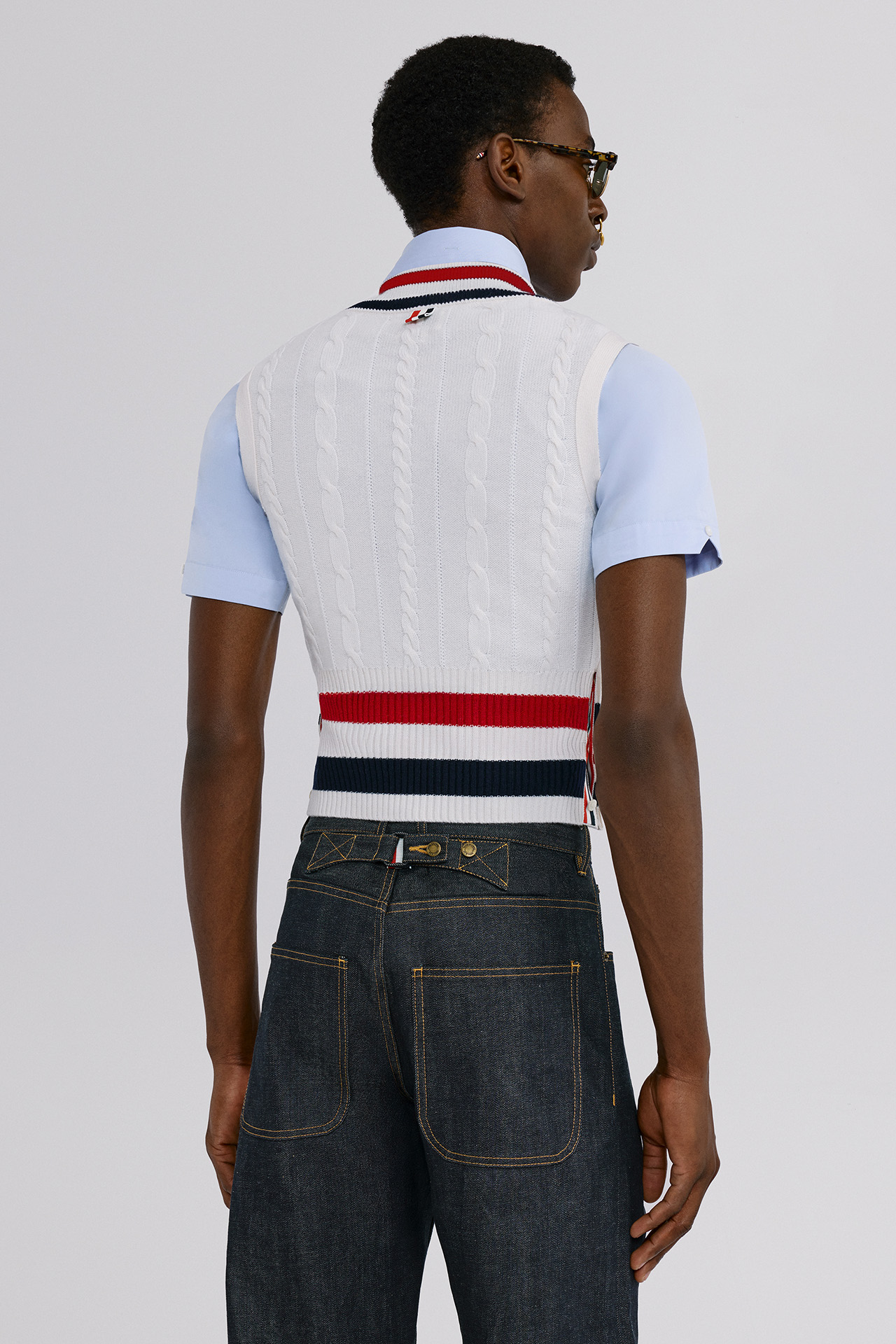 ジャケットの袖口にはトリコロールのグログランがさりげなく配されるなど、クラシックな佇まいのなかに Thom Browne ならではのコードが随所に施されている。裾はヴィンテージライクなチェーンステッチで仕上げられ、高い耐久性と実用性も実現。美しいテーラリングとワークウェアの風格が洗練された調和を生み出している。