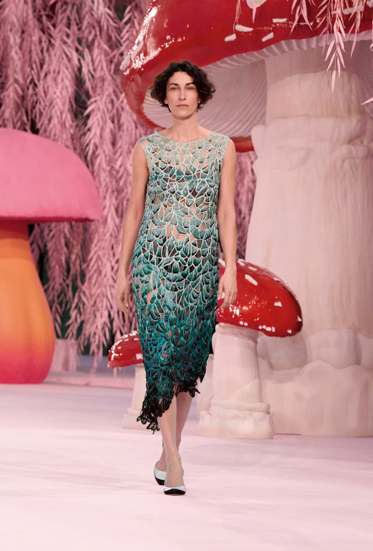 物語は、鮮やかな「変容」へと向かう。女性たちは、漆黒のカラス、鳩、ヘラサギ、オウムといった鳥へと姿を変えていく。CHANEL が誇る職人技術の殿堂「le19M (ル ディズヌフエム)」の職人たちが手がけた精緻な刺繍やプリーツは、あえて羽を使わずに羽の質感を具現化し、オートクチュールの無限の可能性を証明してみせた。