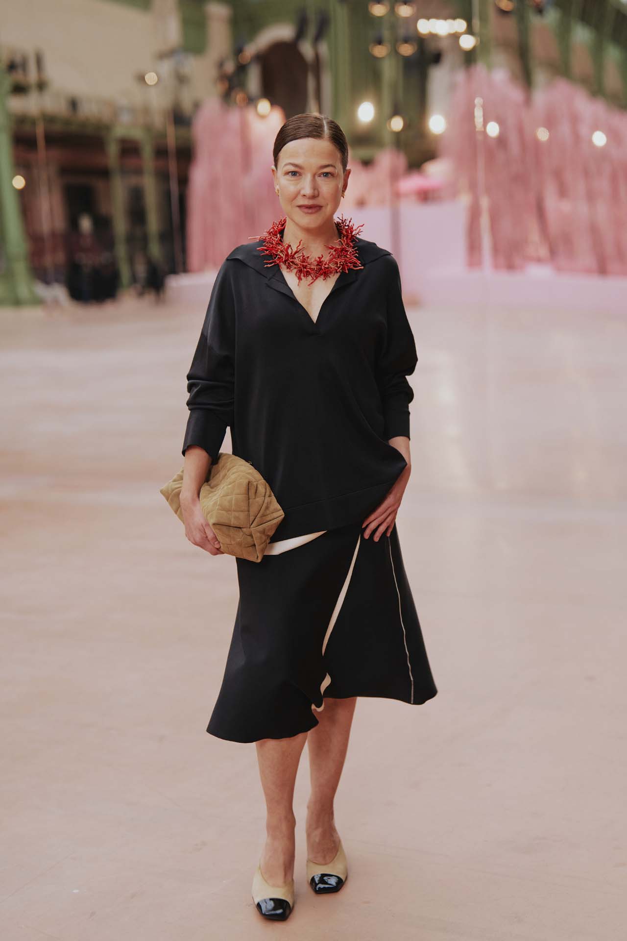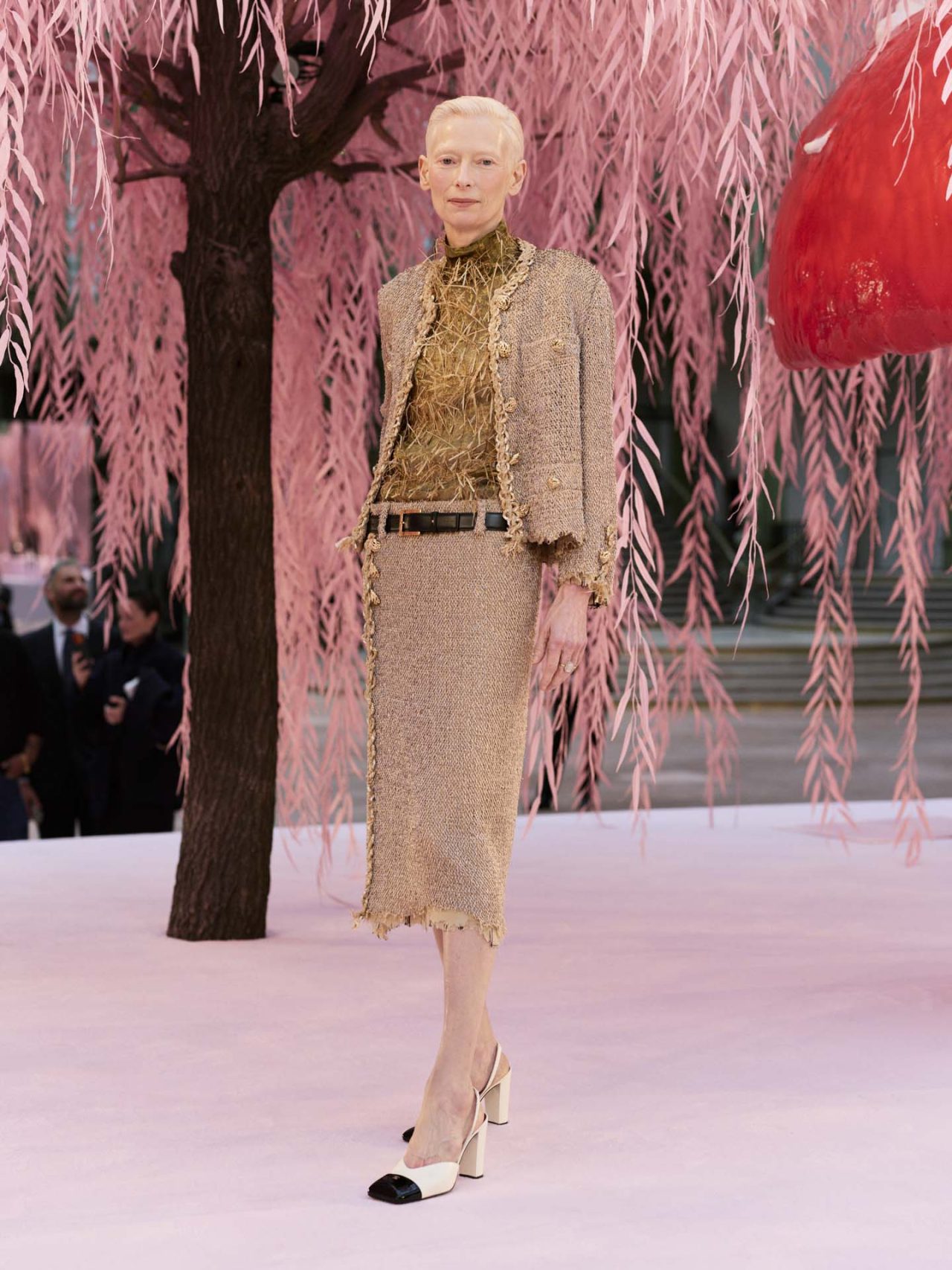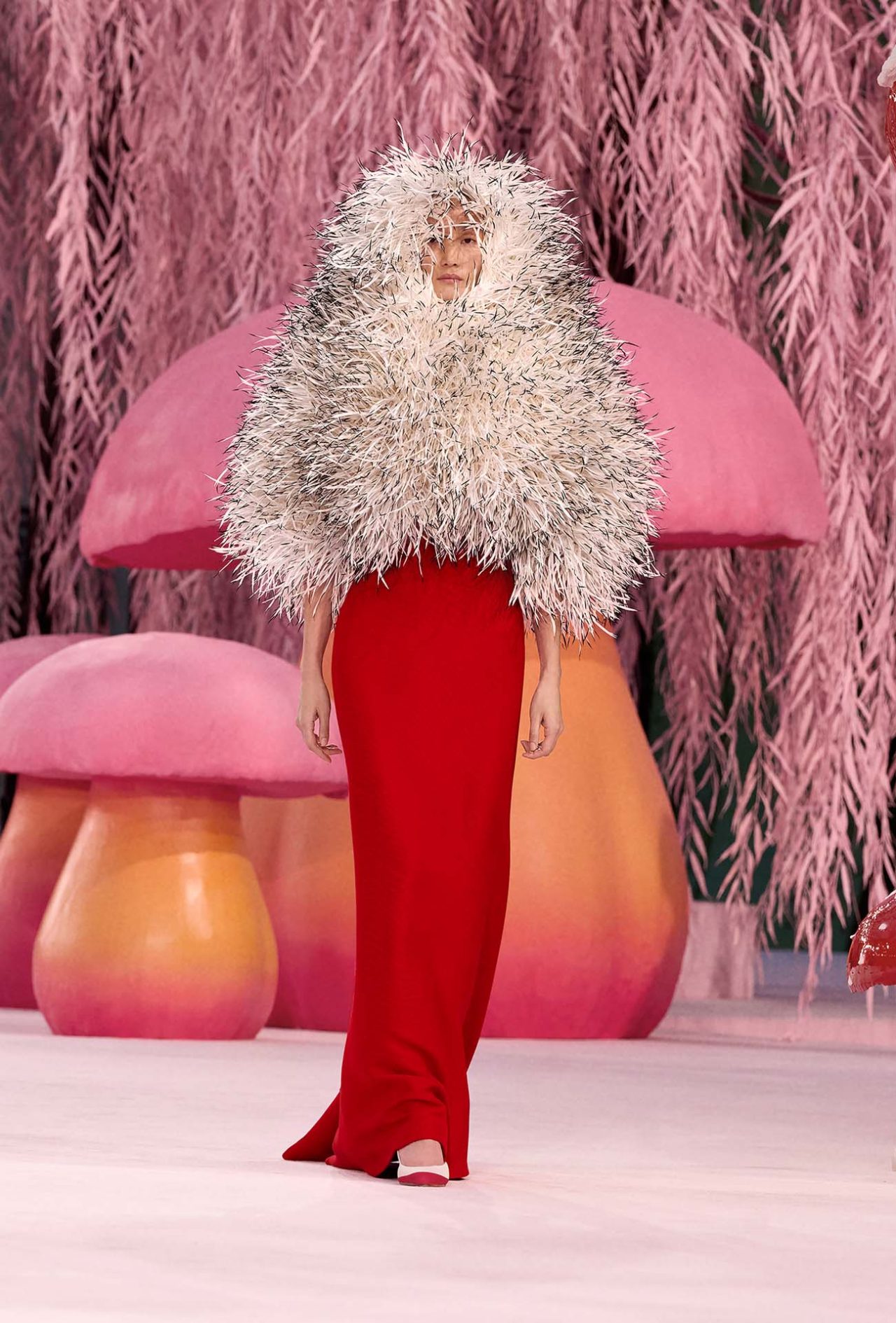 本コレクションの着想源となったのは、シンプルながら深遠な意味を宿す「俳句」の精神だ。Matthieu Blazy は、様式化された自然や永遠へと昇華された刹那を、オートクチュールの技巧を通して表現。ショーの幕開けを飾ったのは、削ぎ落とされた透明感のあるシルクモスリンのスーツ。そこに、No.5のボトルや深紅の口紅といったメゾンの記憶が、着る人自身のストーリーと交錯するように散りばめられている。