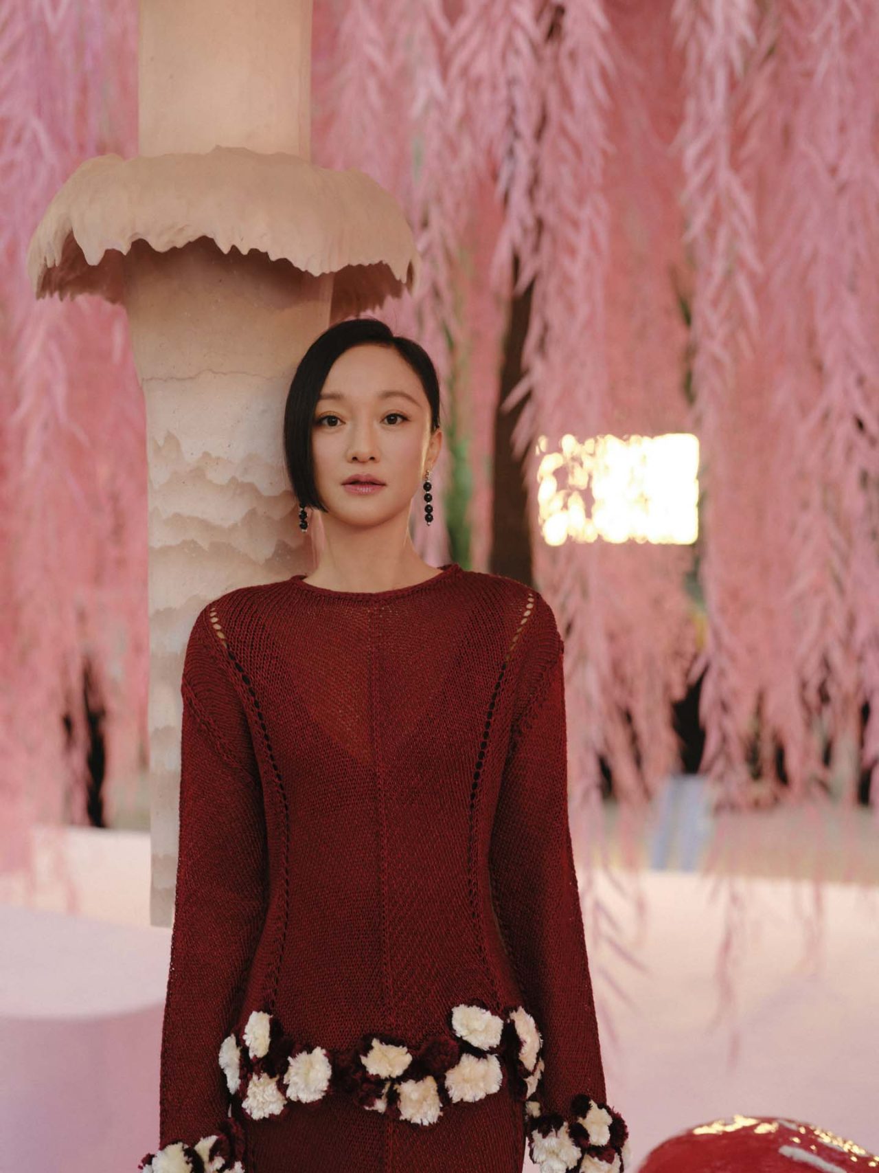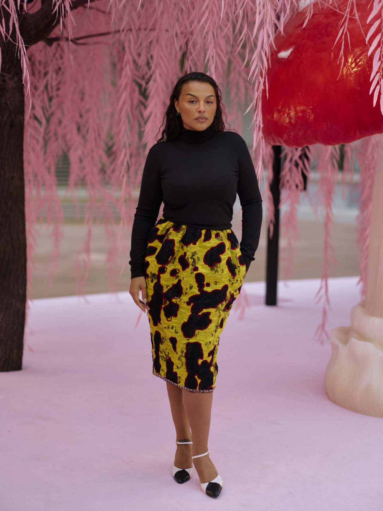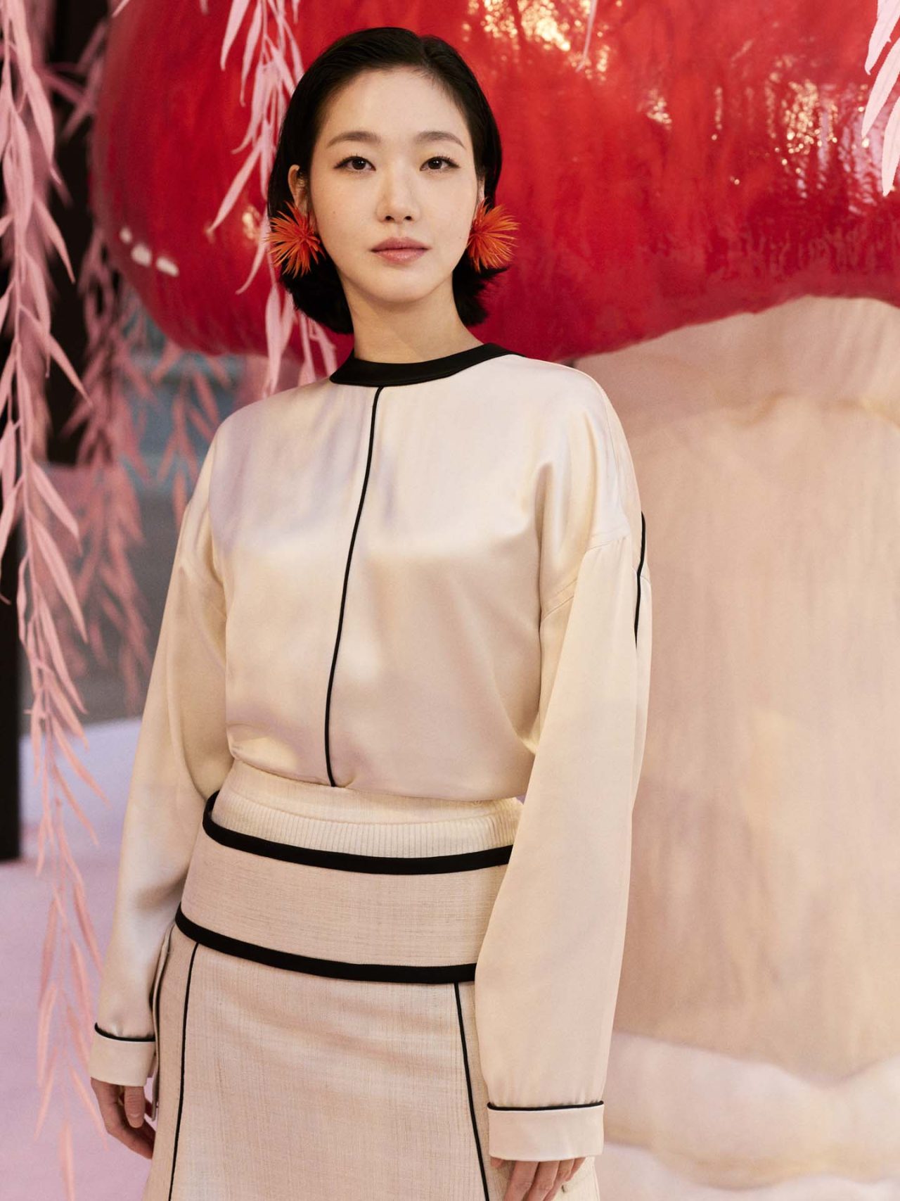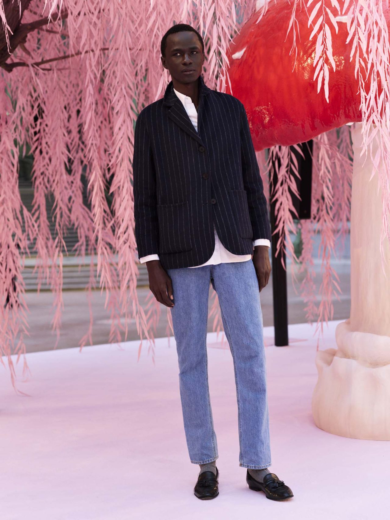本コレクションの着想源となったのは、シンプルながら深遠な意味を宿す「俳句」の精神だ。Matthieu Blazy は、様式化された自然や永遠へと昇華された刹那を、オートクチュールの技巧を通して表現。ショーの幕開けを飾ったのは、削ぎ落とされた透明感のあるシルクモスリンのスーツ。そこに、No.5のボトルや深紅の口紅といったメゾンの記憶が、着る人自身のストーリーと交錯するように散りばめられている。