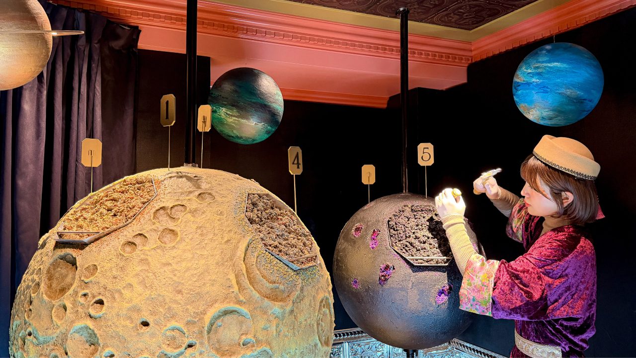 そんな小楽園が今年用意するのは、チョコレートでできた「もうひとつの宇宙」。竹取物語にインスピレーションを受けて作られた「チョコレート銀河」から、「もうひとつの月」や「謎の小惑星」など5種類の「天体のかけら」が削り出され、からくり人形の手によって運ばれてくる。天体のかけらは、月や惑星、 ブラックホールなどをモチーフにしたチョコレートで、味も見た目も、そしてストーリーもそれぞれ異なるのが特徴だ。また、壁から生えた「小楽園の蛇口」からは、月の海をイメージした特製チャイが流れる。