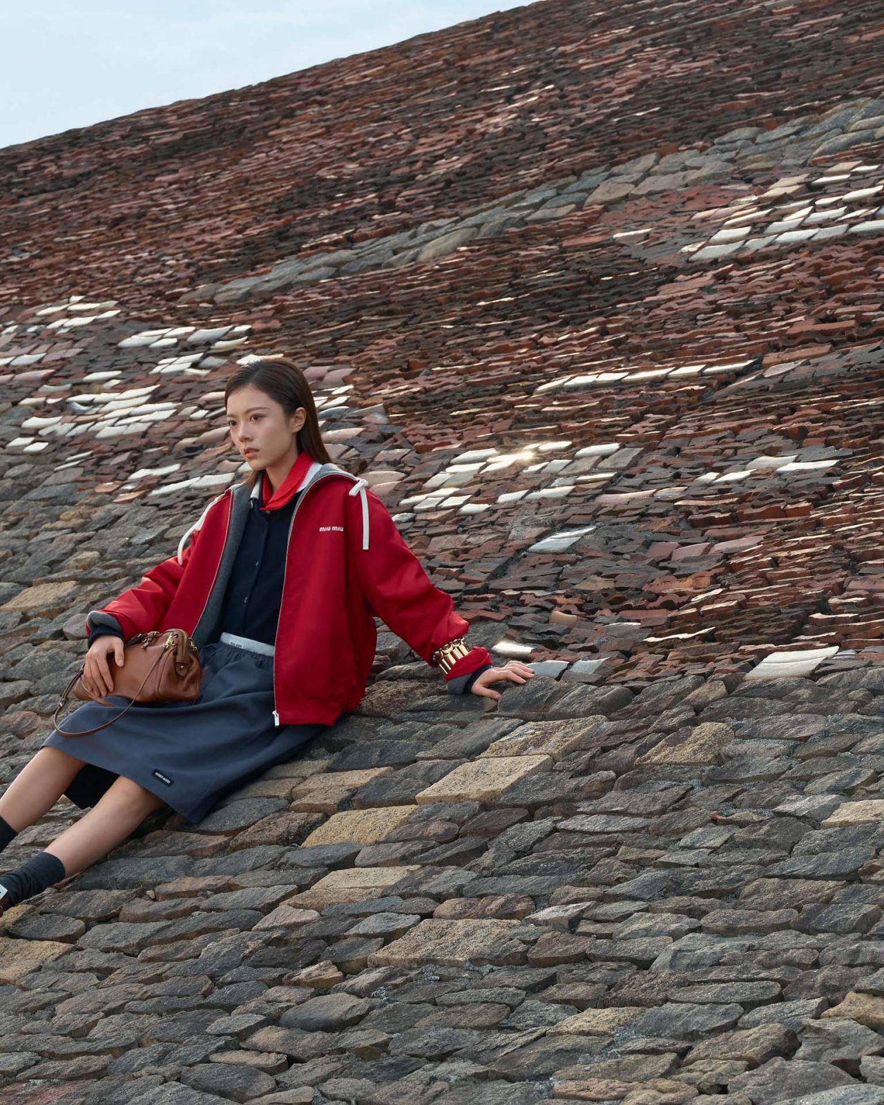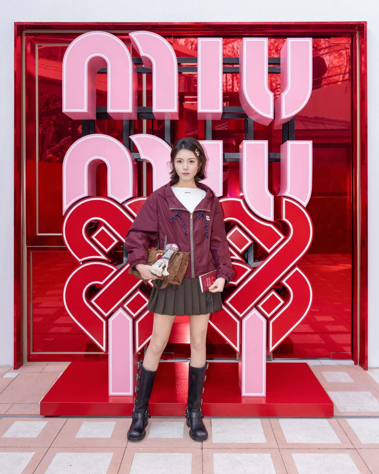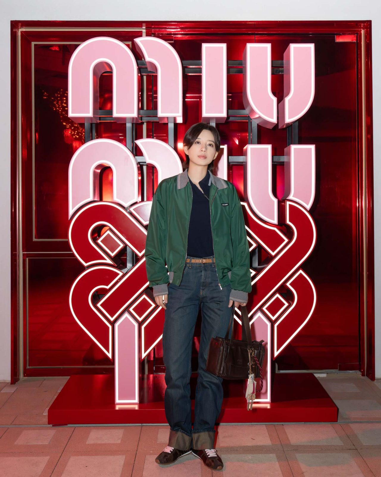 アクセサリーでは、2026年春夏ランウェイに登場したスエードのユーティリティバッグや、「ワンダー」「アルカディ」といったアイコンバッグが、幸運と繁栄の象徴であるレッドやメタリックシルバーで彩られた。足元には、タッセルやフラワーモチーフのマイクロチャームでカスタマイズを施した「プリューム」スニーカーが登場。一歩ごとに揺れるパーソナルなディテールが、MIU MIU らしい遊び心と個の自立を象徴している。