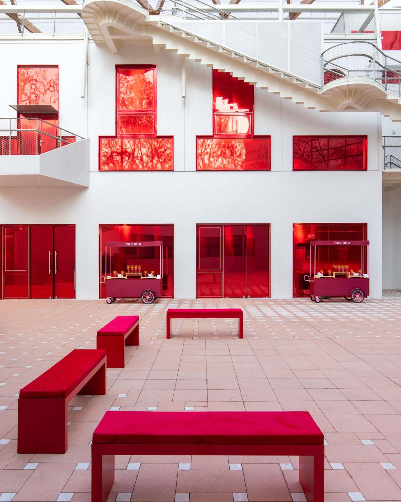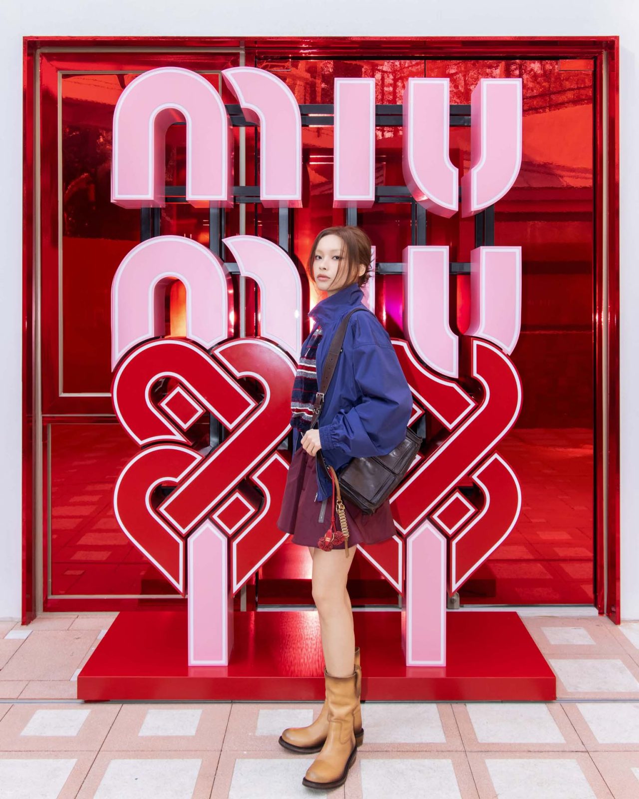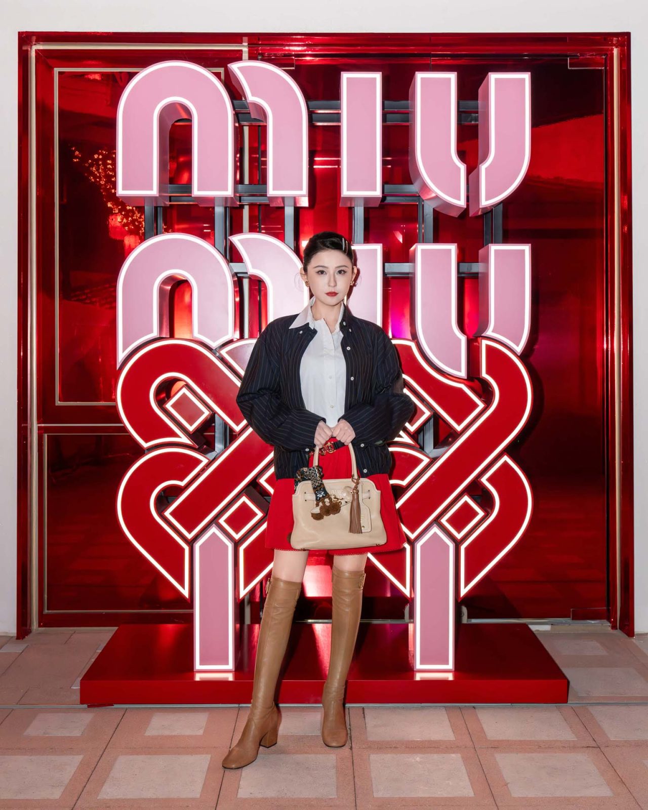 アクセサリーでは、2026年春夏ランウェイに登場したスエードのユーティリティバッグや、「ワンダー」「アルカディ」といったアイコンバッグが、幸運と繁栄の象徴であるレッドやメタリックシルバーで彩られた。足元には、タッセルやフラワーモチーフのマイクロチャームでカスタマイズを施した「プリューム」スニーカーが登場。一歩ごとに揺れるパーソナルなディテールが、MIU MIU らしい遊び心と個の自立を象徴している。