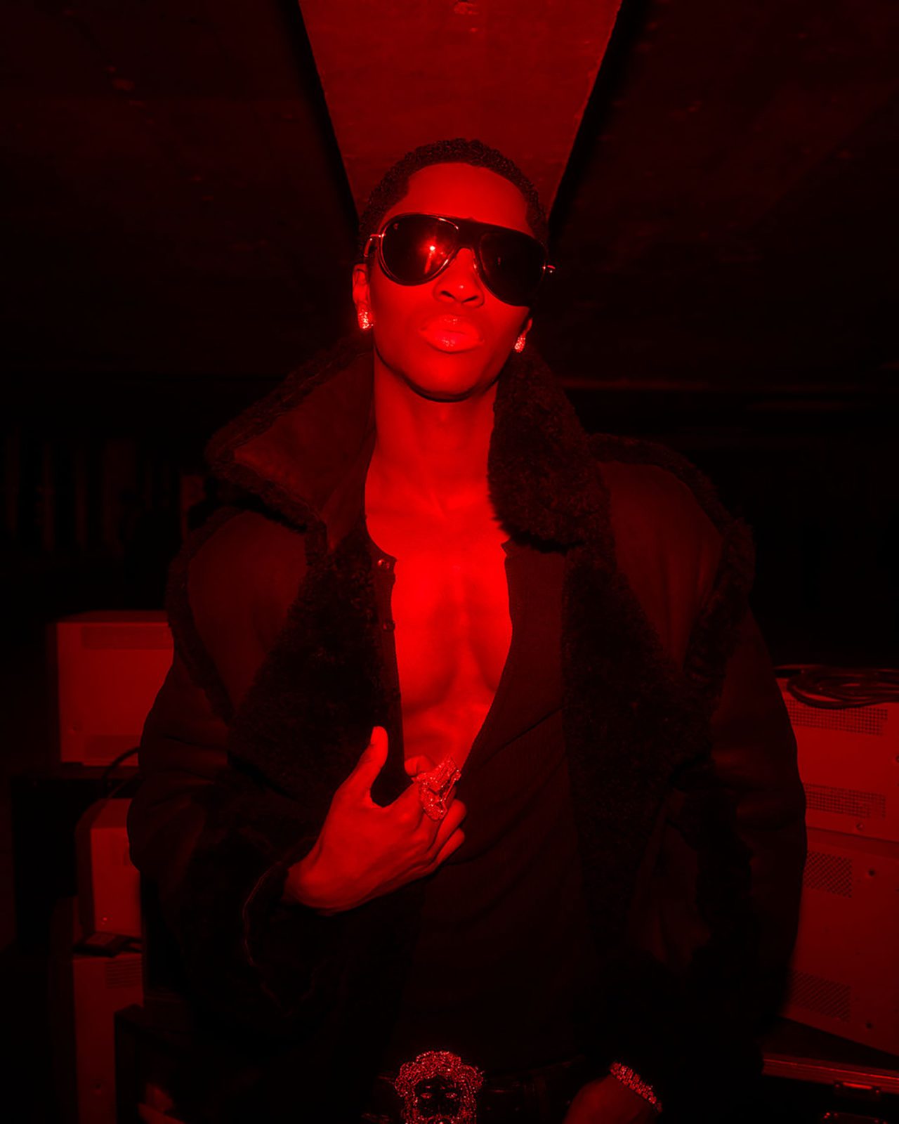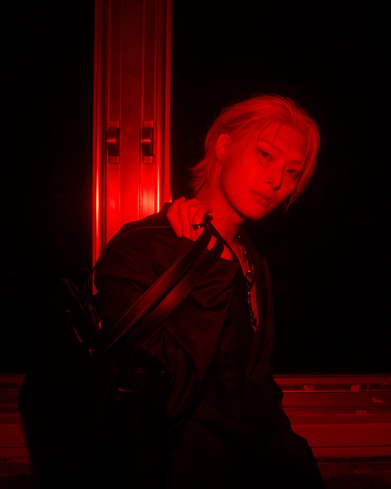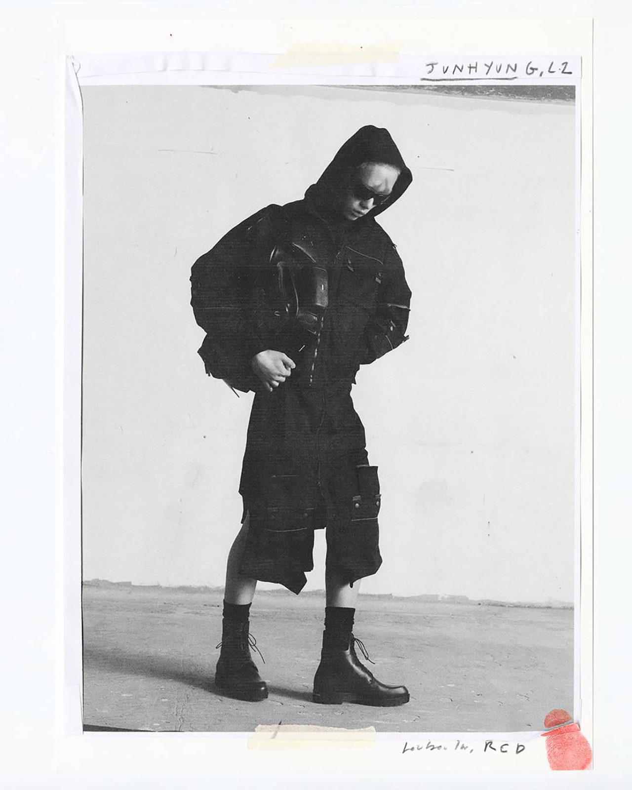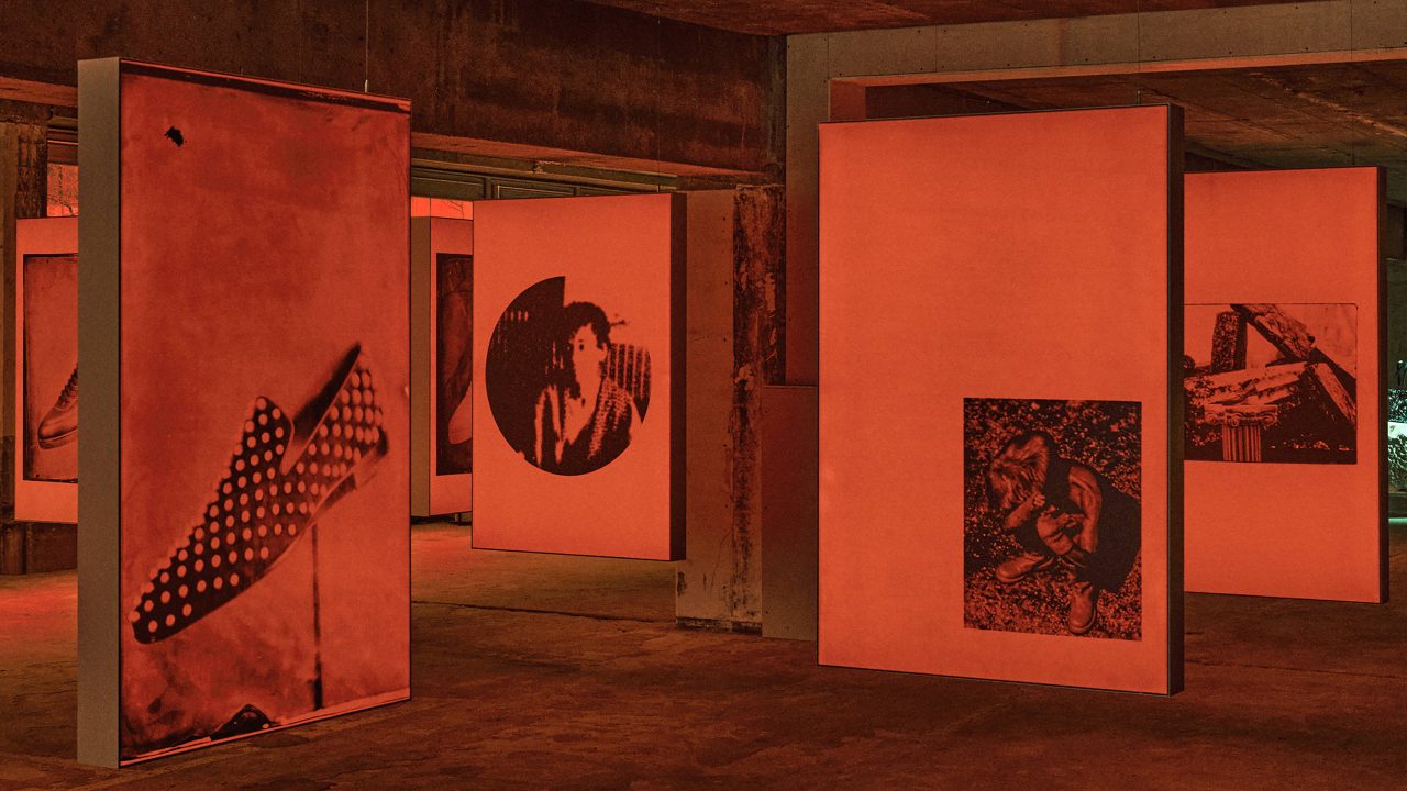 続くフォト・インスタレーションでは、Jaden Smith によるピースを紹介。その一部は初期の写真技法を用いて撮影され、布の下で撮影された後、銀と化学溶液による手作業の現像によってフォルムが浮かび上がる。選ばれた写真は、メゾンのシグネチャーを想起させる赤い光に照らされたネガとしてプリントされ、作品に独特の緊張感を与えている。