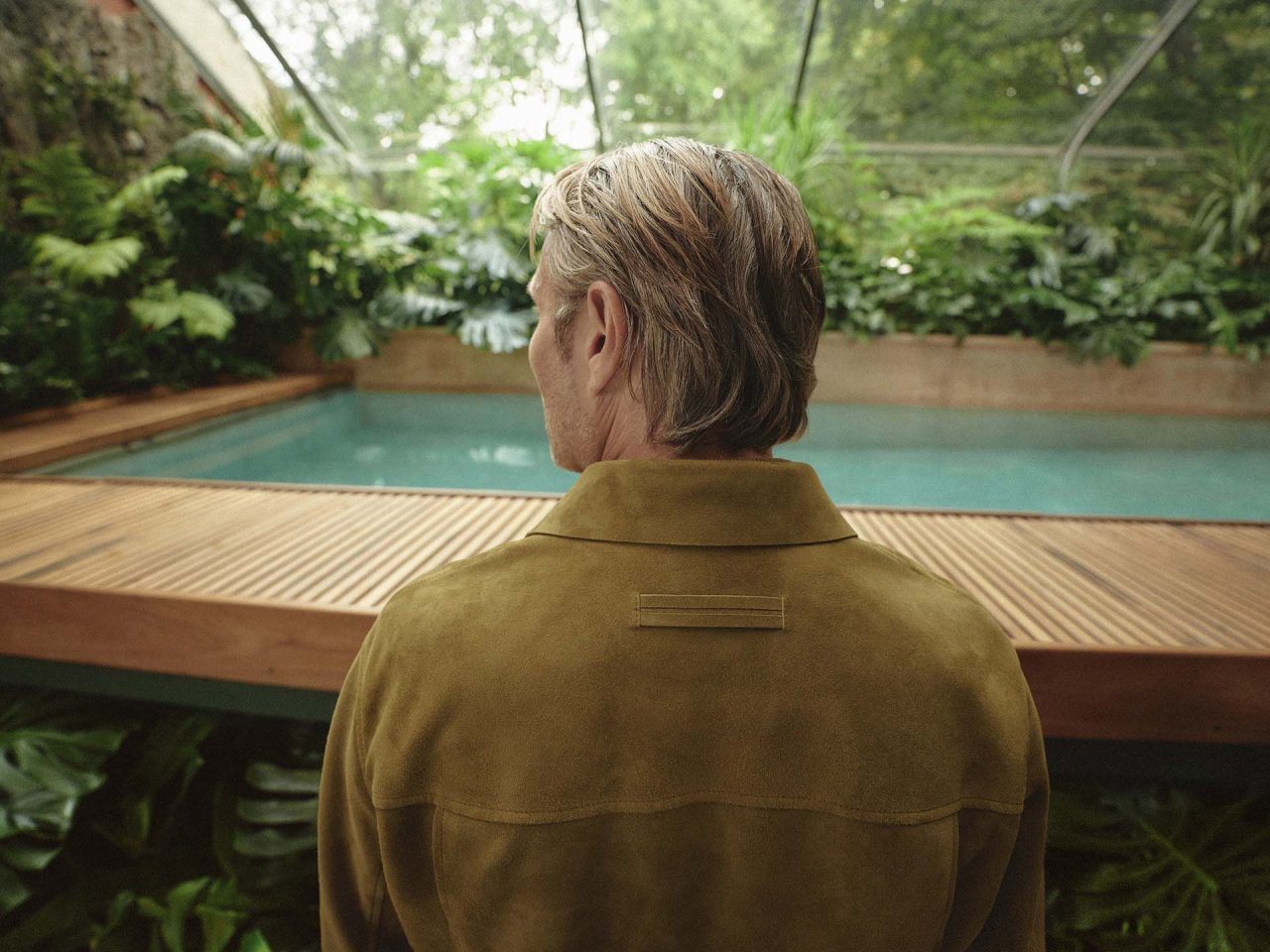 2026春夏コレクションは、この環境、ライフスタイル、デザインが対話する精神を素材とフォルムによって表現している。Mads Mikkelesen が纏うのは、世界各地の希少な超細番手ウールである Vellus Aureum (ヴェリュス・オウレウム) や、しなやかで精緻なセカンドスキンレザーといった、テキスタイル研究の粋を集めたファブリックだ。