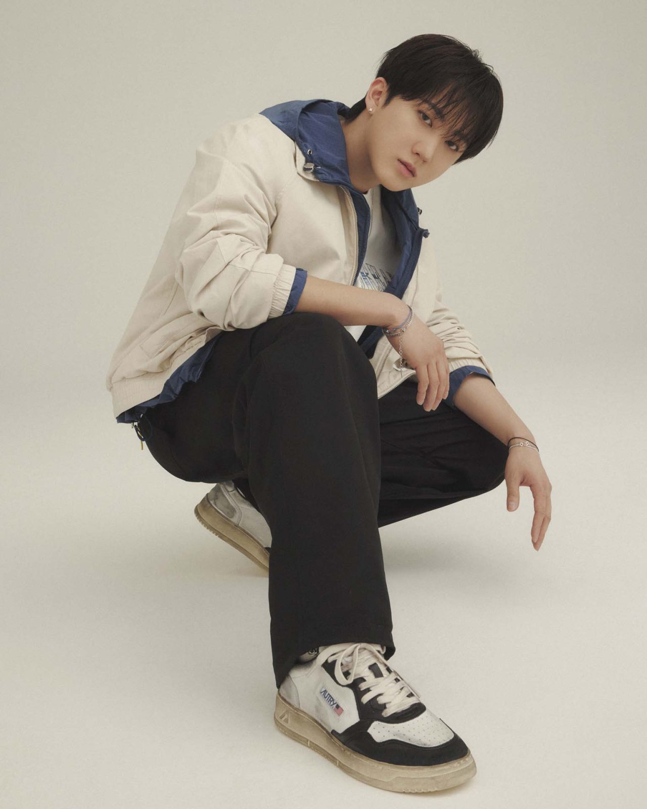 本ビジュアルでは、ポロスウェットやブルゾンといったクラシックなカレッジスタイルを、Changbin がエフォートレスに纏っている。足元を彩るのは、80年代のテニスシューズを現代的に再解釈したアイコンモデル「Super Vintage Medalist (スーパー ヴィンテージ メダリスト)」だ。上質なカーフレザーを用い、イタリアの熟練職人が一足ずつ手作業で施す独自のダメージ加工が、唯一無二の深みとヴィンテージ感を演出している。