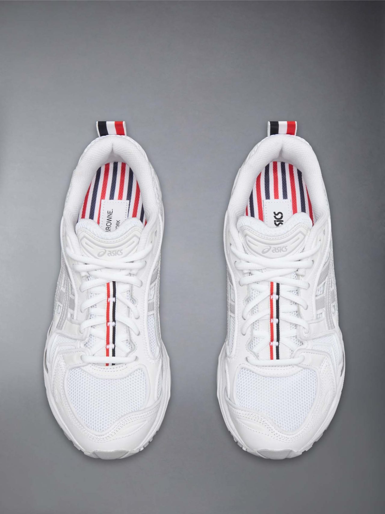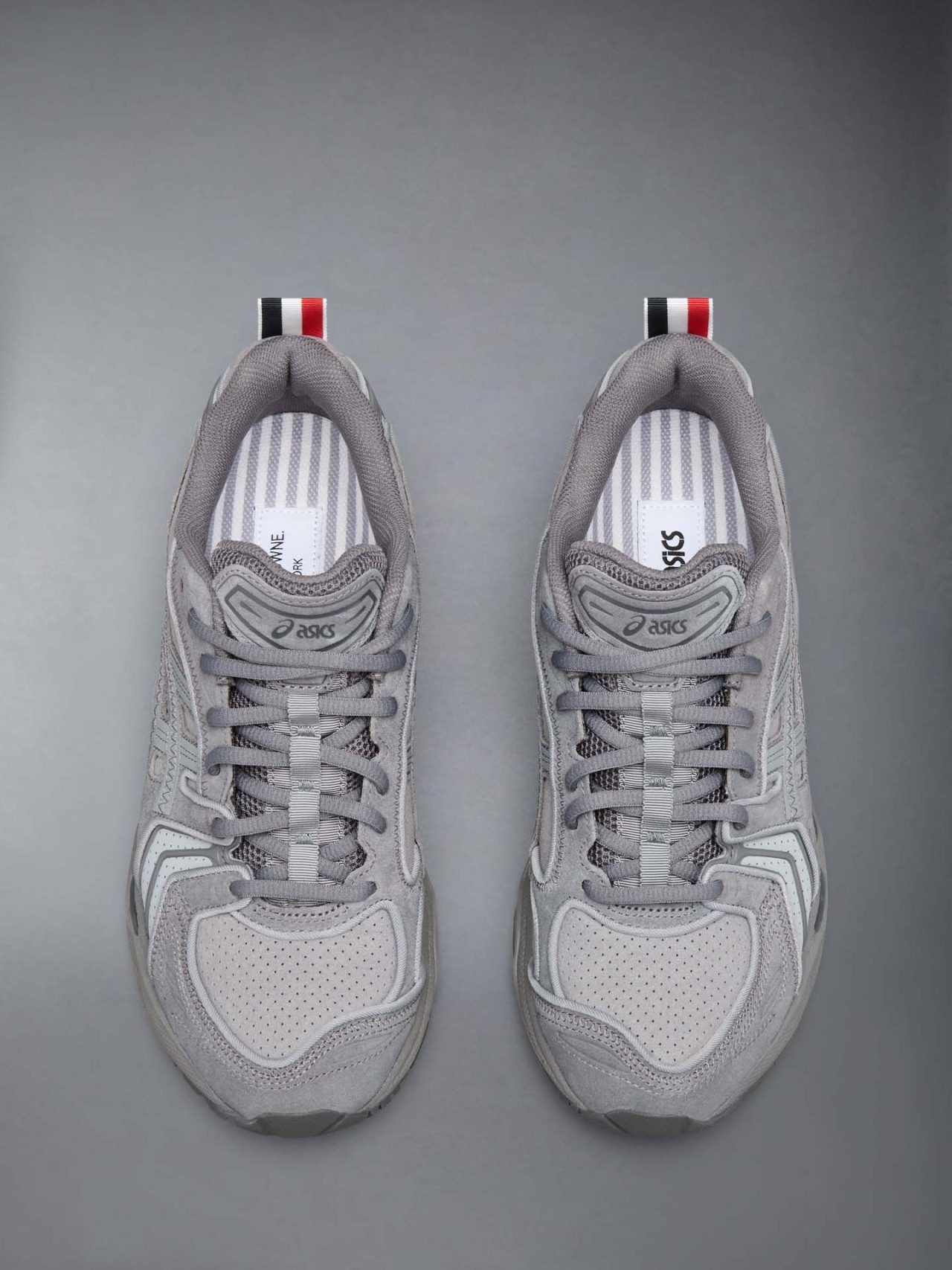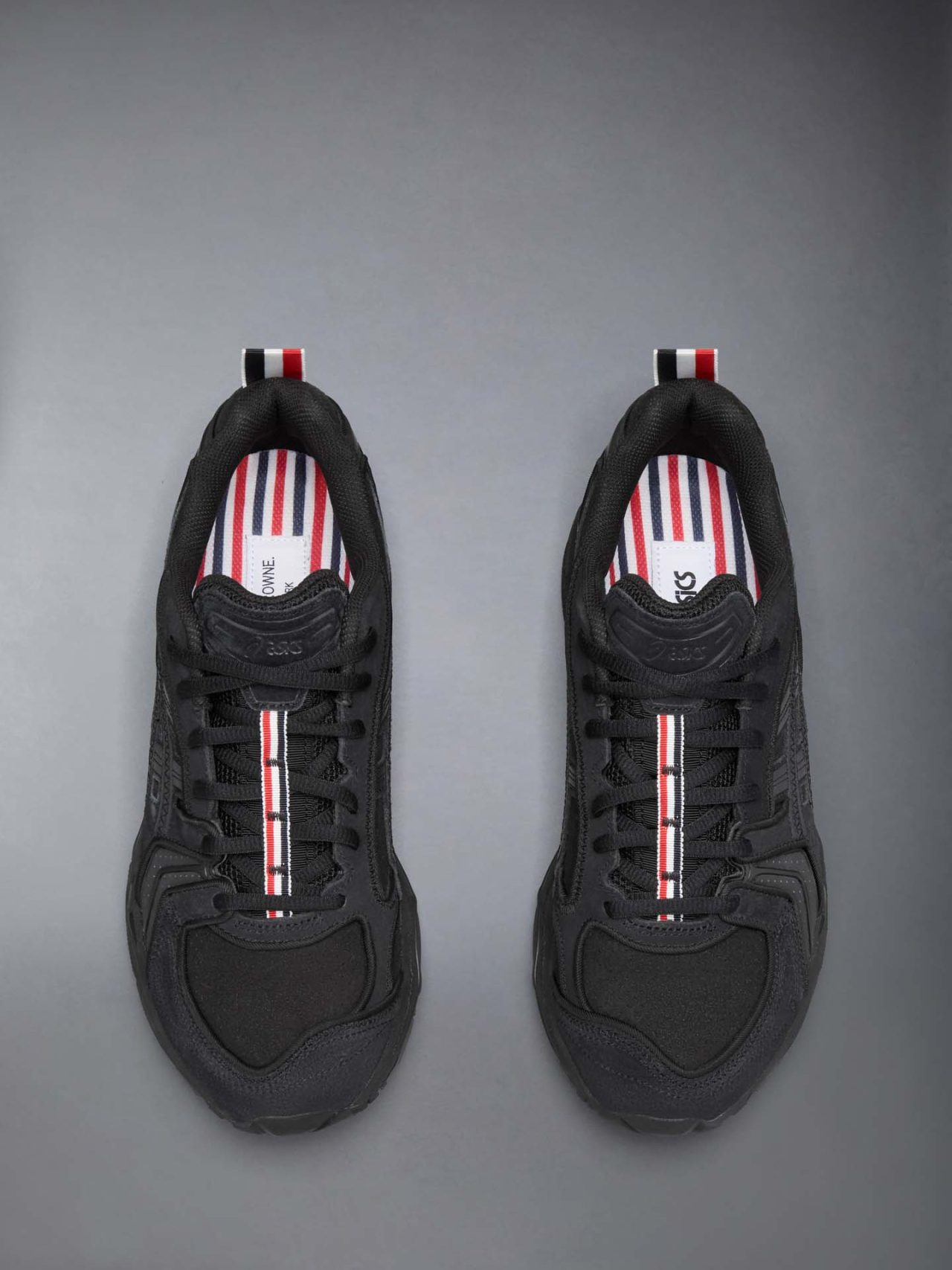本コラボレーション「THOM BROWNE for ASICS Sportstyle」の着想源となったのは、デザイナーの Thom Browne (トム・ブラウン) 自身のスポーツヘリテージだ。大学時代に水泳と長距離走の選手として活躍した彼が獲得した「メダル」へのオマージュとして、レースキャッチには象徴的なグログランテープがあしらわれている。
