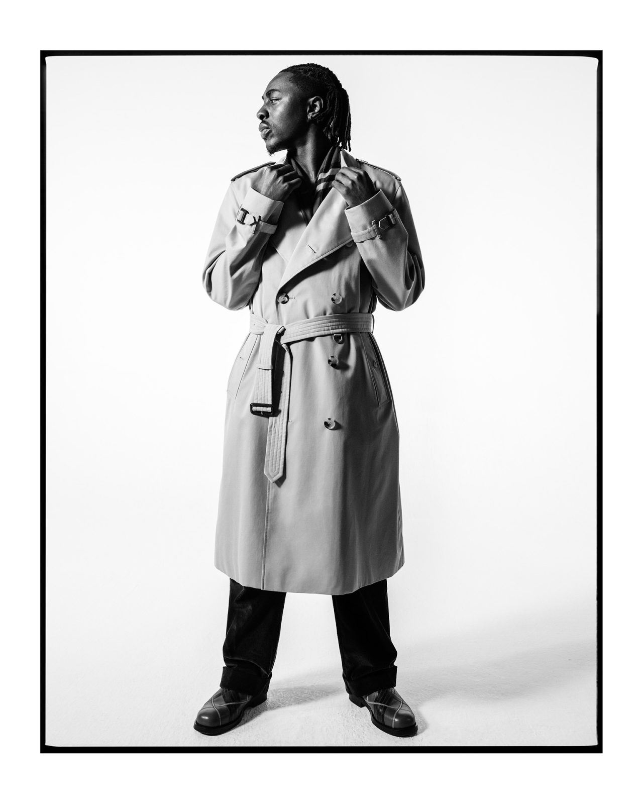 彼らは、トレンチコートのヘリテージコレクションや、アーカイブを再構築し、新たにデザインされたアイテムを羽織り、襟を立てたりベルトをラフに結んだりと、自由なスタイリングで内なるエレガンスを引き立てている。