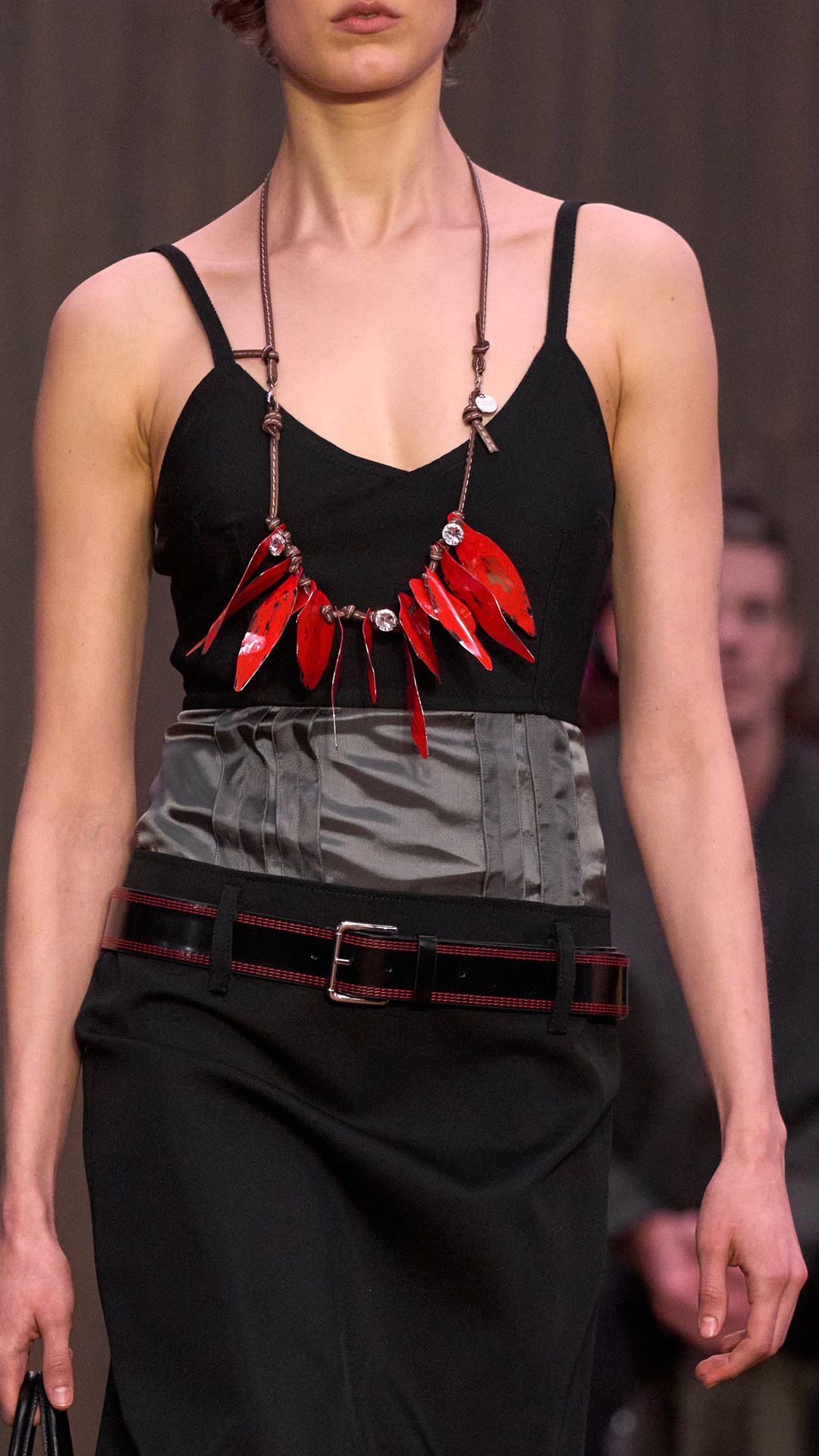 コレクションではミラノに隣接するプレアルプス山脈の登山カルチャーから着想を得て、スポーツウェアを再解釈したルックが登場。インダストリアルな素材や繊細なオーガンザ、サテンなどが、レザーと合わせられ、独自の調和を生み出している。