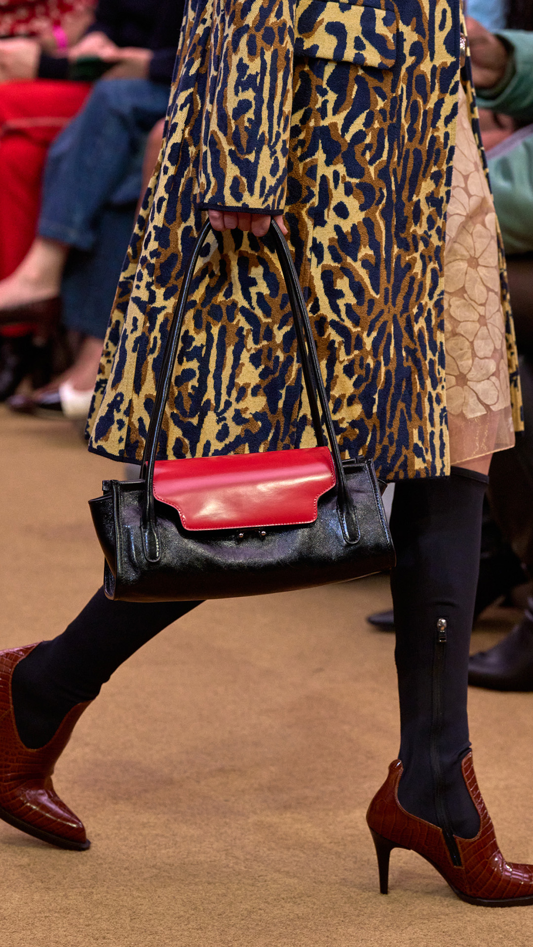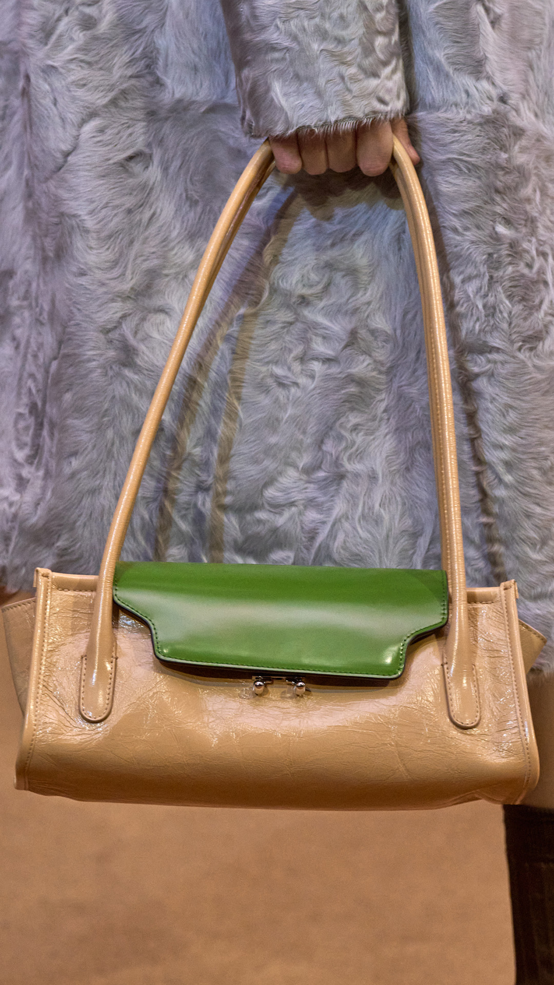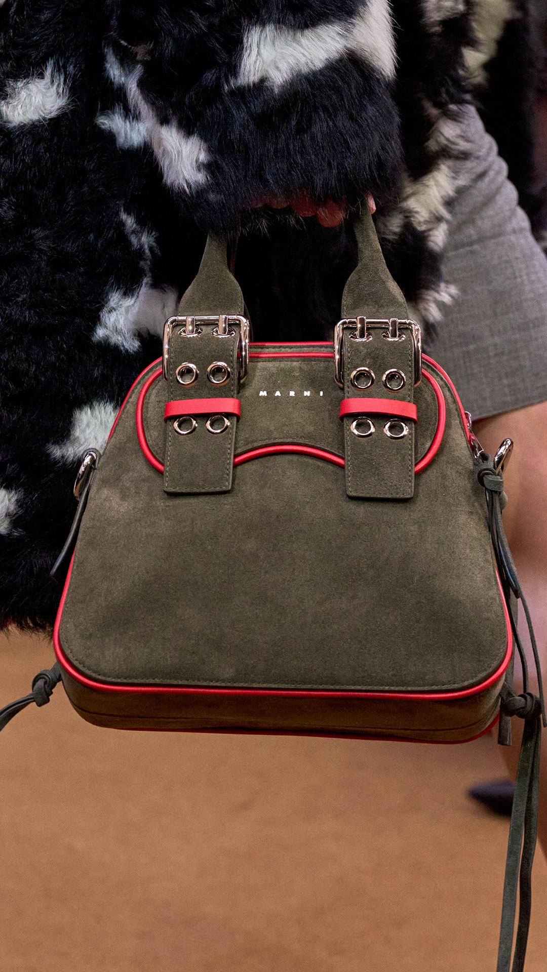MARNI のヘリテージと Rogge のパーソナルな記憶が交錯する本コレクション。アーカイブのエッセンスを随所に散りばめながら、対照的なカラーや異素材のコンビネーション、縫い代を表に出すディテールなどを通して、新たなスタイルが提示されている。