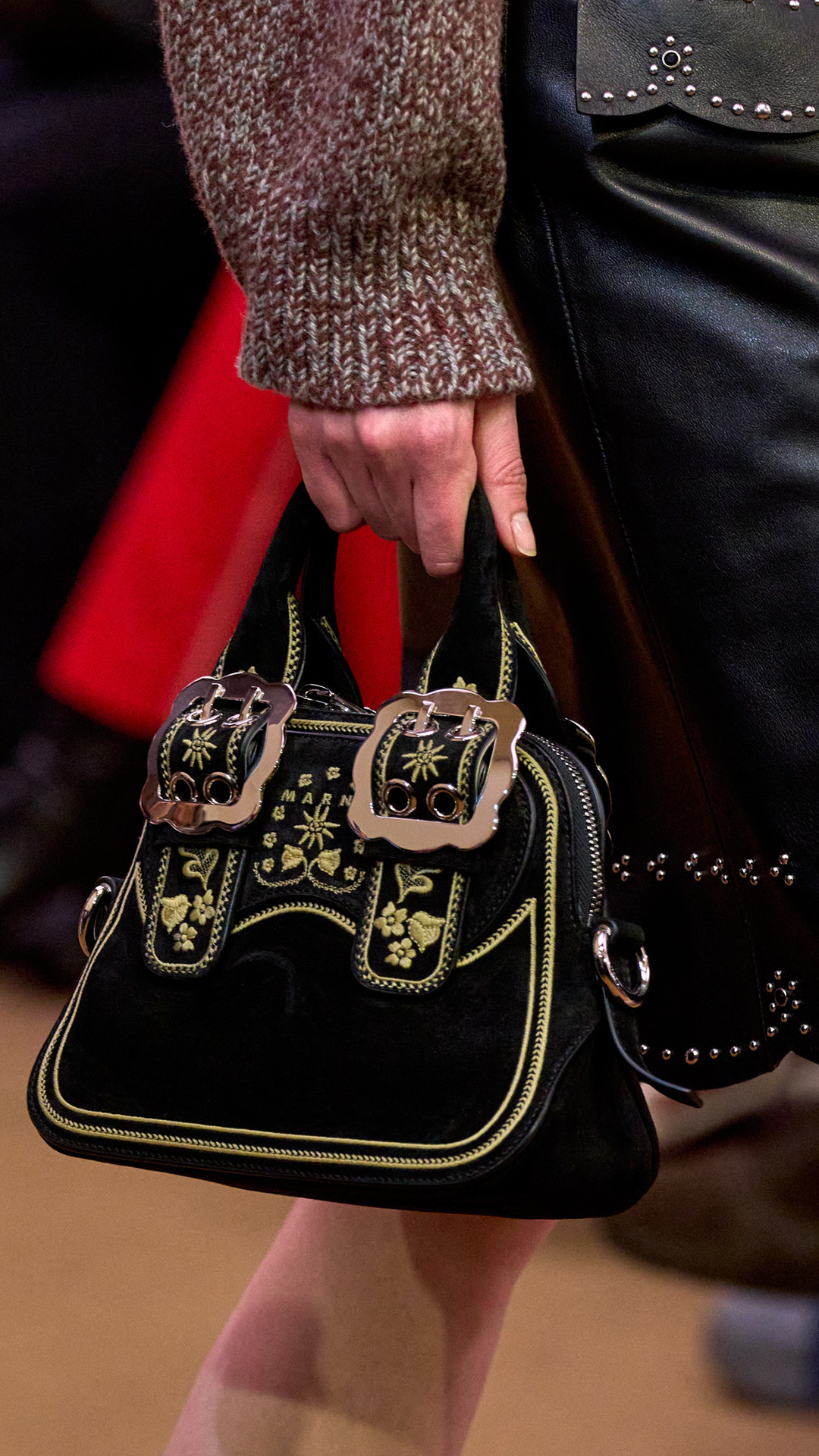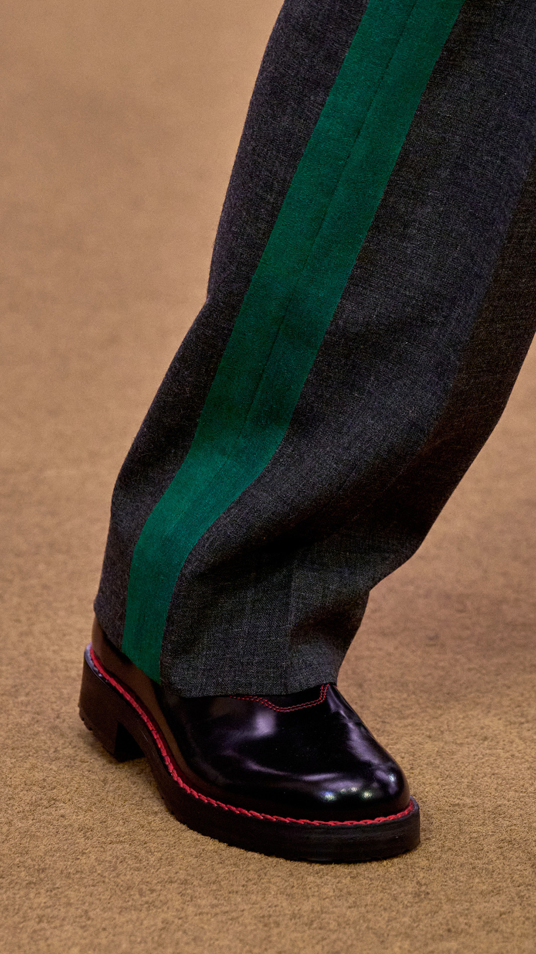フスベットサンダルや、トランクバッグなどのアイコニックなシンボルも、カウパターンやグリーン、オレンジなど鮮やかなパレットとモダンなフォルムでアップデートされて登場。レースアップやカラフルなステッチが施されたシューズや大ぶりのアクセサリーも、日常に宿る個性的なエレガンスを描き出している。