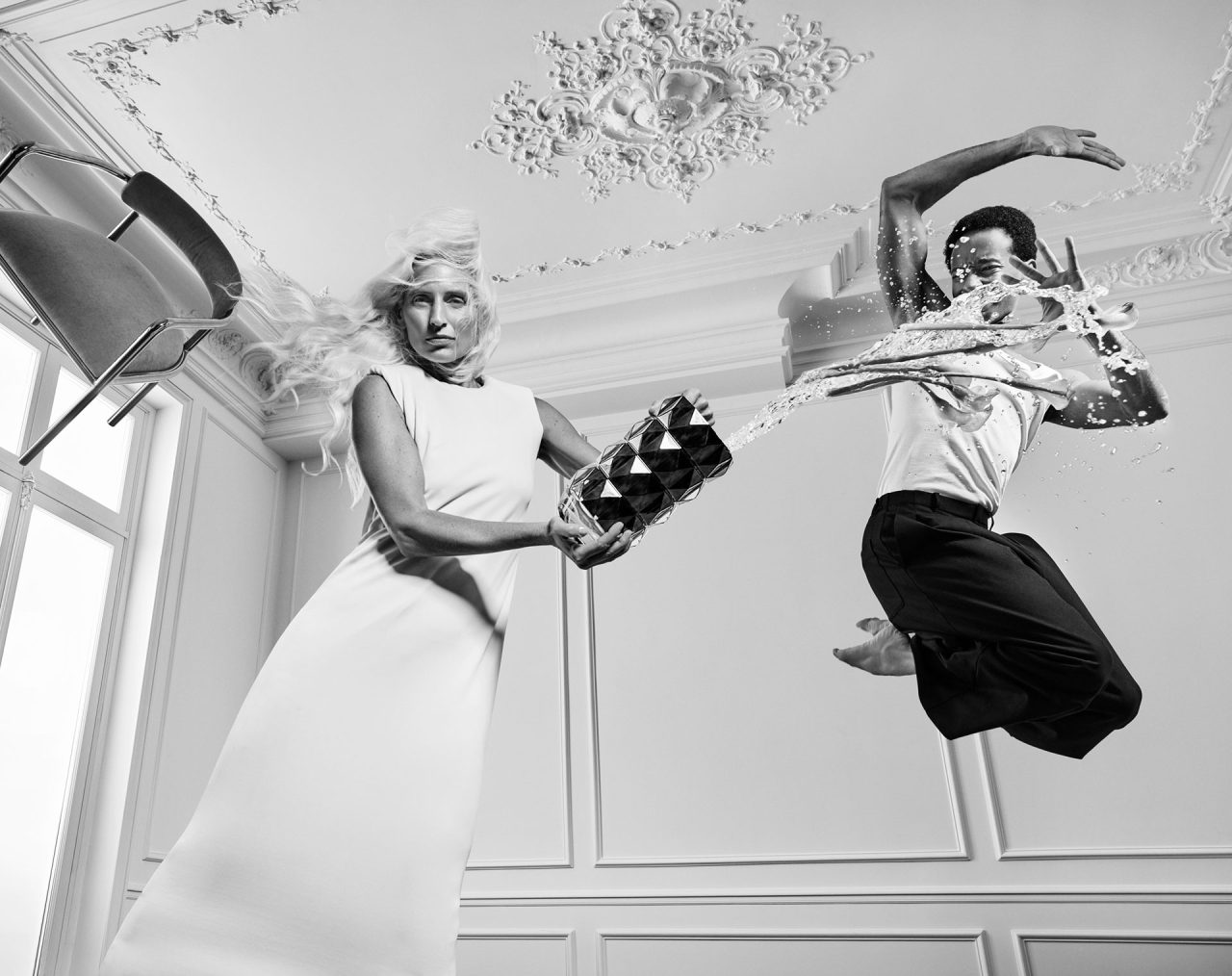 モノクロでミニマルな空間で「ダンス」を捉えたキャンペーンでは、ドラマティックかつ繊細なジェスチャーが、職人たちの緻密な所作を想起させる。さらに、パフォーマーの動きは感情の揺らぎまでも鮮やかに描き出す。クリスタルの輝きに包まれ、ゼニス シャンデリア ペンダントとともに舞う姿や、アルクール グラスのファセットに視線を奪われる一瞬の表情や動きが、美に魅了される歓びをピュアに映し出す。