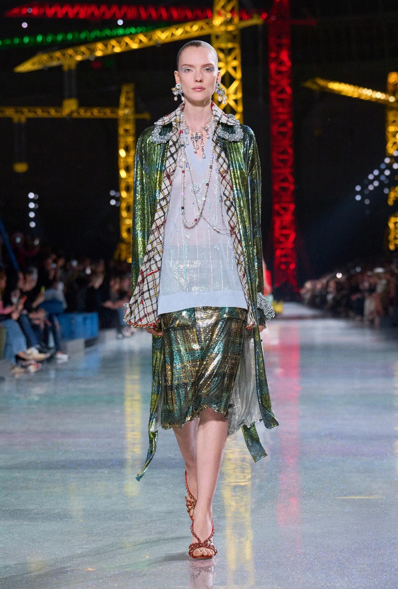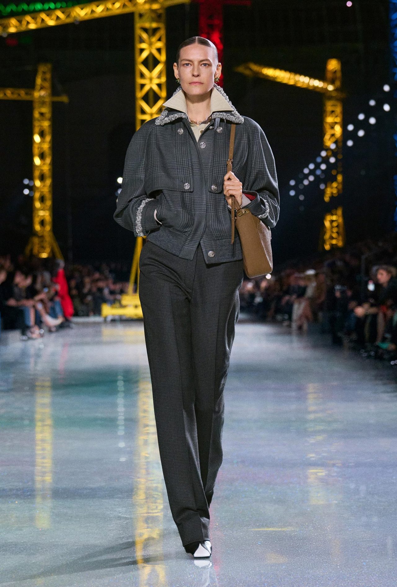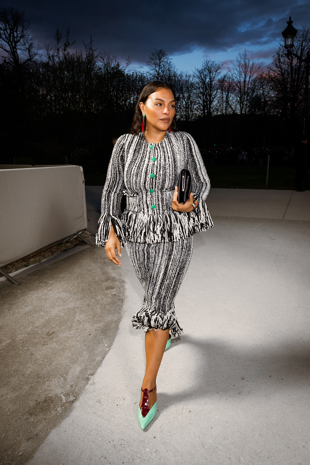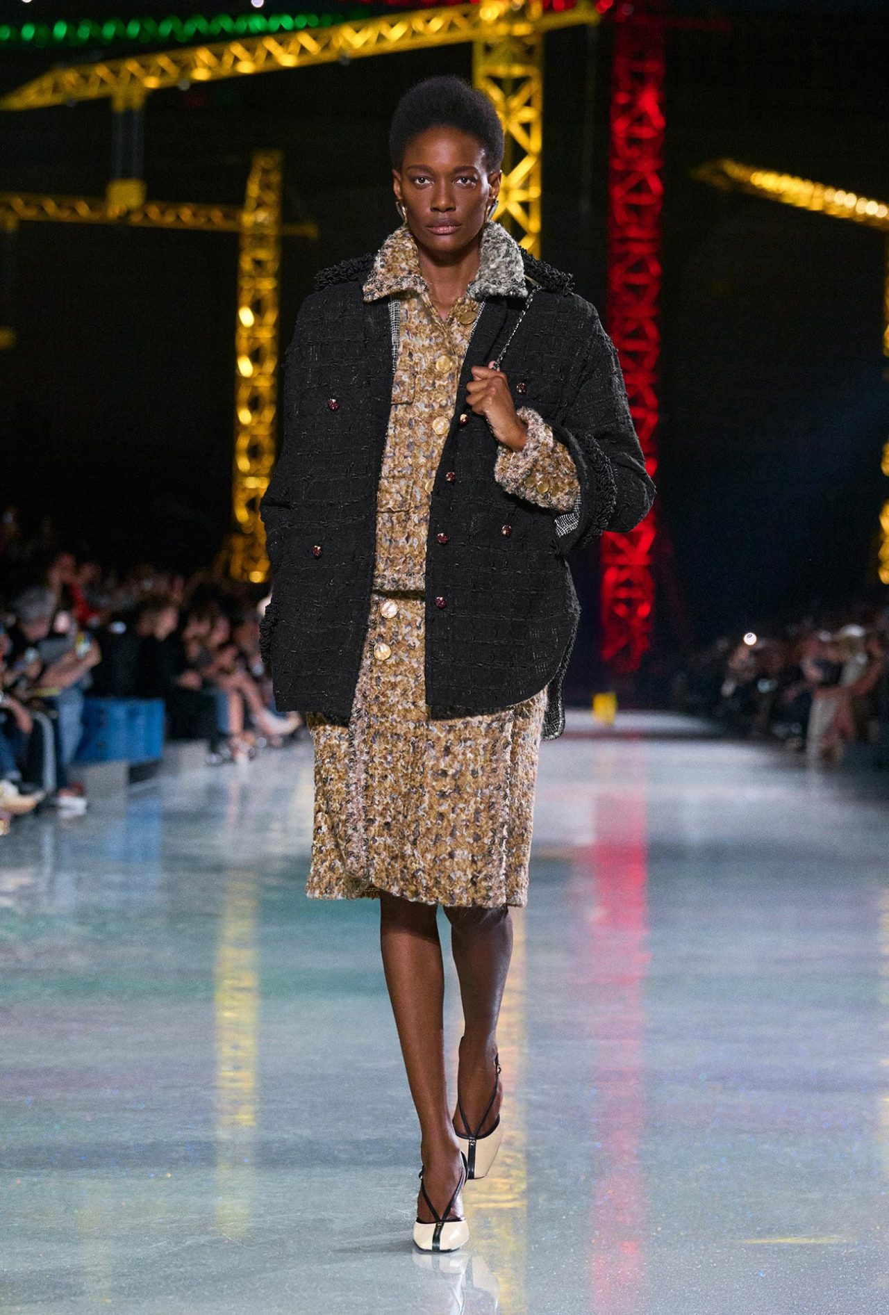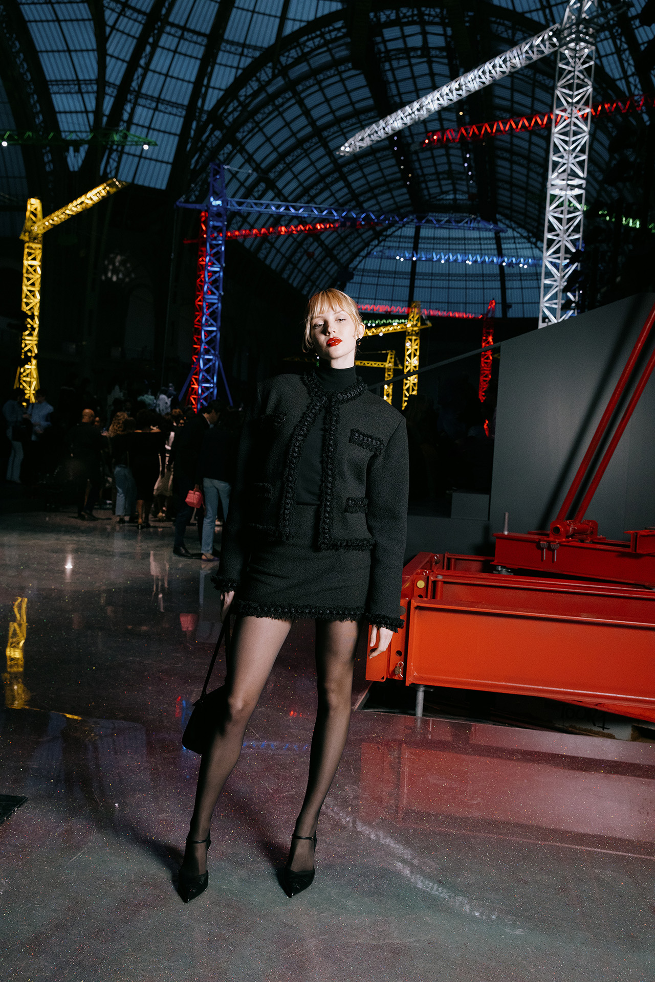 会場となった Grand Palais (グラン・パレ) には、カラフルにライトアップされたクレーンが連なり、建築現場を彷彿とさせながらも幻想的な空間が広がった。コレクションで Matthieu Blazy が意識したのは、創業者 Gabriel Chanel (ガブリエル・シャネル) の「ファッションは毛虫であり、蝶でもある。昼は毛虫、夜は蝶になりなさい。」という言葉。1920年代から現代までを横断しながら、朝と夜、夢想と実用のあわいを軽やかに行き来するルックが披露された。