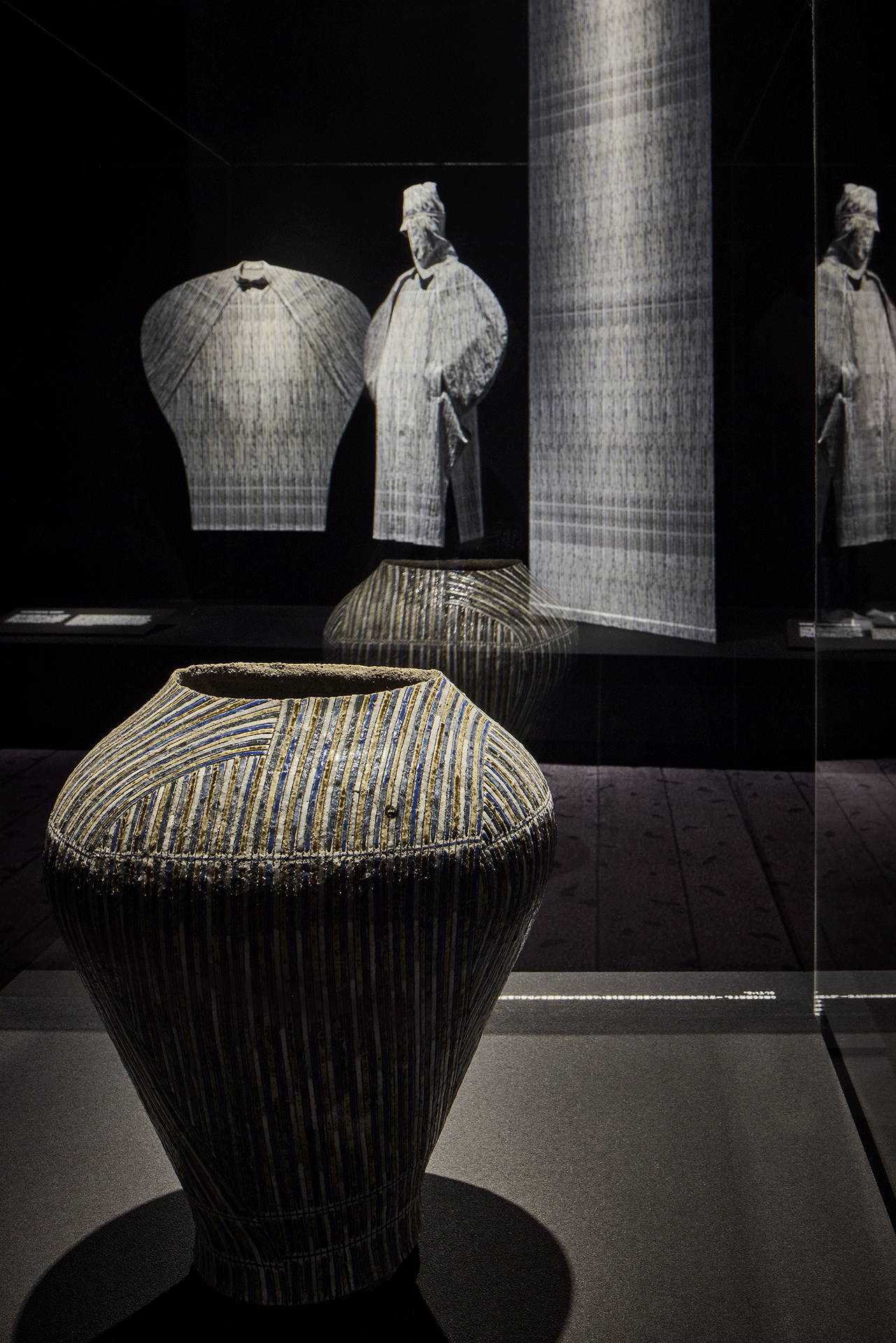 ISSEY MIYAKE KYOTO の中庭に設けた古い蔵をギャラリーとして再生させた KURA では、KURA 展「ELEMENTS」が開催中。加守田が行った工程の反復や大胆かつ繊細な仕上げを衣服づくりの手法で具現化したシリーズを紹介している。時代・文化を超え、陶器を一枚の布に写し取って生まれた、新たな衣服表現。そして偉大な陶芸家のどこまでも自由で前向きなものづくりと、芸術に惹かれる人々のつながり。コレクションが立ち上がるまでの軌跡とともに、その無限の可能性をぜひ会場で体感してほしい。