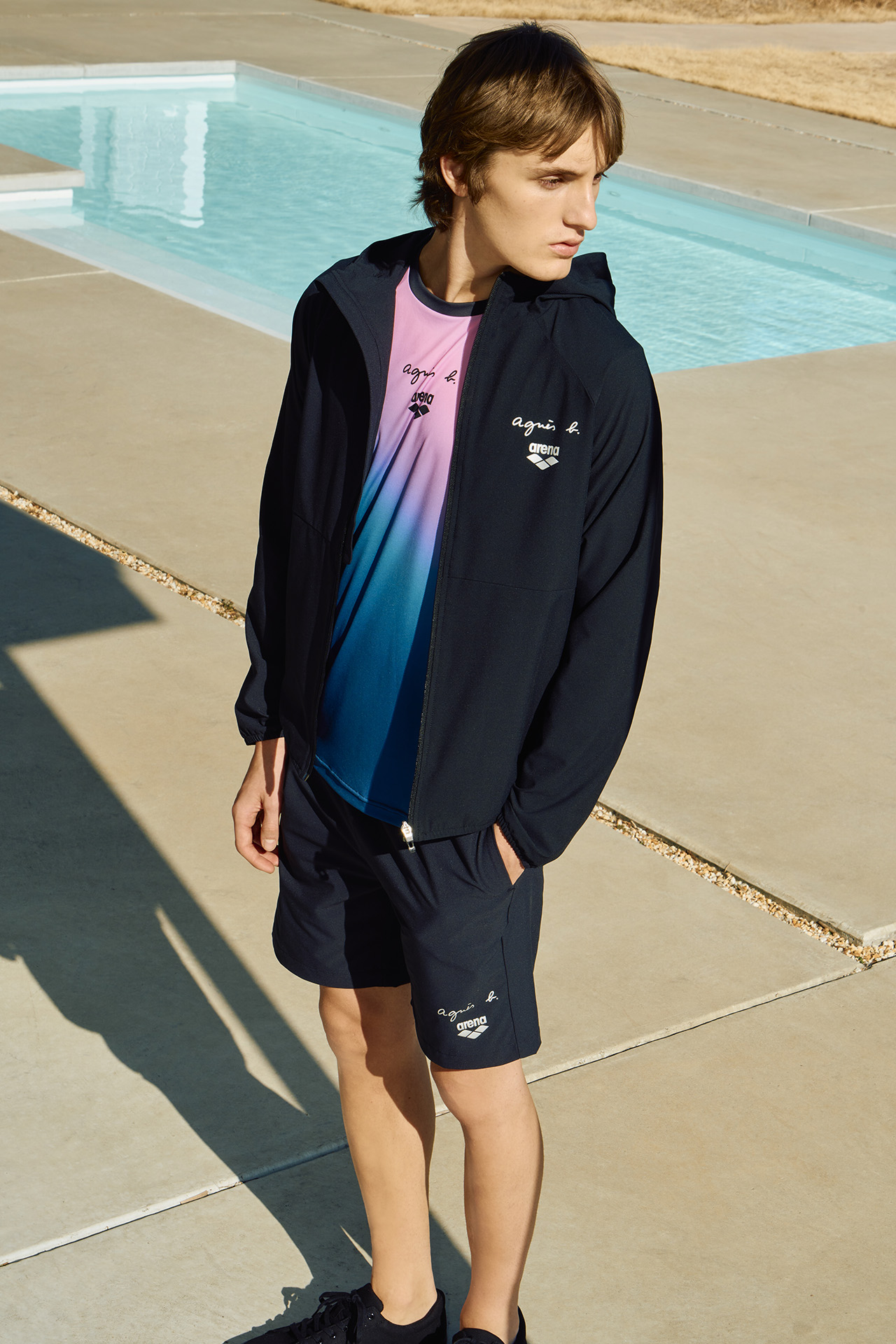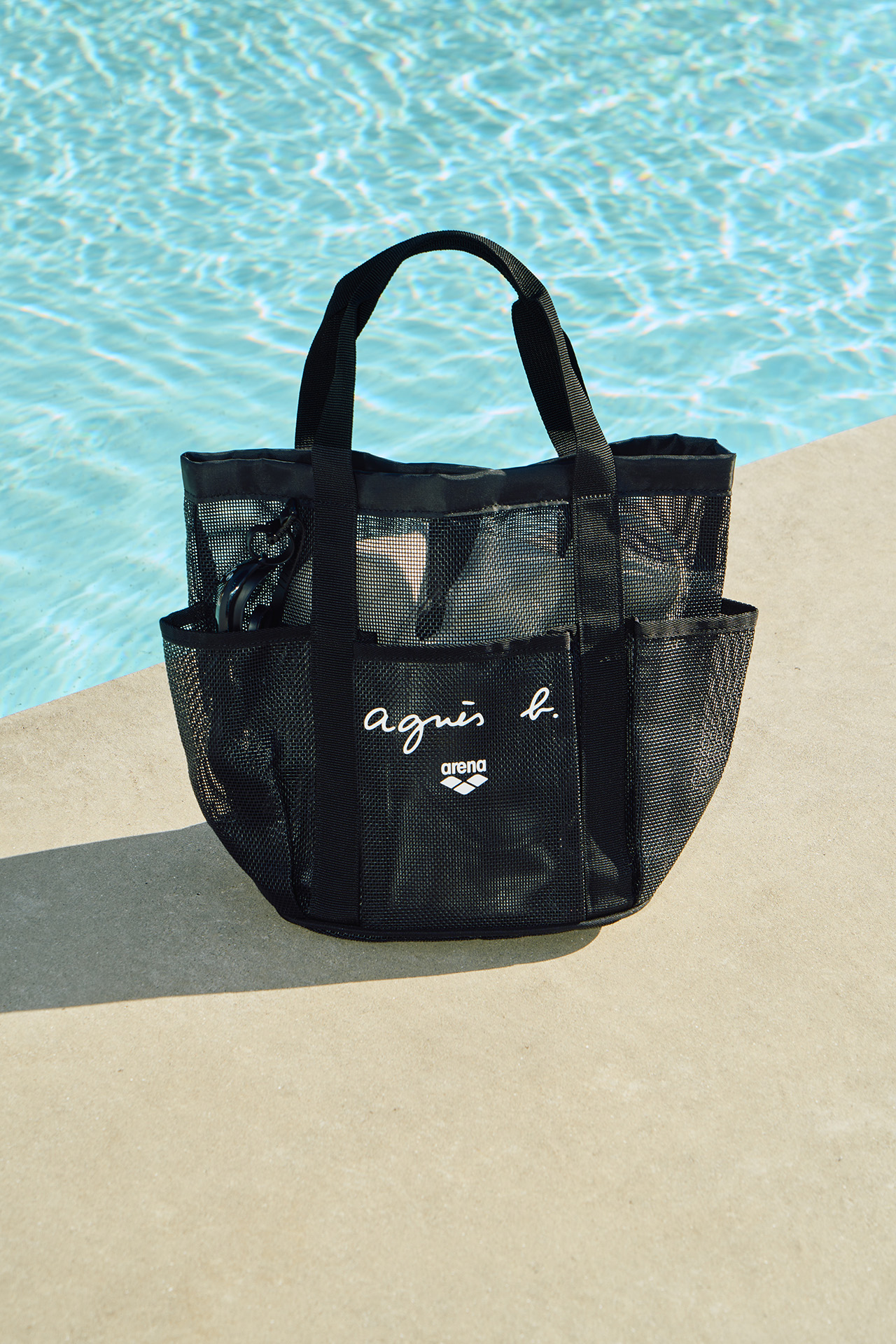 また、優れた耐久性でエクササイズ向けの水着や、プールサイドで羽織れる T シャツ、ジャケットは、 agnès b. と arena のブランドロゴをさりげないアクセントに添えて登場。さらに、メッシュや防水素材のバッグや、夏の日差しを防ぐハットもロゴをあしらってラインナップ。水辺でのひとときを、より快適で特別な時間に演出してくれる。